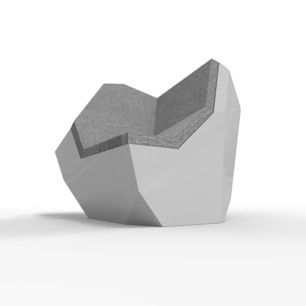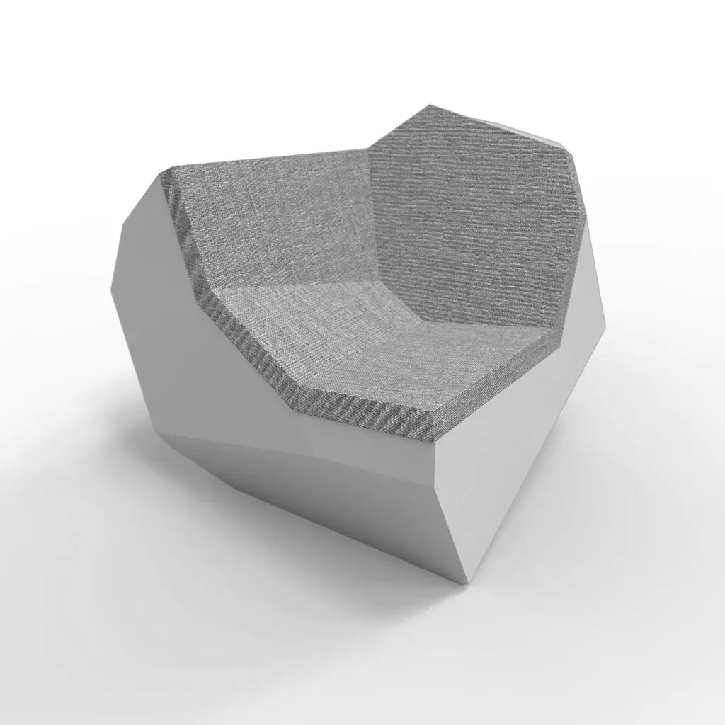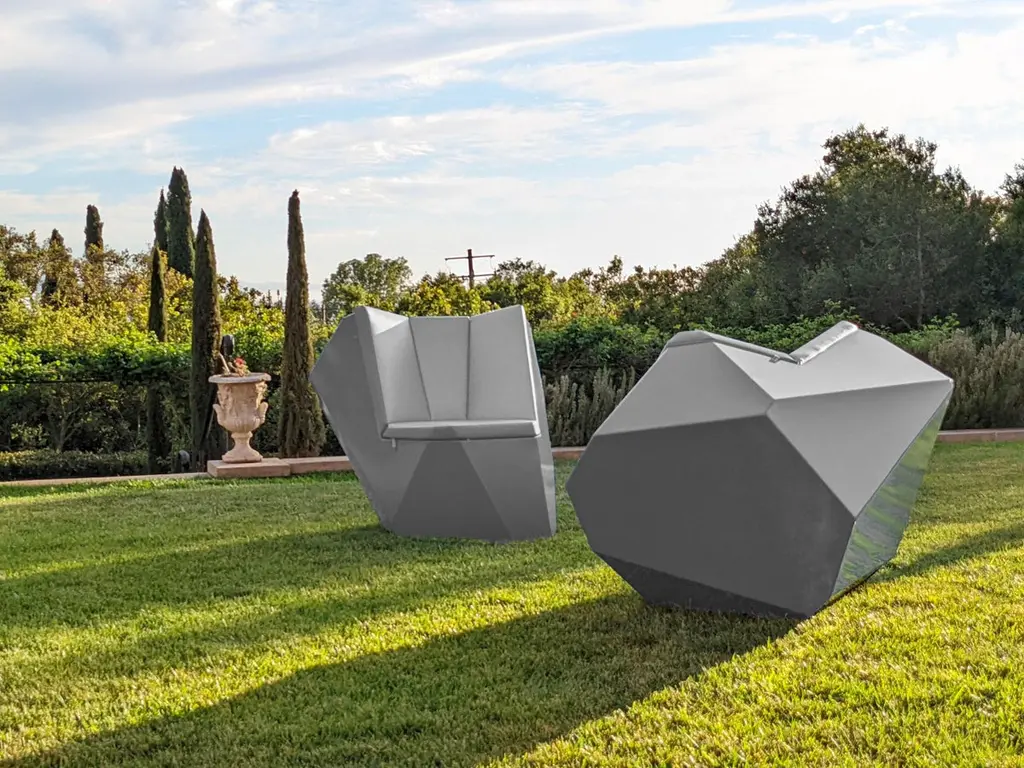 It is an armchair,in alluminium, for outside..with 4 different seats inside,you just have to roll it, and you will find a seat, higher, a lower, a deeper and a more sporty one, all together,one for each face of the stone!Similar, but different, like the guests of a party, gathered in the garden!