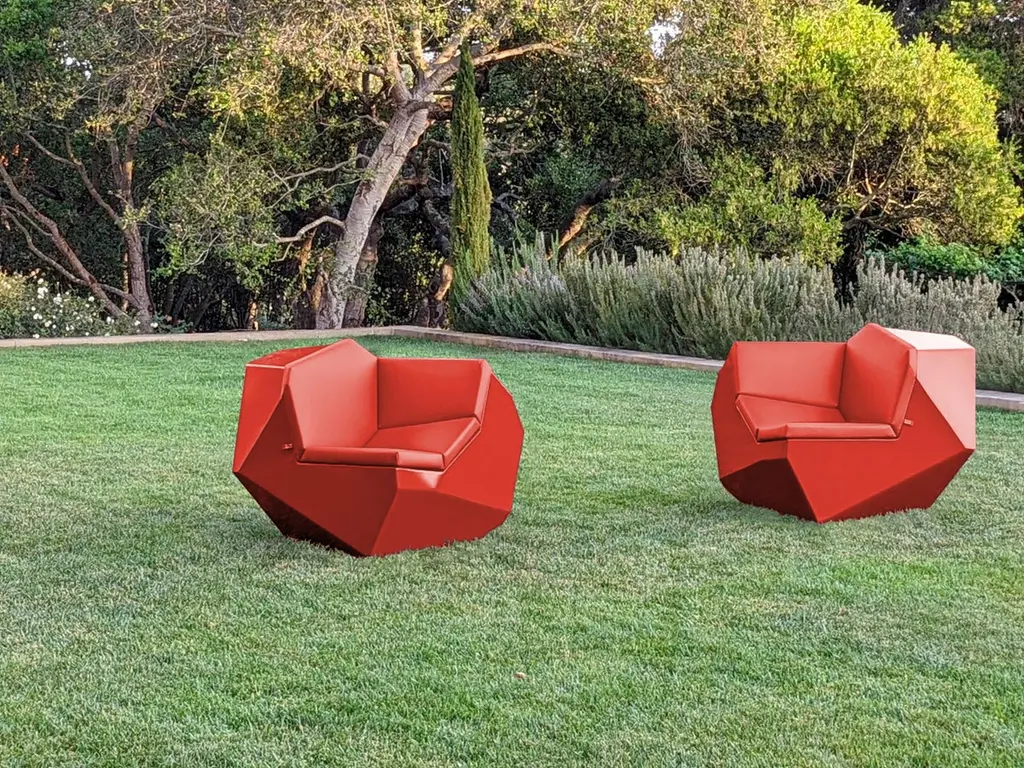 It is an armchair,in Aluminium, for outside.with 4 different seats inside,you just have to roll it, and you will find a seat, higher, a lower, a deeper and a more sporty one, all together,one for each face of the stone!Similar, but different, like the guests of a party, gathered in the garden!