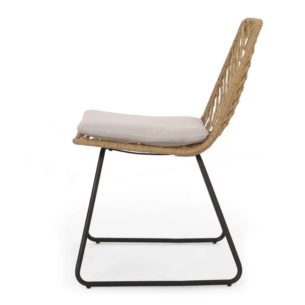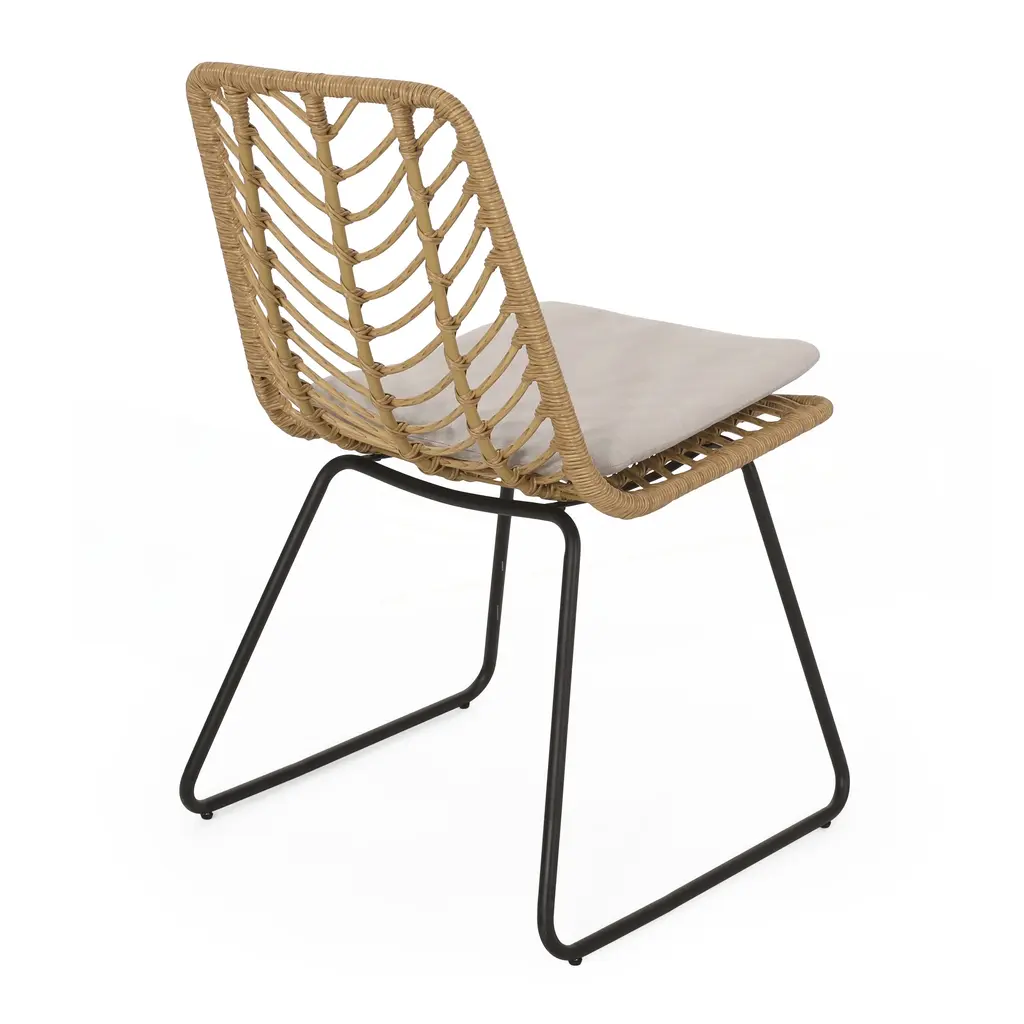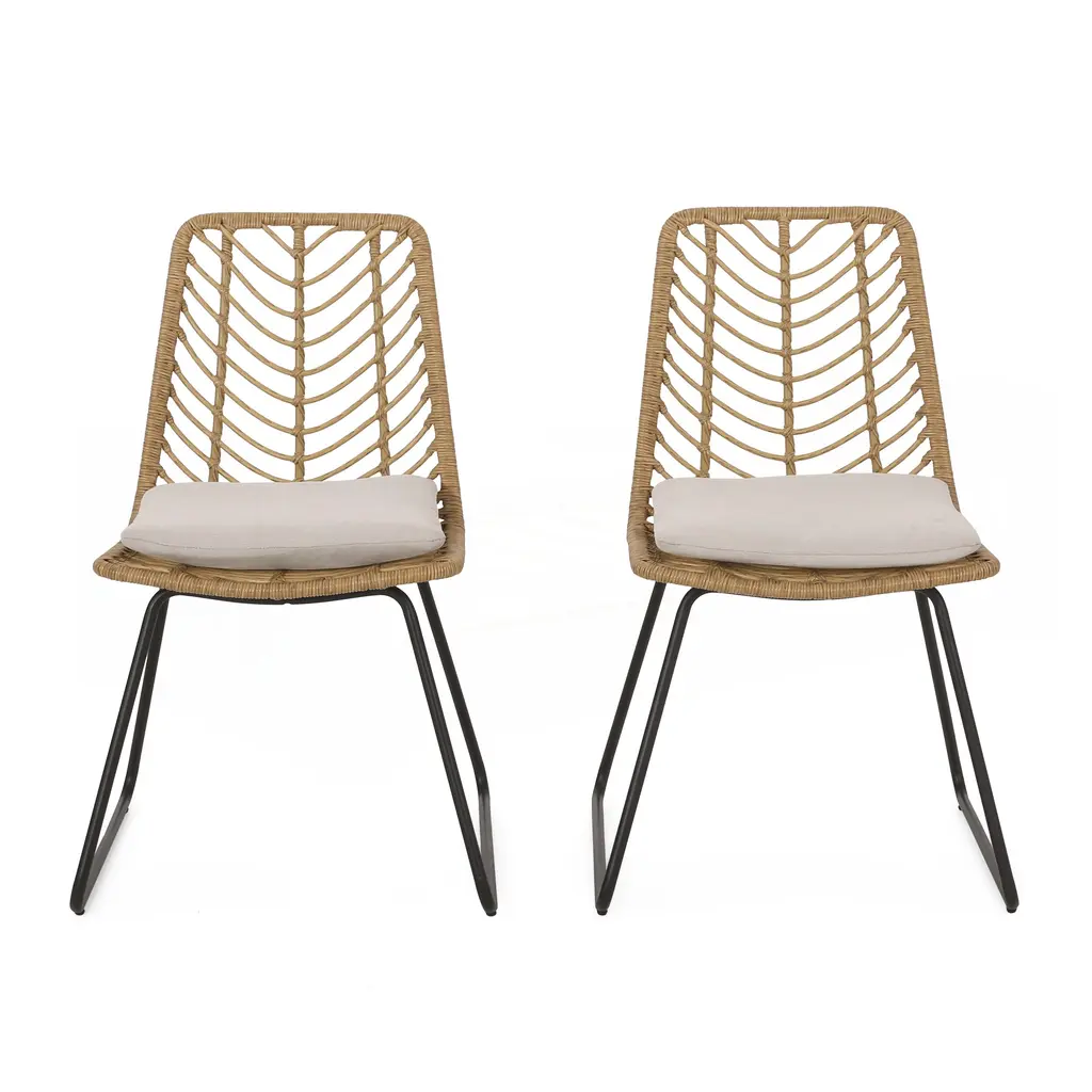 Transitional Rattan Dining Chairs - Timeless Outdoor EleganceKey Features 1. Sophisticated Transitional Design Blends modern minimalism with classic rattan texture for versatile styling Neutral gray finish complements: ✓ Contemporary patios ✓ Coastal-themed decks ✓ Urban balcony gardens Set of 2 chairs creates instant coordinated seating 2. Premium Material Composition Component Specification Frame Powder-coated iron core (rust-proof) Wicker Handwoven polyethylene rattan (UV-resistant) Cushions Water-resistant polyester (spot-clean only) 3. Space-Smart Functionality Compact 20.5"W × 24.2"D footprint fits small spaces 300 lb weight capacity with reinforced leg joints 10-minute assembly per chair (tools included) Technical Highlights Seat Height: 18.5" (standard dining ergonomics) Weight: 9.7 lbs/chair (easy to reposition) Best For: Breakfast nooks, apartment balconies, poolside dining Style Tip: Layer with linen table runners and terracotta planters for Mediterranean flair.Care Instructions Monthly: Brush rattan with soft-bristle attachment Spills: Blot immediately with damp cloth (no harsh cleaners) Storage: Cover during monsoons or store indoors Set Includes 2 rattan dining chairs Assembly hardware + illustrated manual Cushions pre-attached with hook-and-loop fasteners (Note: Natural variations in handwoven texture enhance artisanal charm)