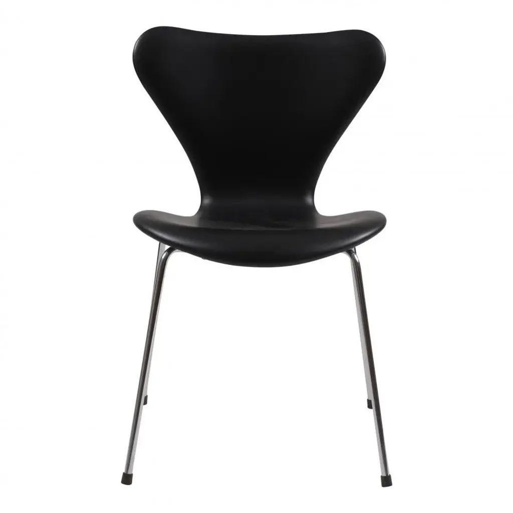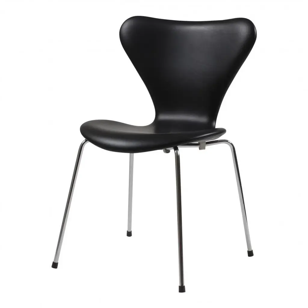 Designer: arne jacobsen. Manufacturer: fritz hansen. Model: seven chair, model 3107. Measurements: h: 78, w: 46,5 d: 42, sh: 44,5/46,5 cm - seat height 46,5 cm is recommended for tables above 73 cm, and sh 44,5 cm is for tables below 73 cm. Leather type: classic black leather. Condition: newly upholstered chair and frame. About the seven chair: these seven chairs are used and are newly upholstered with black classic leather and fitted with a new foam cushion. The chairs are have solid backs and no defects. The chairs are original and manufactured by fritz hansen. The reupholstery is performed with the same methods as fritz hansen. About classic leather: classic leather is a durable leather which has a strong surface protection. This means that the chairs retain their color and that the leather can withstand various stains, in which case you can wipe the leather off with a wet cloth. Classic leather is often used as dining table chairs due to it's ability to resist stains. Stretch marks, insect bites and other natural marks can occur due to the fact that leather is a natural product. This piece has an attribution mark, i am sure that it is completely authentic and take full responsibility for any authenticity issues arising from misattribution
