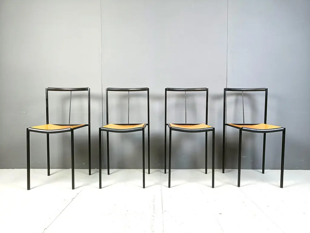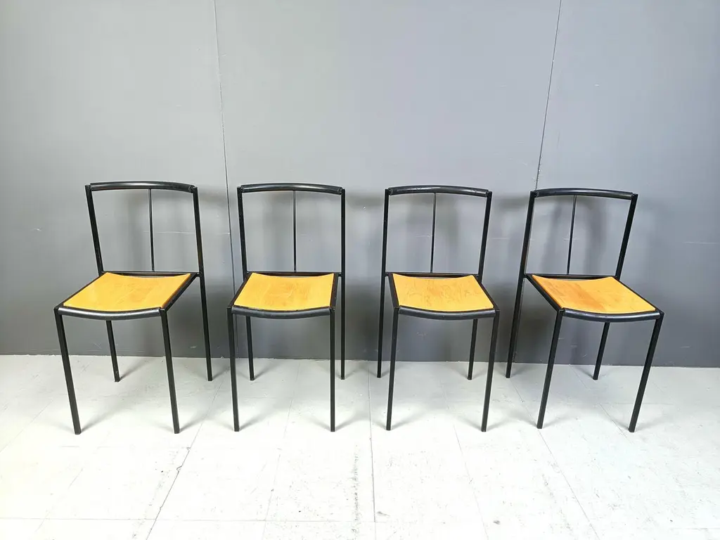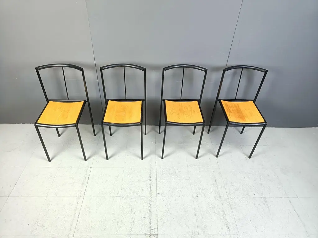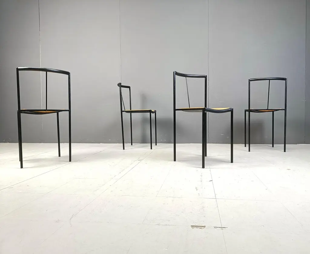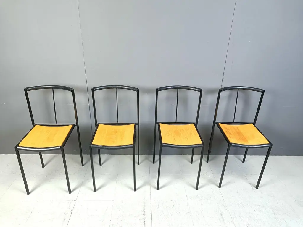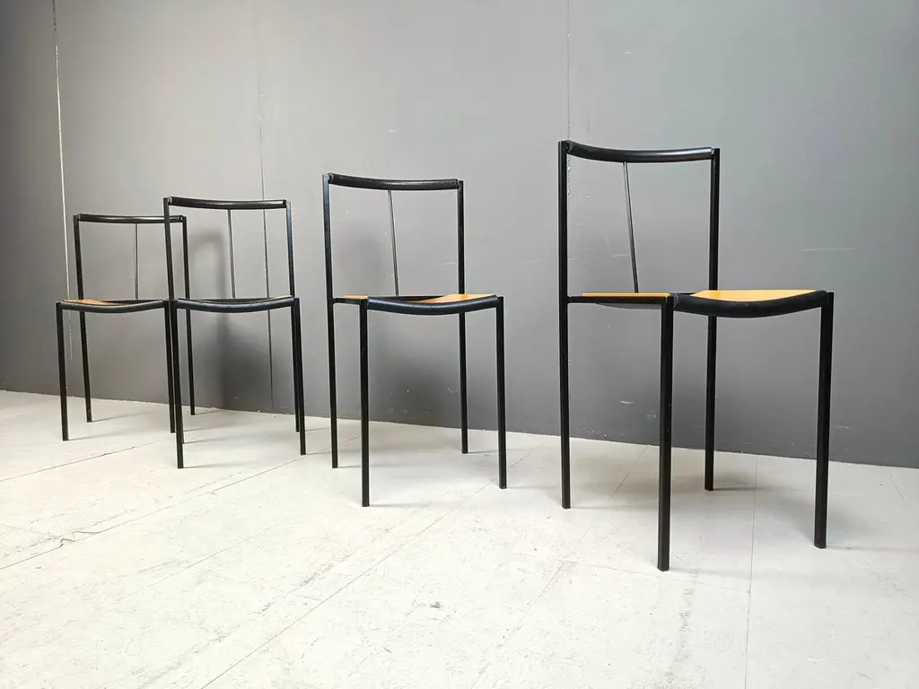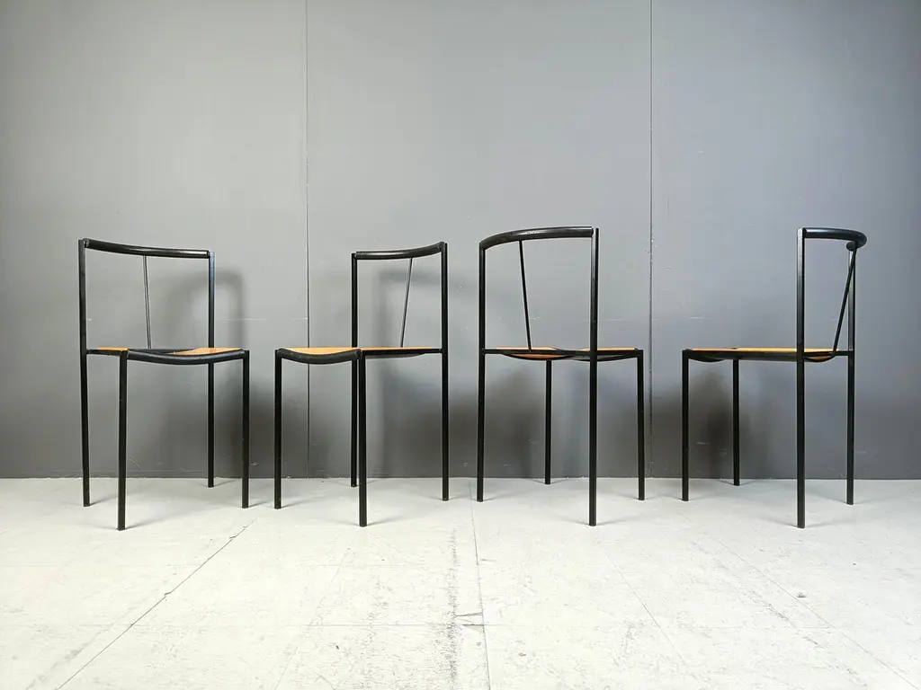 Post modern dining chairs designed by Sergio Calatroni and Maurizio Peregalli in 1985 and produced by Zeus NotoFine black metal frames and wooden seats.1985s - ItalyGood conditionDimensions:Height: 82cmWidth: 40cmDepth: 40cmSeat height: 48cmPrice is for the set.All images are always part of the descriptionRef.: 24110804