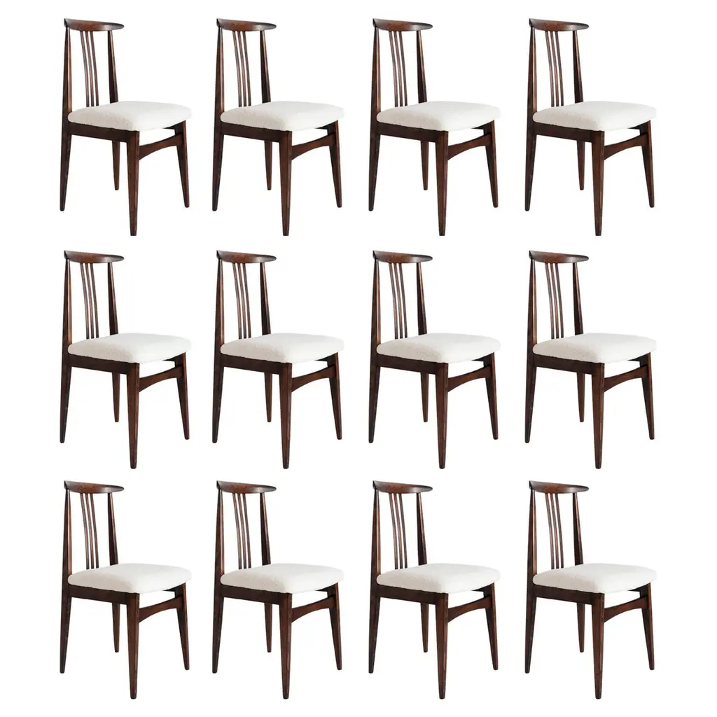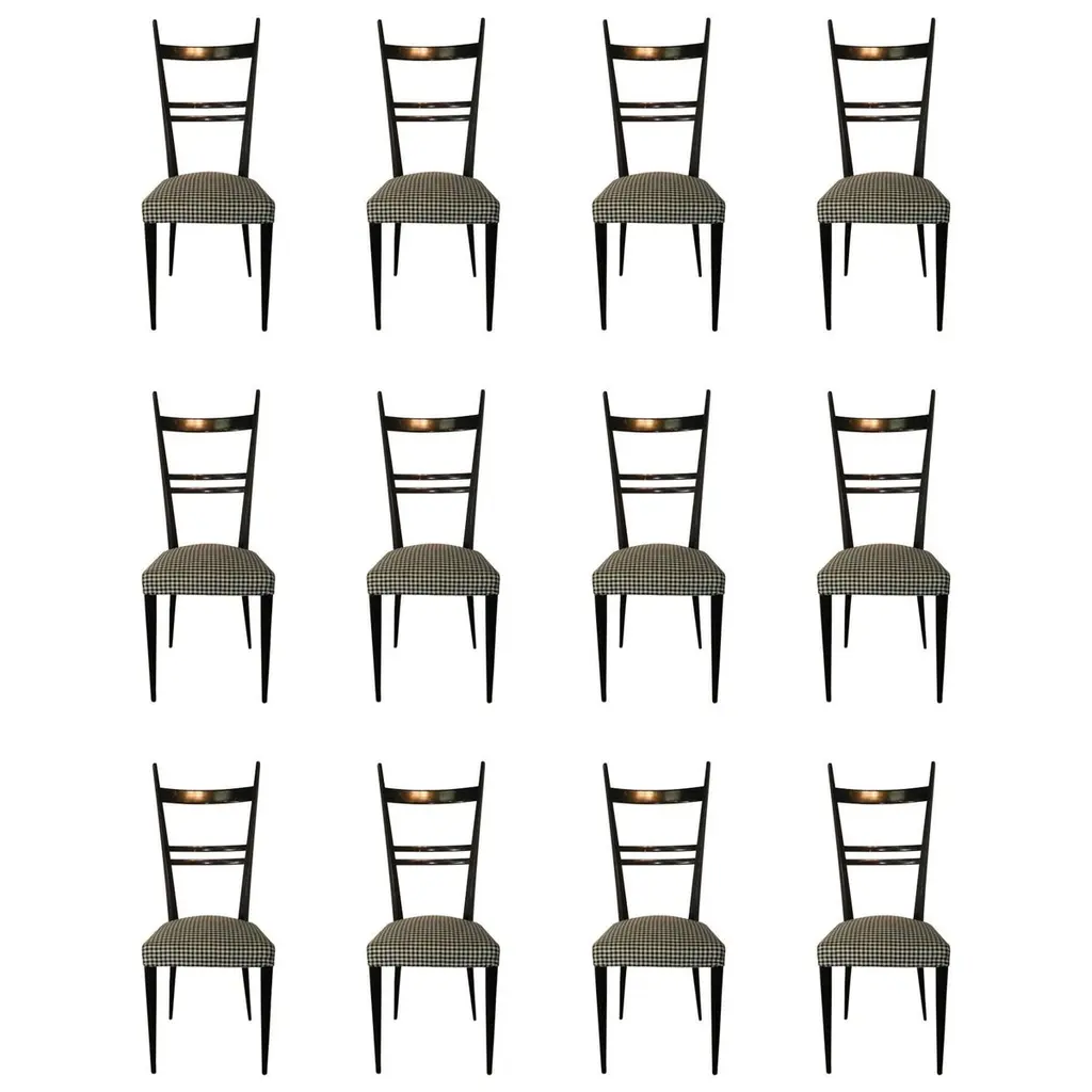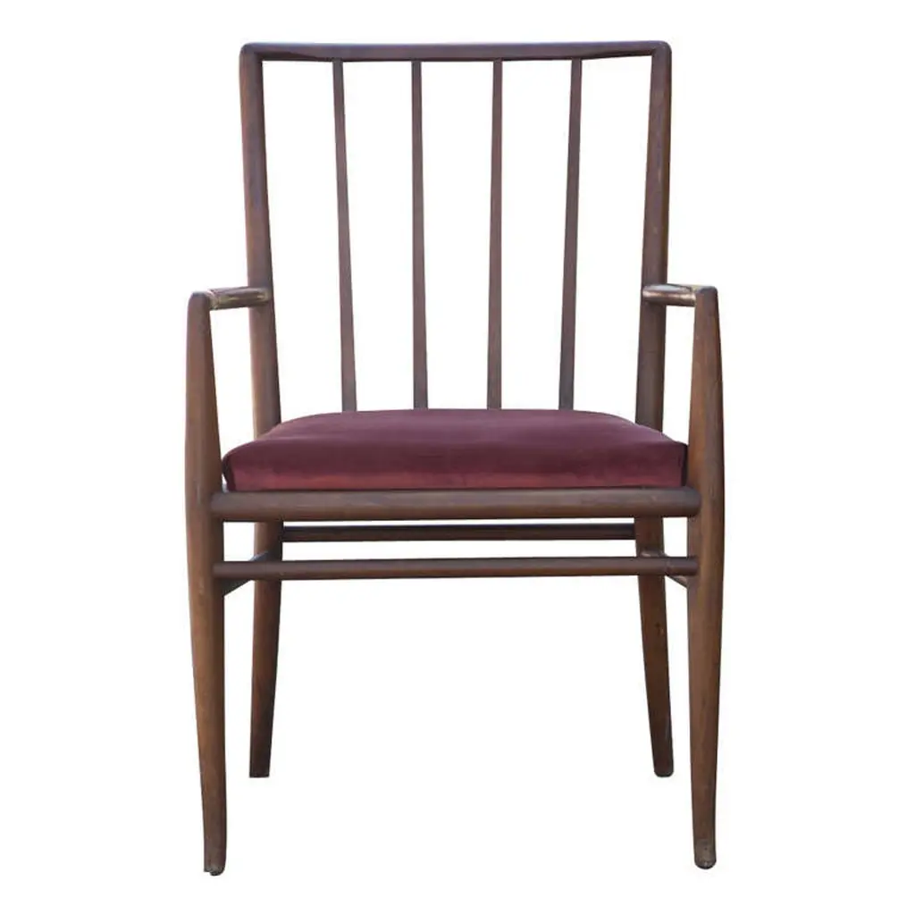 5 dining chairs designed by T.H. Robsjohn Gibbings and made by Widdicomb. 4 side chairs. 1 armchairThe side chairs measure 22" wide, 18" deep, and 34" high.2side chairs with red seats2 with black seats1 Armchair with a red seat