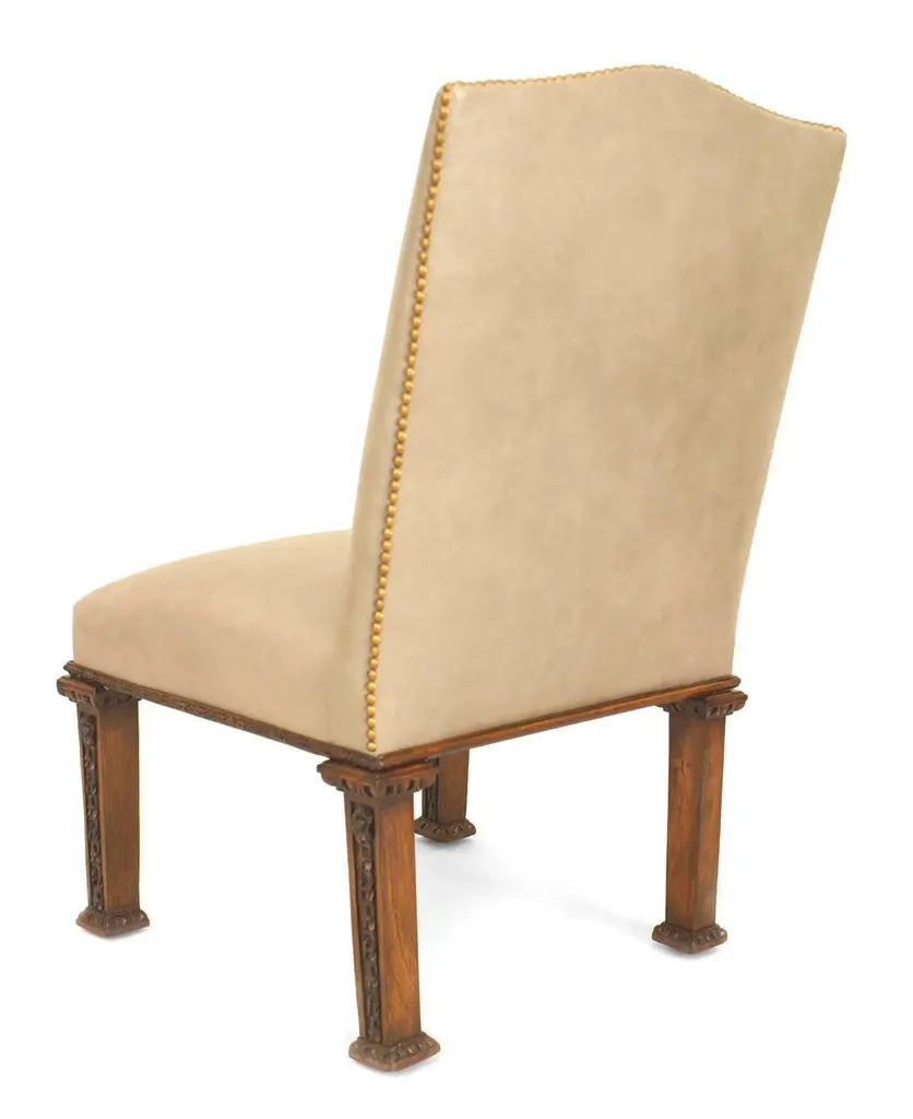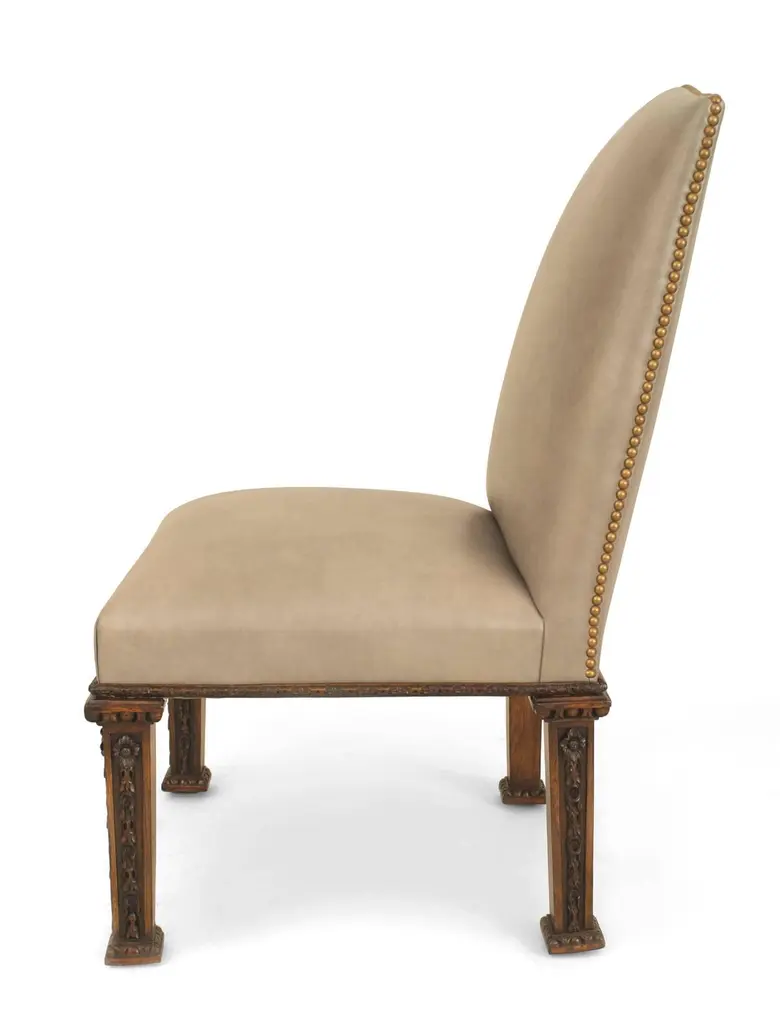 5 English Georgian (18th Cent) dark oak stained side chairs with carved legs and seat edge having a grey leather upholstered seat and shaped back with nail heads. (PRICED EACH)