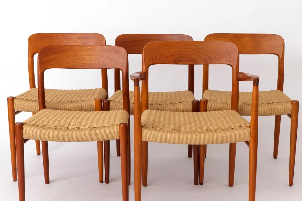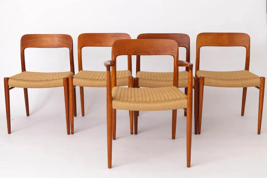 Set of 5 Niels Otto Moller Chairs (1 Armchair + 4 Side Chairs)Model 75 from the 1950s, first designed in 1956Enhance your dining area with this elegant set of five Niels Otto Moller chairs, including one armchair and four side chairs. The listed price is for the complete set. Additionally, two such sets are available upon request.Features:Construction: Each chair features a sturdy teak wood frame, carefully refurbished and oiled to highlight its natural beauty.Upholstery: The seat weaving has been newly reupholstered on all chairs for added comfort and style.Authenticity: Each chair includes the manufacturer's mark under the seat.