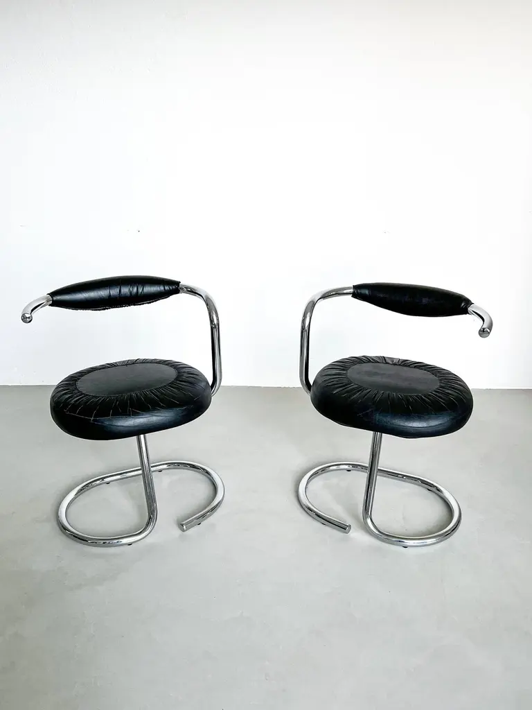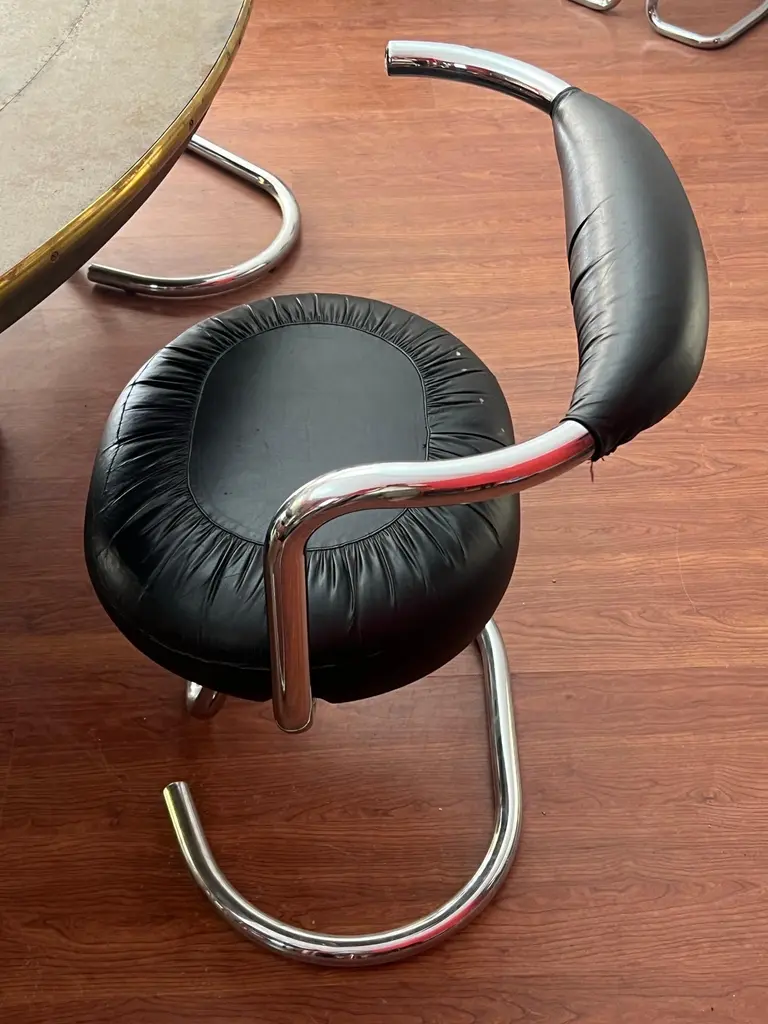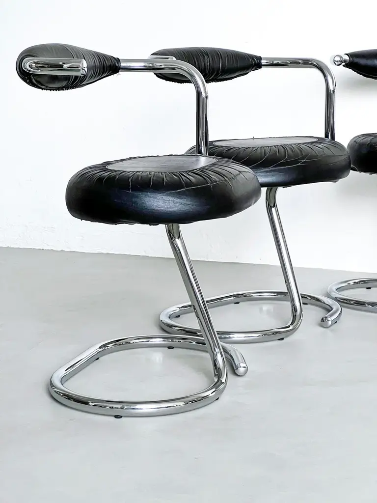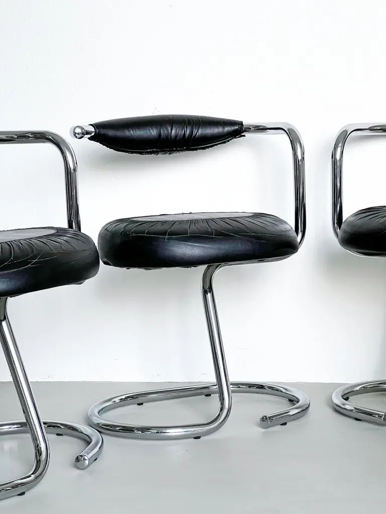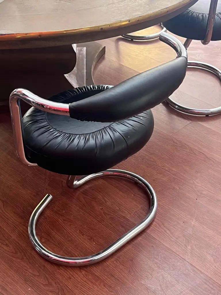 Modern Sculptural Chairs - Dining Chairs - Mid Century Modern - Leather ChairsBorn 1926, Giotto Stoppino was one of the most relevant representative of the Italian Space Age movement. He worked as an architect but, most importantly, as a designer - penning objects and furniture pieces both in coloured plastic and in chromed metal, the most popular materials of the 1970s. His preeminent creations certainly are tables, chairs and lounge chairs in chromed metal, often sinuously shaped and almost organic in their forms. The present chairs, for example, were named "Cobra" ad their frame looks like the elegant Indian snake.A peculiarity of the Cobra chairs was that they could be either "left" or "right", according on the curvature of the leg and backrest. The offered set of six is a perfect match of three plus three chairs, that can be placed alternate around a circular table or matching on the opposite sides of a rectangular one.They are upholstered in the original black leather and are all in good shape. Only one of the six shows some scratches and marks on the leather, which can probably be removed with a nourishing treatment.We have 2 sets availble , check us out at Spinzi Milano !