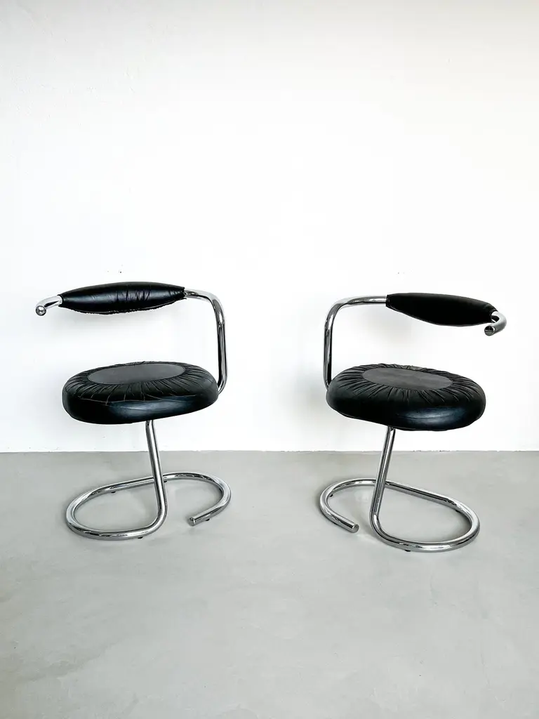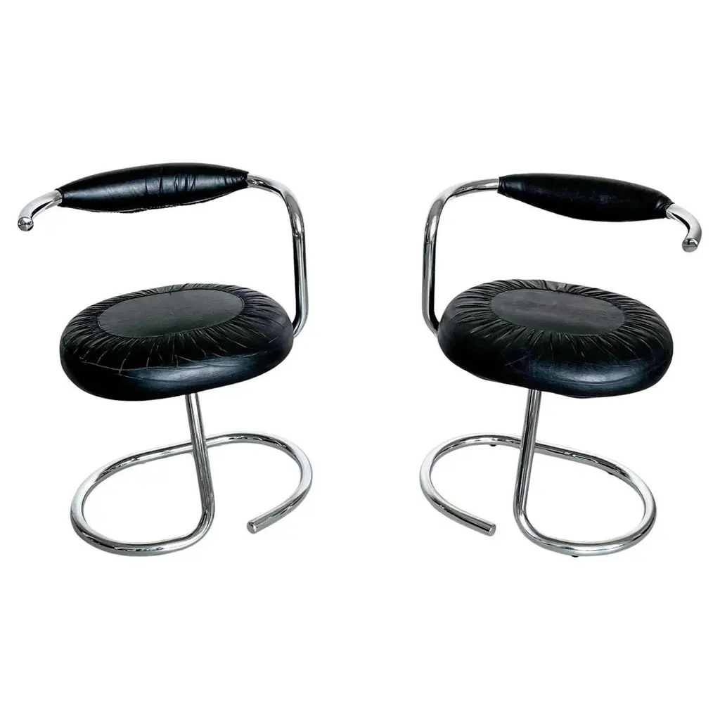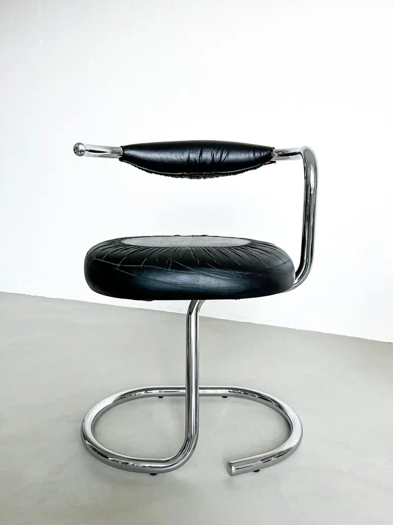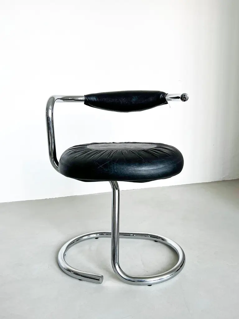Modern Sculptural Chairs - Dining Chairs - Mid Century Modern - Leather ChairsBorn 1926, Giotto Stoppino was one of the most relevant representative of the Italian Space Age movement. He worked as an architect but, most importantly, as a designer - penning objects and furniture pieces both in coloured plastic and in chromed metal, the most popular materials of the 1970s. His preeminent creations certainly are tables, chairs and lounge chairs in chromed metal, often sinuously shaped and almost organic in their forms. The present chairs, for example, were named "Cobra" ad their frame looks like the elegant Indian snake.A peculiarity of the Cobra chairs was that they could be either "left" or "right", according on the curvature of the leg and backrest. The offered set of six is a perfect match of three plus three chairs, that can be placed alternate around a circular table or matching on the opposite sides of a rectangular one.They are upholstered in the original black leather and are all in good shape. Only one of the six shows some scratches and marks on the leather, which can probably be removed with a nourishing treatment.We have 2 sets availble , check us out at Spinzi Milano !