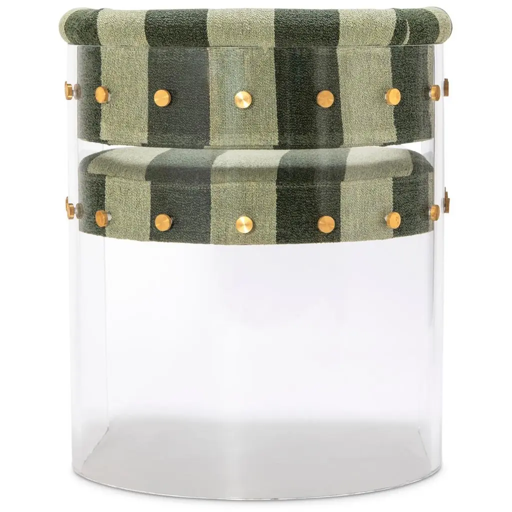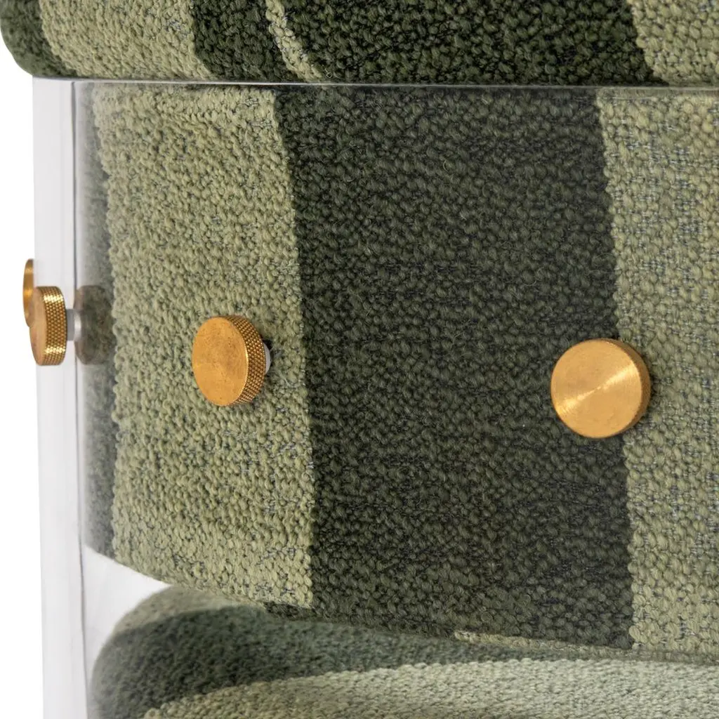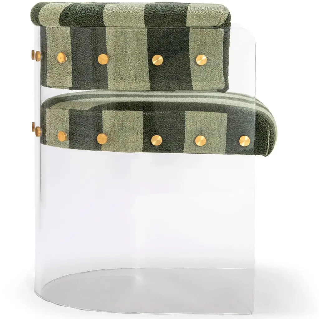 The Anhele Comporta dining chair by Egg Designs brings a 70’s Space Age aesthetic into a modern context, creating a piece that feels both retro-futuristic and distinctly contemporary. Its crystal-clear acrylic (Lucite/Plexiglass) shell creates a floating silhouette, visually light while remaining structurally strong. The seat and backrest are upholstered in a soft striped bouclé, adding texture and subtle pattern to contrast the sleek, transparent frame.Brass bespoke fixings accentuate the joints, adding warmth and refined detailing to the design. This unique blend of materials gives the chair a versatile aesthetic that works equally well in minimal, modern, and mid-century interiors. With its tactile bouclé upholstery, the Anhele chair also evokes a relaxed coastal or resort-inspired mood, perfect for beach homes, poolside settings, or casual dining spaces with a Miami or holiday vibe.Available in a variety of bouclé and upholstery options, this chair is handmade to order by Egg Designs with an 8–10 week lead time. Condition: new.