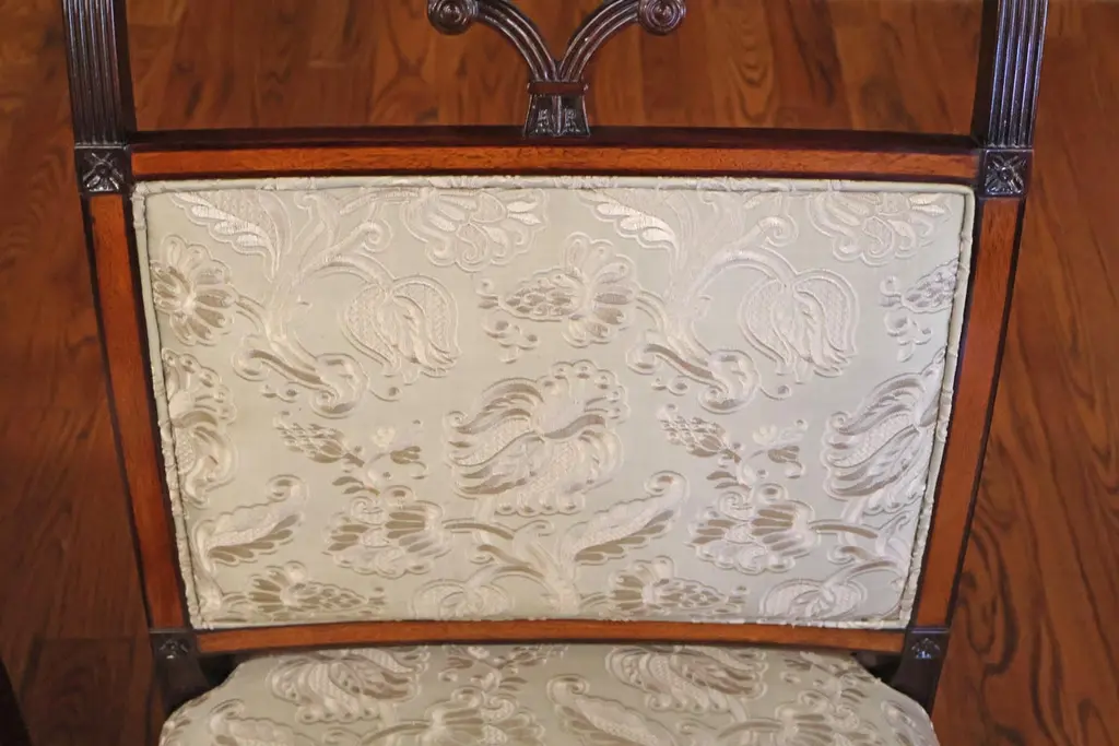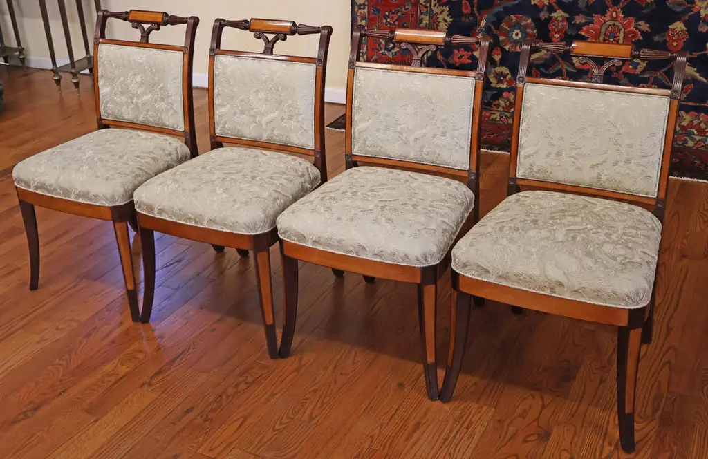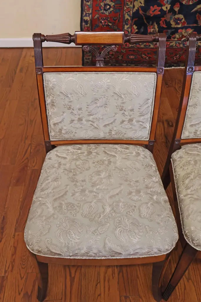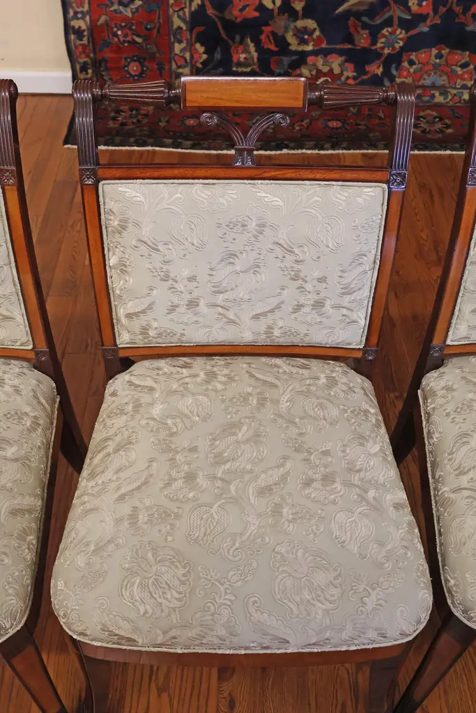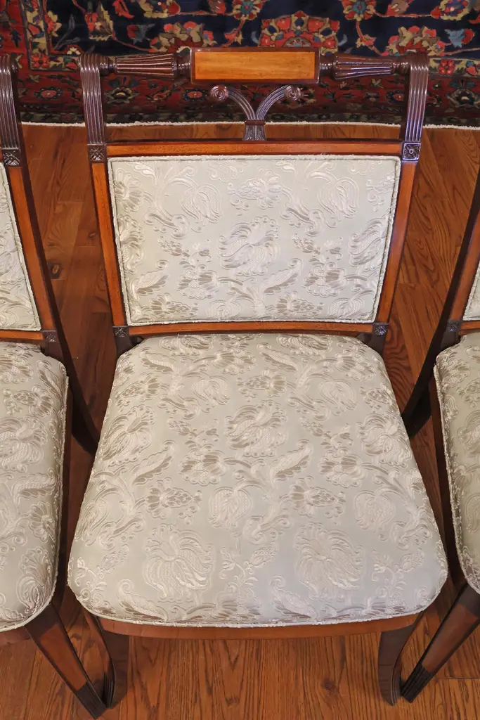 Kindel Winterthur Collection Mahogany And Maple Inlaid Dining ChairsDimensions : 36" Tall X 21" Wide X 21" DeepThis set of rare Kindel Winterthur collection dining chairs are stunning! The are made base on chairs by Thomas Seymour. The mahogany and maple wood grain is incredible! These chairs are well made and the fabric is stunning! The msrp on these chairs are over $6,000 each. They are some of the finest chairs Kindel has ever made!