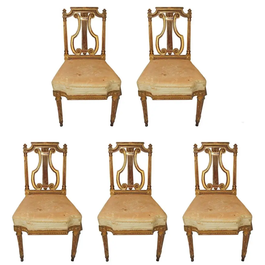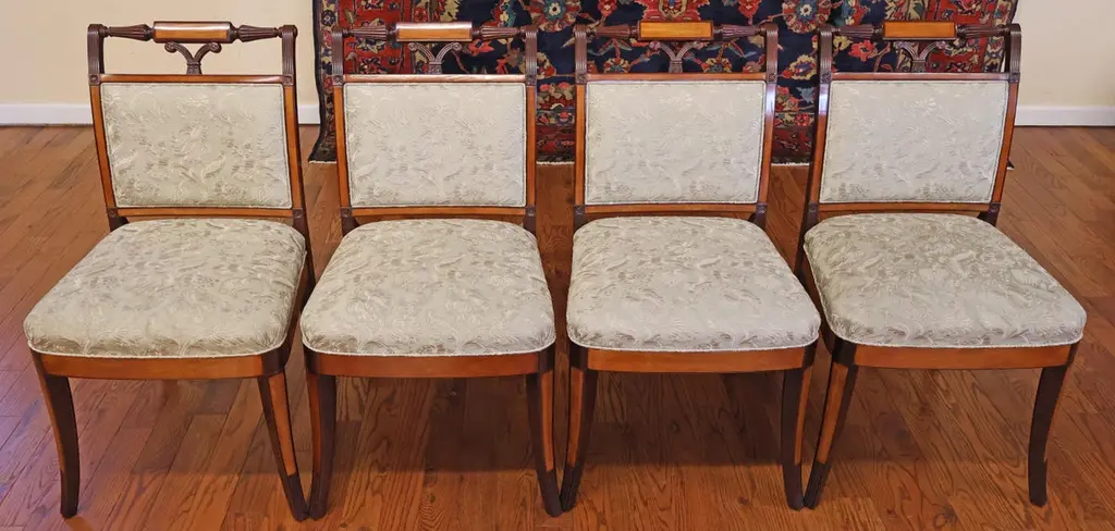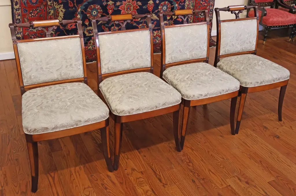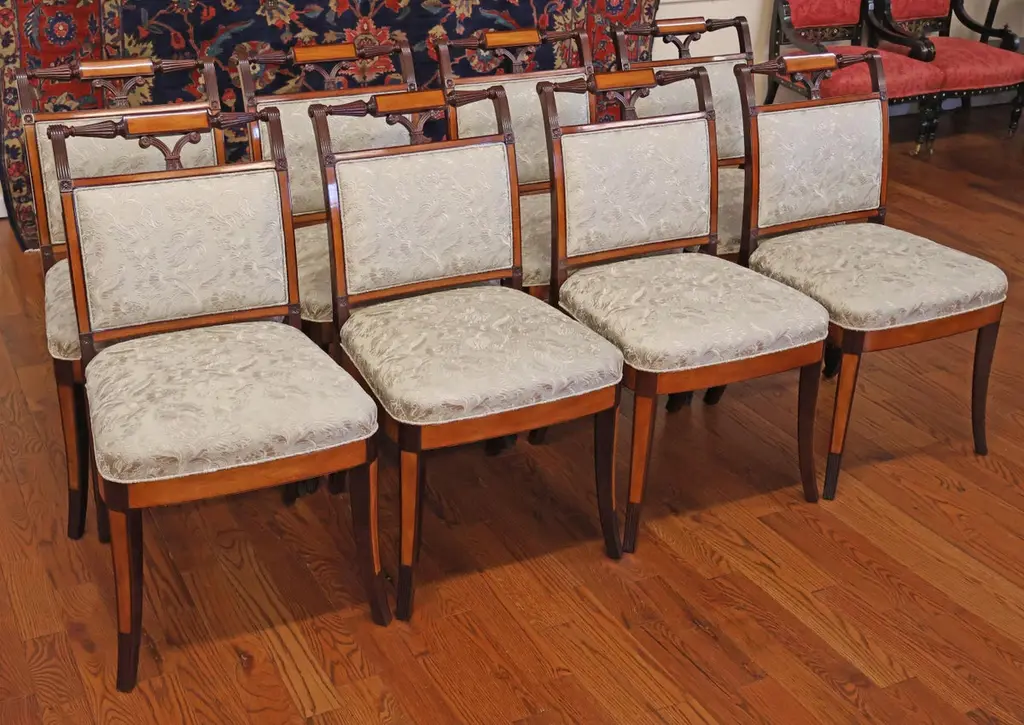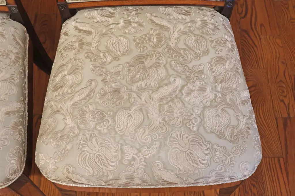 Kindel Winterthur Collection Mahogany And Maple Inlaid Dining ChairsDimensions : 36" Tall X 21" Wide X 21" DeepThis set of rare Kindel Winterthur collection dining chairs are stunning! The are made base on chairs by Thomas Seymour. The mahogany and maple wood grain is incredible! These chairs are well made and the fabric is stunning! The msrp on these chairs are over $6,000 each. They are some of the finest chairs Kindel has ever made!