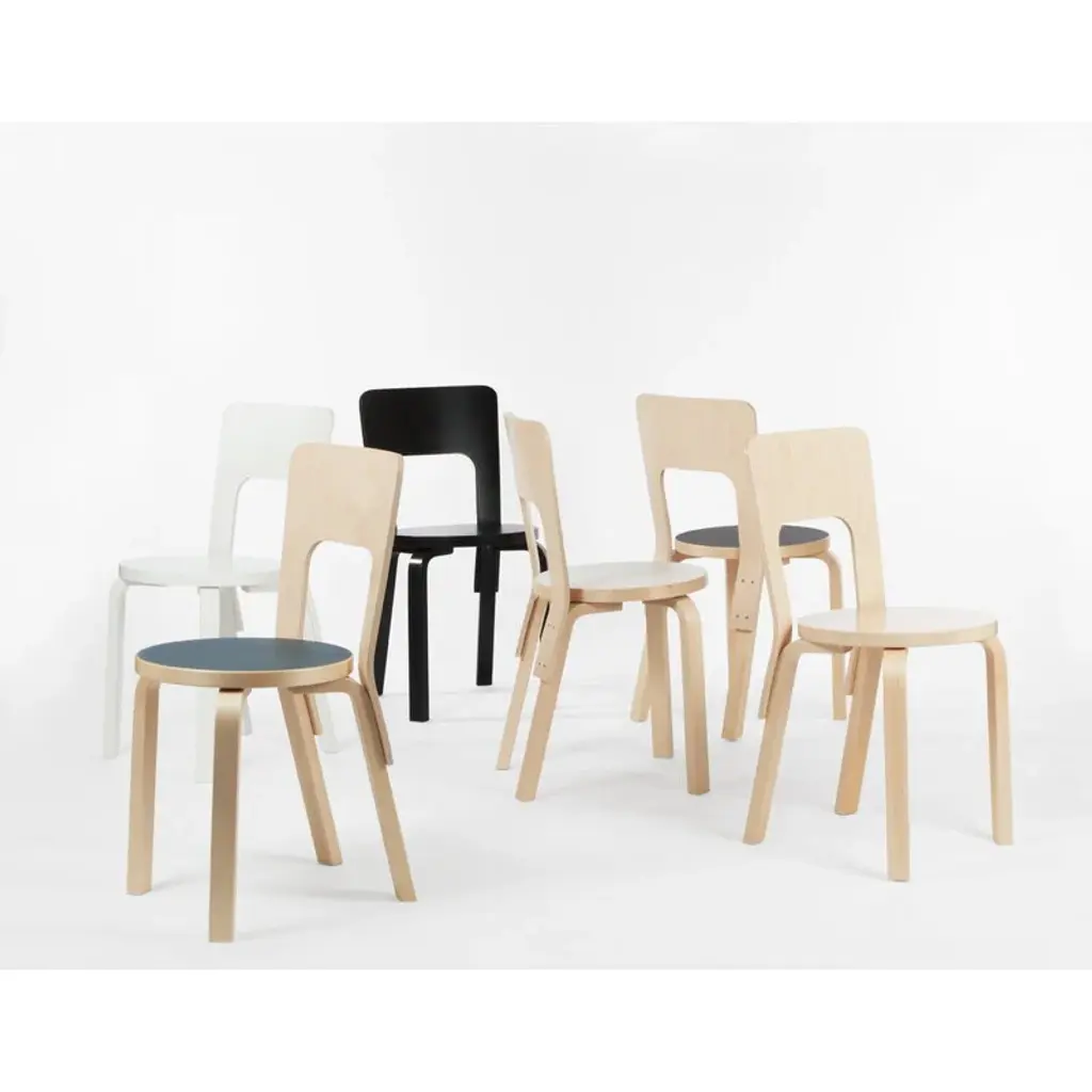 Artek’s Chair 66, designed in 1935, is one of the most popular dining chairs of Alvar Aalto and part of the permanent collection of MoMA, The Museum of Modern Art in New York. The timeless chair features Aalto’s patented L-leg structure, which allows the legs to be attached directly to the round seat. Compared to his other dining chairs, Chair 66 has a higher backrest that makes it comfortable to sit on and gives the design its distinct look.