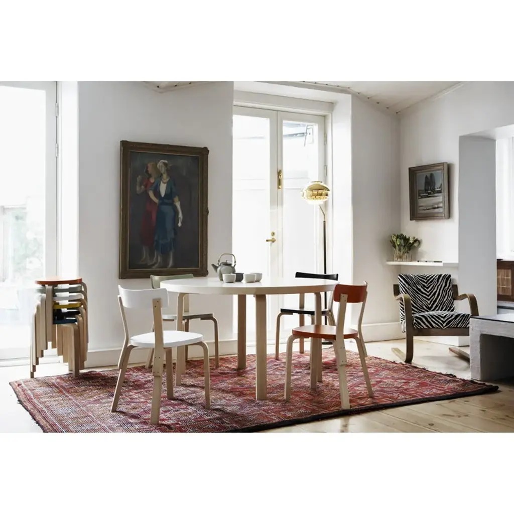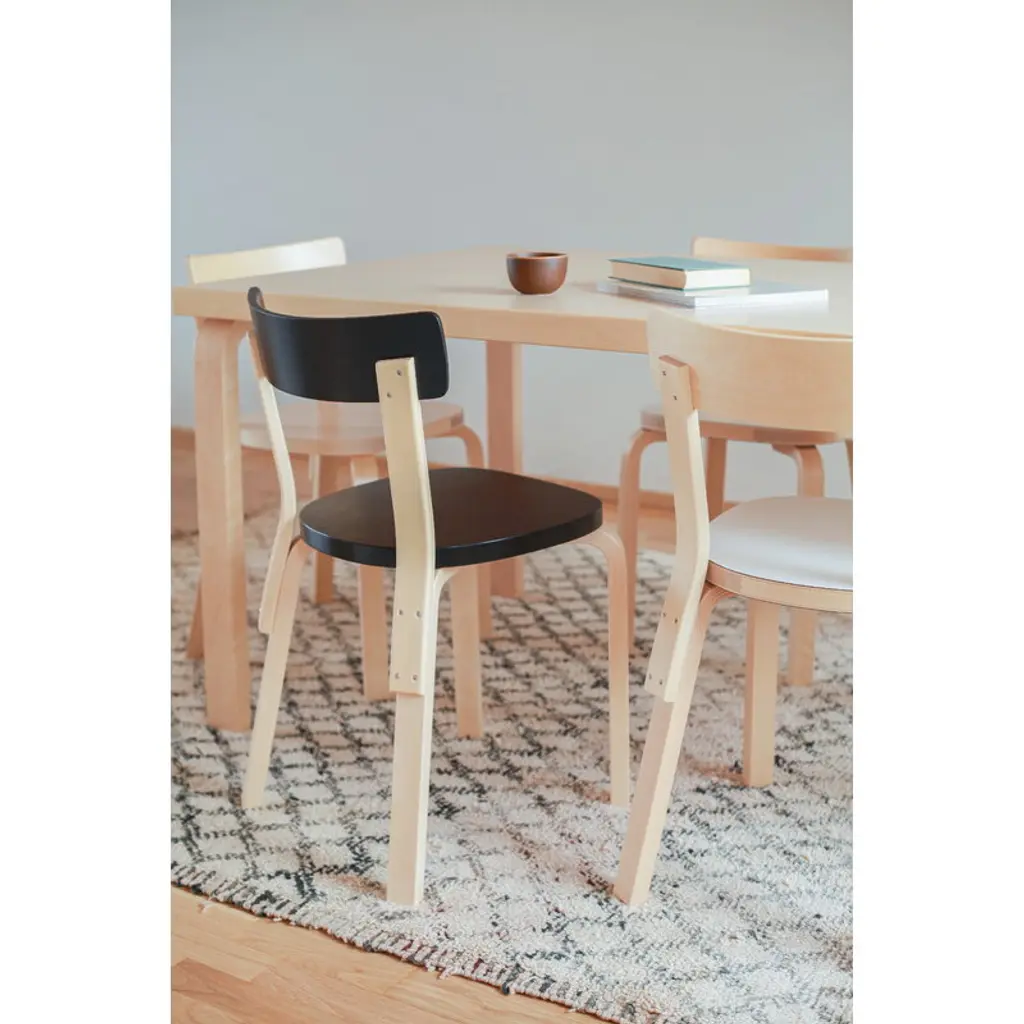 Chair 69 was designed by Alvar Aalto for Artek in 1935. Chair 69 is one of Aalto’s best-known dining chairs, and its simple yet vivid character easily suits any room of the house. The wide seat and backrest provide superior stability and everyday function for various different situations. The chair uses Aalto’s L-leg structure, which allows the legs to be attached directly to the seat. At the time, the L-leg structure was considered nothing short of revolutionary, giving a major boost for all modern Scandinavian design. The same technique is still used to bend the legs of Aalto’s chair: a piece of straight, solid birch is sawn open at the end in the direction of the fibers, forming the shape of a fan. Thin pieces of plywood are then glued in the grooves. This structure makes it possible to bend the wood by heating or steaming the desired angle and when dry, it will have a very strong texture that can be easily attached to the seat.
