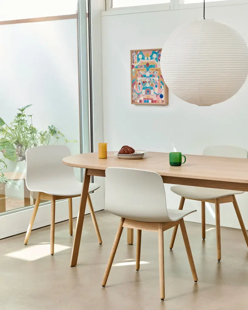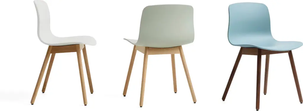 Now made with 100% recycled post-consumer plastic, the About A Chair (2009), designed by Hee Welling for HAY, began with a desire to tell a story about a chair and quickly became one of the bestselling collections in Scandinavia. With its gently curved, comfortable seat and solid wood legs, the AAC 12 Side Chair offers pleasing proportions and a quietly elegant aesthetic. Made in Mexico.