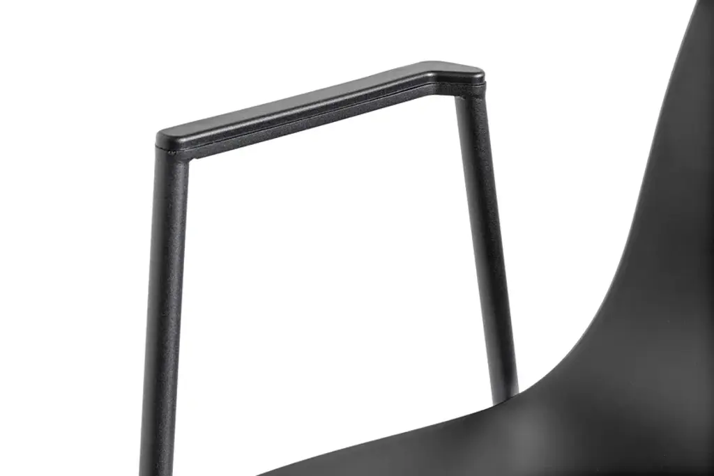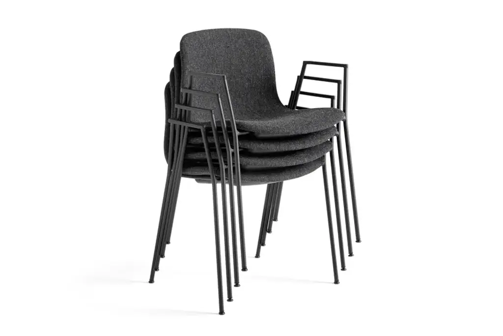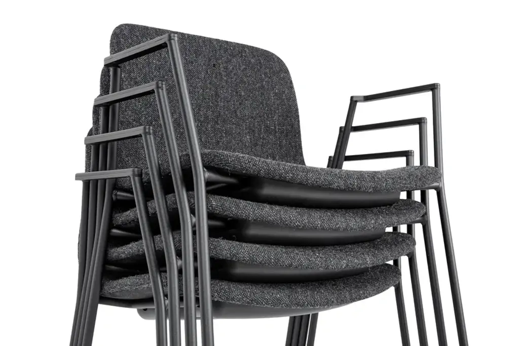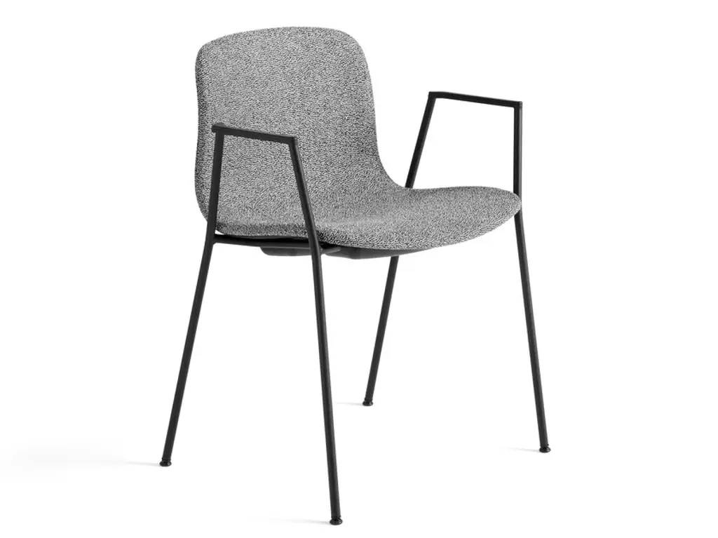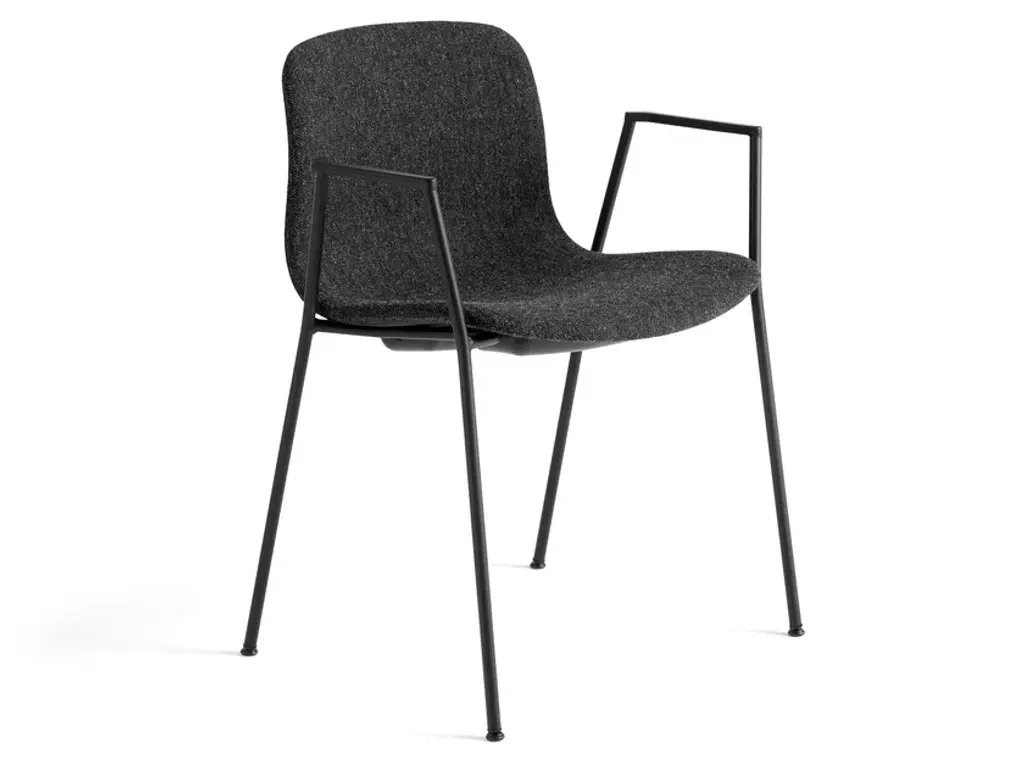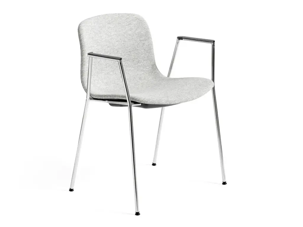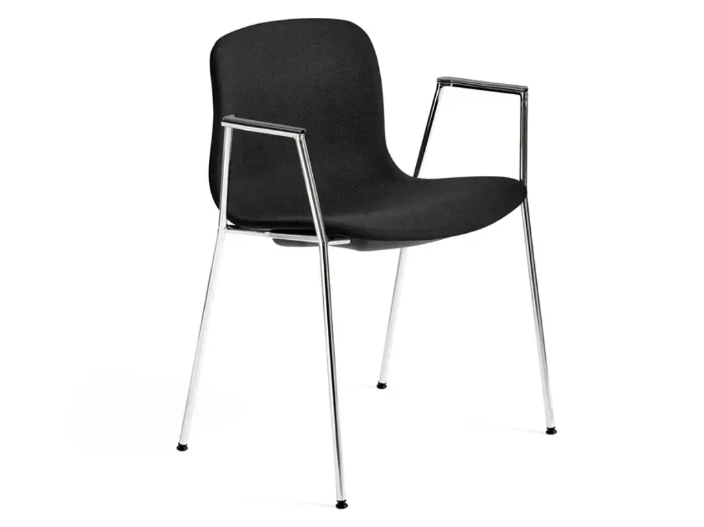 Offering a slightly more formal flavour than the rest of the series, About A Chair AAC 19 features slim, elegant legs and armrests that frame the seat shell. The chair’s upright, slightly rounded seat offers excellent comfort, while the open front conveys a welcoming expression. Its refined silhouette makes it a perfect conference chair but is also suitable for dining tables or home offices. The legs are available in chrome and powder coated finishes, while the shell comes in diverse colour and upholstery options, allowing a multitude of design combinations that make this series so versatile.Injection moulded polypropylene shell without armrest with full upholstery. Shell thickness: 10 mm polypropylene with 10 mm foam 4-legged base in Ø16 mm bent steel tube with integrated armrests. Included armpads in PU foam black. Available in a large selection of standard fabrics and leathers. Available in 3 different base finishes: - Black powder coated aluminium (RAL 9005) - White powder coated aluminium (RAL 9003)- Chromed steel