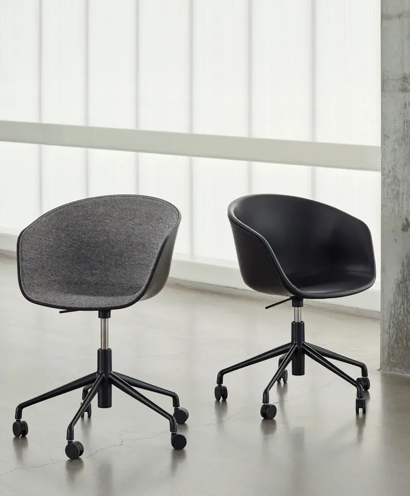 Perhaps the most functional chair of the series, the About A Chair AAC 52 features a five-legged castor base equipped with a gas lift that can adjust the seat height. The aluminium base is available in different finishes, with the post-consumer recycled plastic shell offered in a wide palette of contemporary colours, along with multiple front or fixed seat upholstery options. The multitude of variants and design combinations give this series a versatile expression that makes it suitable for a wide variety of corporate, private, and public contexts.