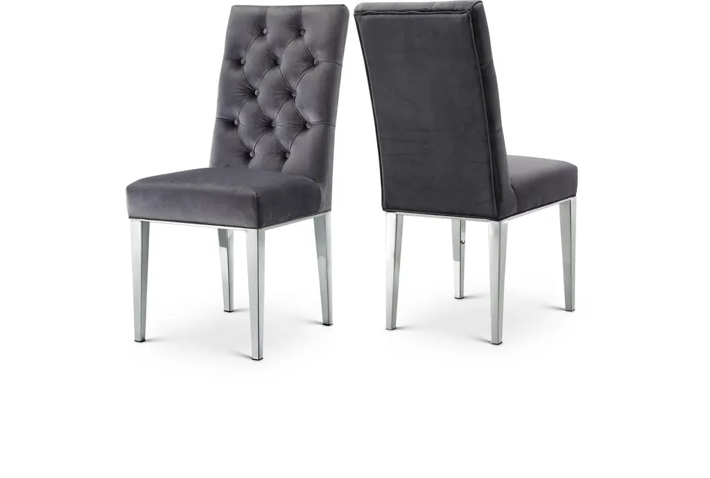 Suited for vanities and dining tables in plush modern homes, this chair is marked by clean lines and a padded seat embellished with a gray velvet upholstery that flaunts a luxurious tufted design. The rest of its wooden frame is deliberately left visible, its dark brown hue brightened up by the front legs' chromed feet.