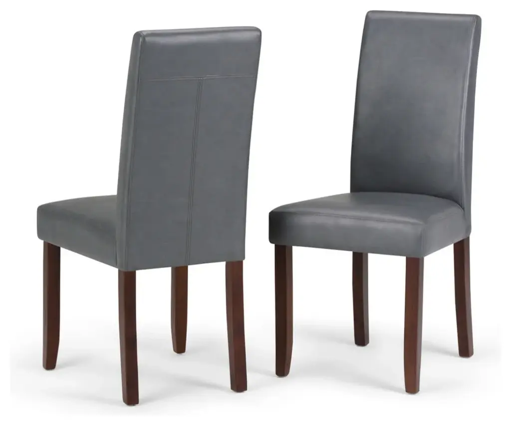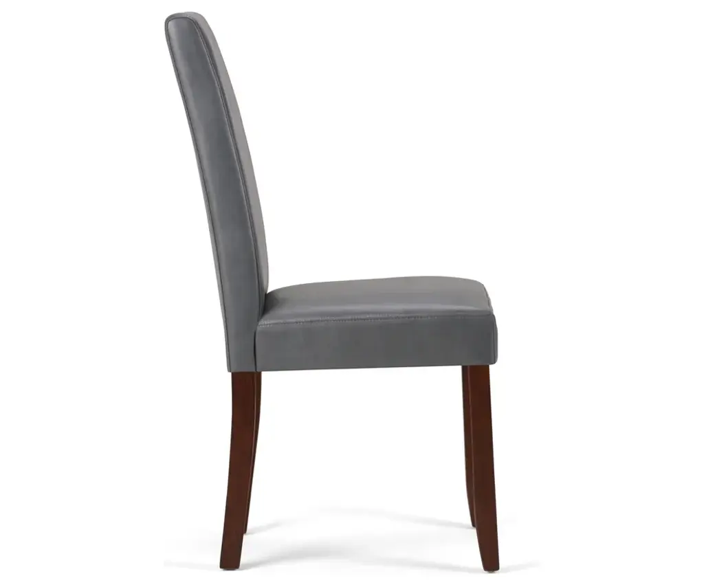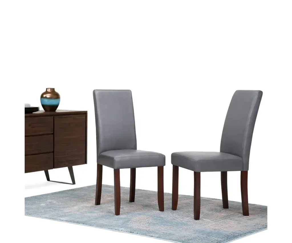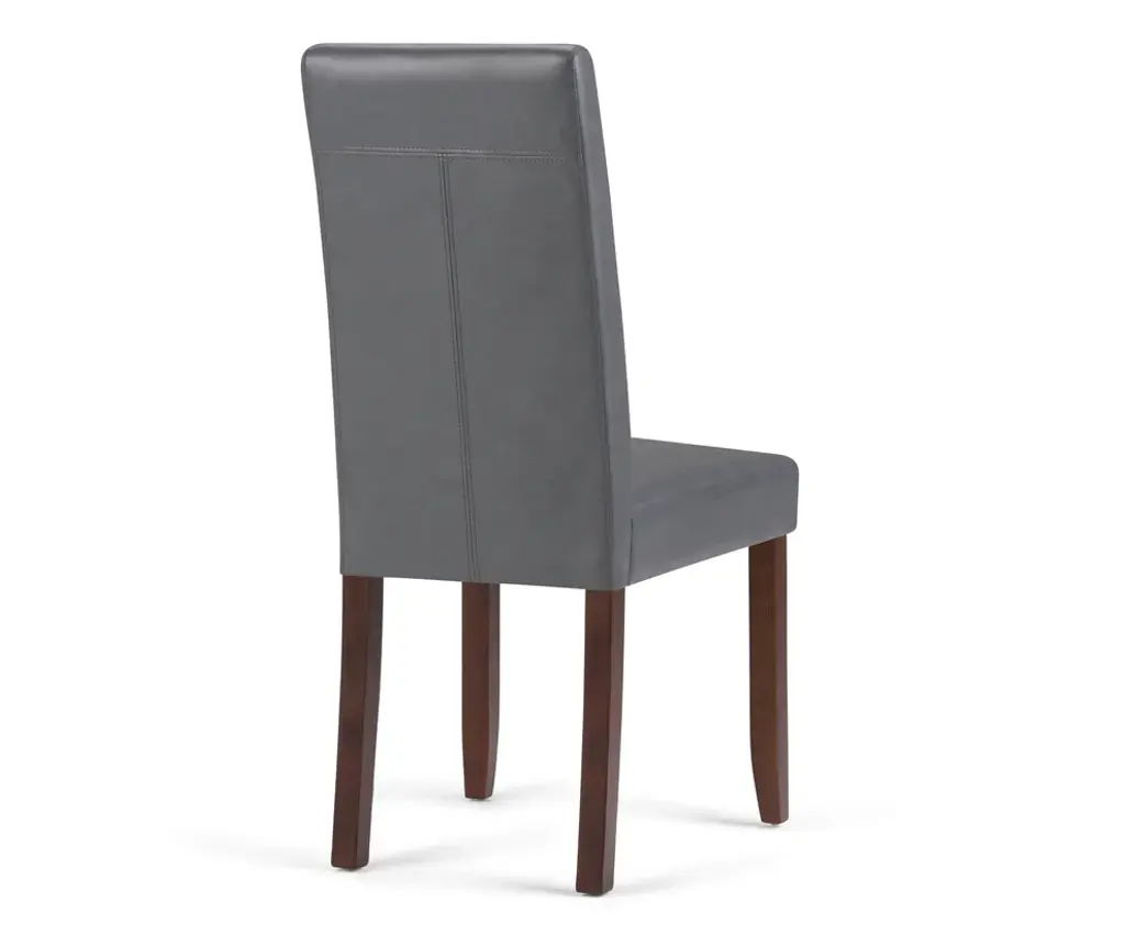 Upgrade your dining experience with the Acadian Parson Dining Chair Set of 2, expertly designed for both style and durability. Crafted with a solid rubberwood frame, these chairs feature Stone Grey vegan leather upholstery, offering a sleek yet comfortable surface that's easy to clean. The high backrest and plush foam cushioning provide ergonomic support, making them perfect for family dinners or extended gatherings. With a transitional style, these chairs seamlessly blend modern and classic aesthetics, fitting beautifully into various dining room decors. The chairs are built to last, featuring kiln-dried wood for enhanced stability and resistance to warping or cracking. Simple to assemble, they offer an effortless way to add functional elegance to your space.# Set of 2 dining chairs made with sustainable, kiln-dried solid rubberwood for long-lasting durability.# Upholstered in Stone Grey vegan leather, offering a sleek, easy-to-clean finish.# High backrest and foam-cushioned seat ensure comfort for prolonged use.# Transitional style combines modern and traditional design elements, perfect for versatile home aesthetics.# Built with reinforced frames and designed to support up to 250lbs. per seat.# Kiln-dried wood construction minimizes warping and ensures resistance to cracking.# Easy assembly with clear instructions and hardware provided; minimal tools required.# Efforts are made to reproduce accurate colors, variations in color may occur due to computer monitor and photography# We believe in creating excellent, high quality products made from the finest materials at an affordable price. Every one of our products come with a 1-year warranty and easy returns if you are not satisfied.