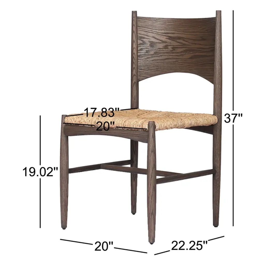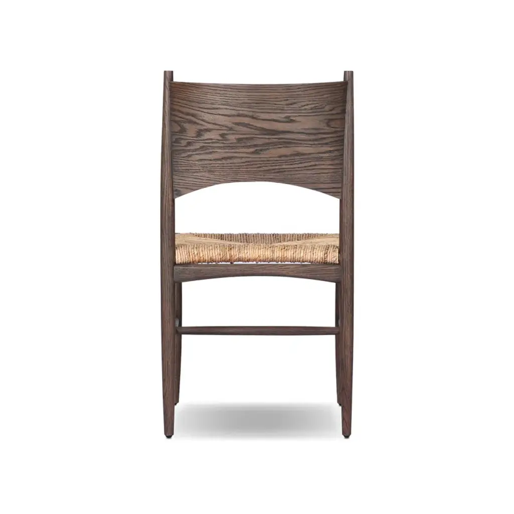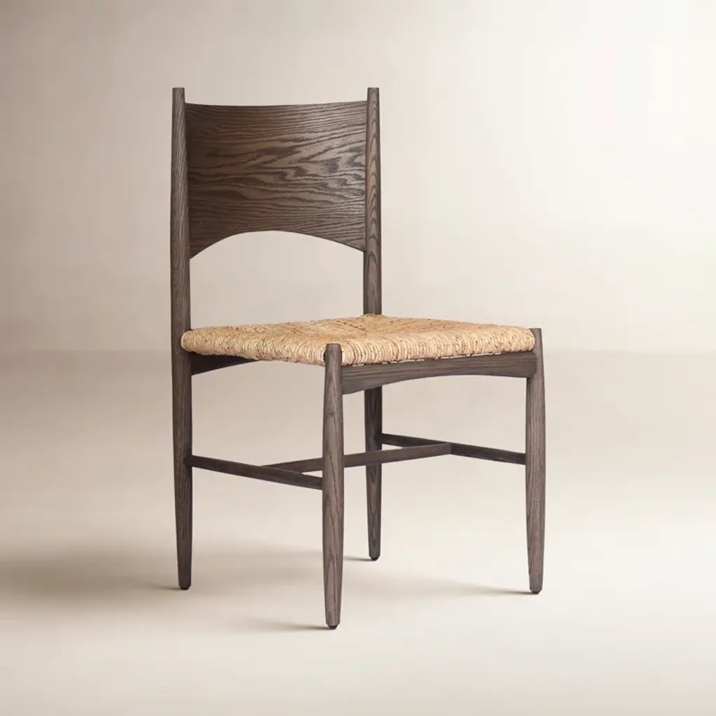 A seamless addition to your dining collection, a slim-profile dining chair pairs a woven banana leaf seat with a solid oak frame featuring a bentwood back.