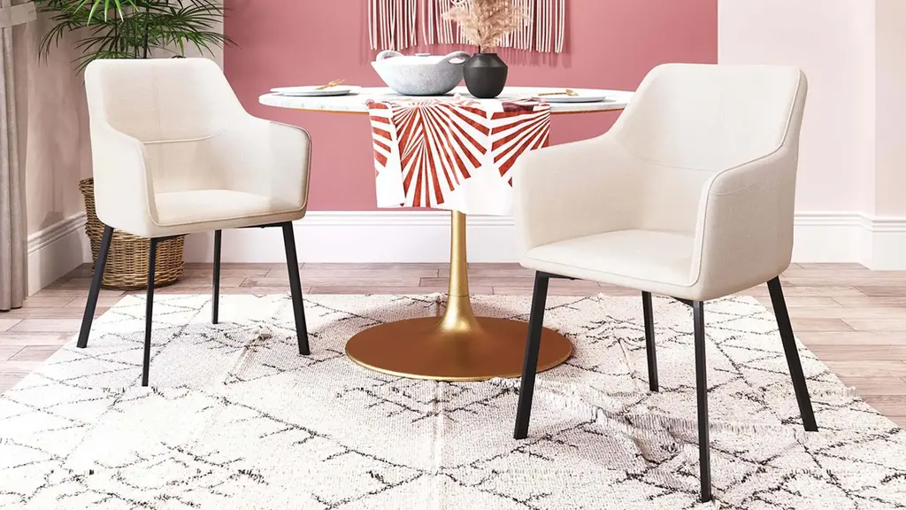 The Adage Dining Chair set of 2 has a powder coated steel frame with a water-resistant covering.