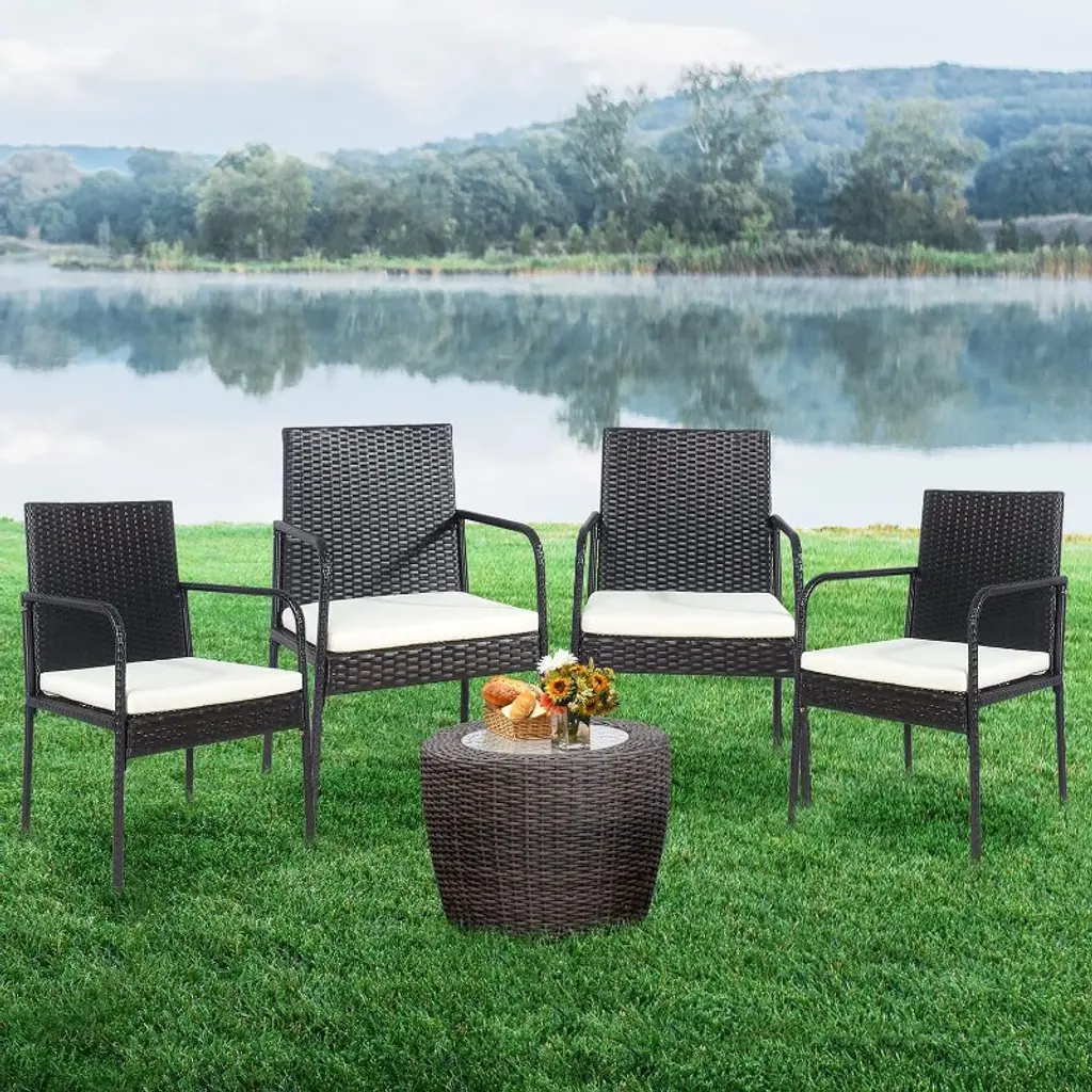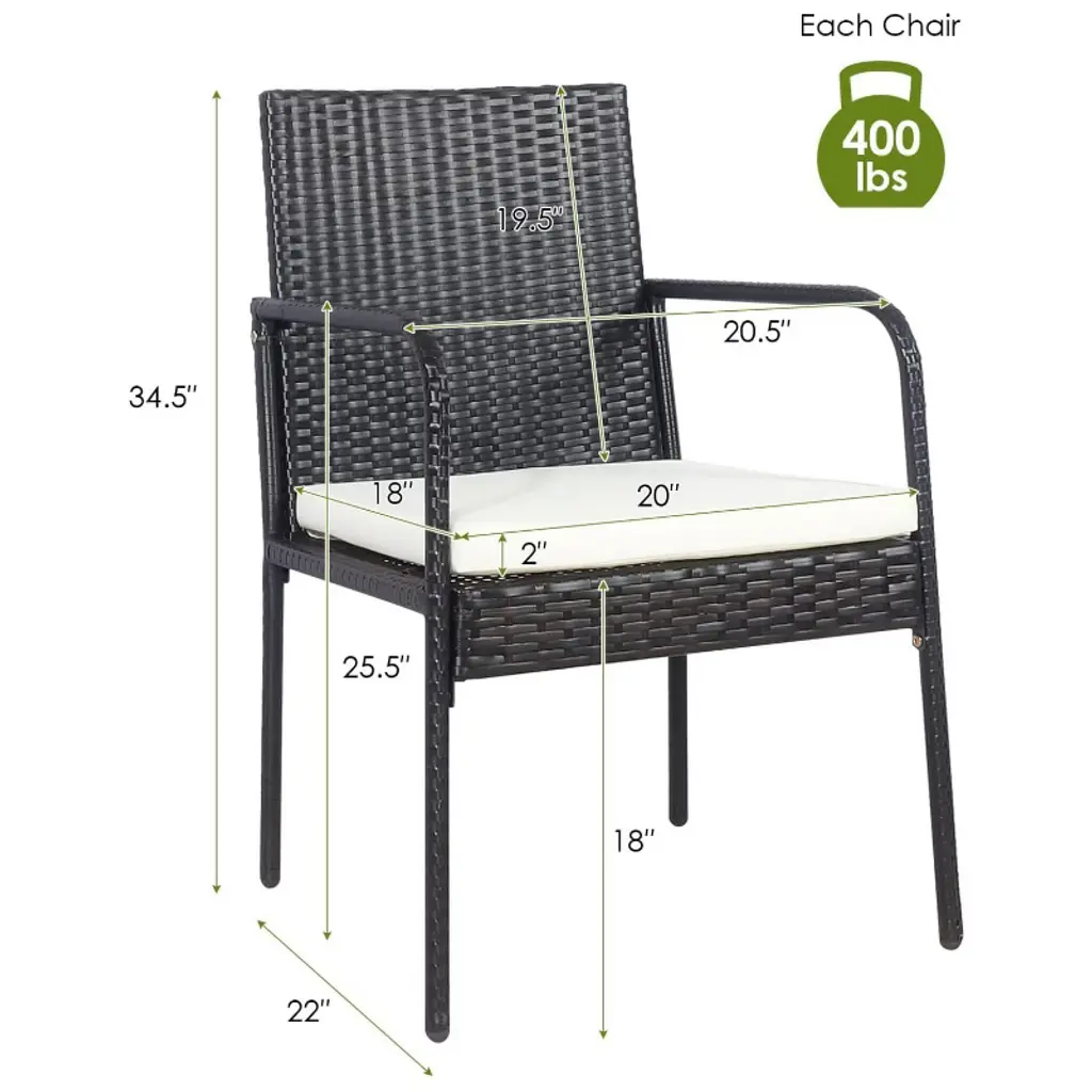 Give yourself some leisure time to relax with your favorite book or have meals with our outdoor rattan dining chairs! This is our set of 4 dining rattan chairs which is trendy and practical. Made of high-standard steel frame and premium PE rattan, this outdoor chair is of high stability and strong durability. We use the soft and durable cushion which is made of polyester and sponge to provide great comfort and relaxation for your body. Coming with smooth zipper, the cushion is easy to clean. Our dining rattan chairs can be widely used in patio, garden, coffee shop and dining room with its modern design.