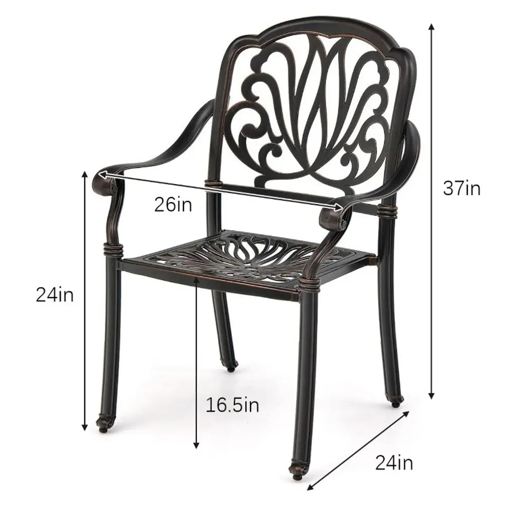 After simple assembly, these outdoor dining chairs are ready to use. The backrests, armrests and seats are all curved, making you feel more comfortable. What’s more, the rustproof and sturdy cast aluminum not only assures you higher durability but shows you 360 lbs strong bearing capacity. After using them, just stack these patio armchairs together for space saving.