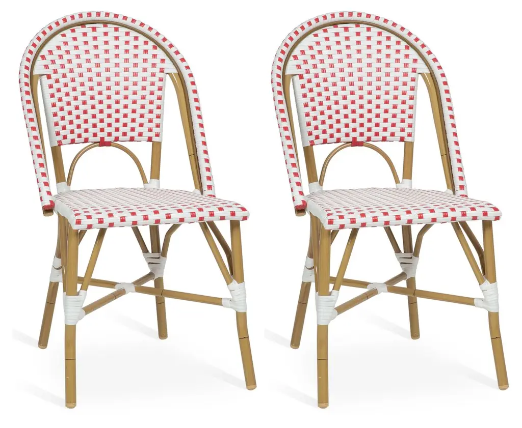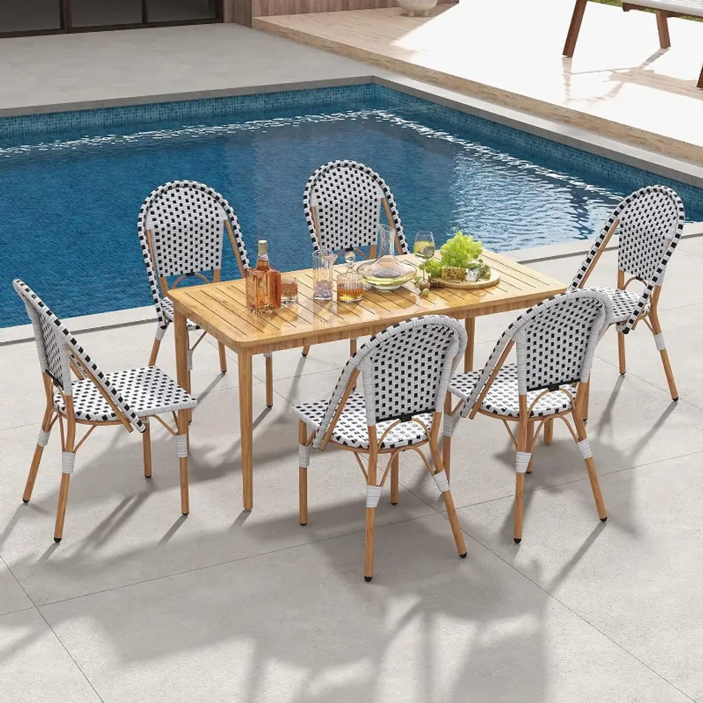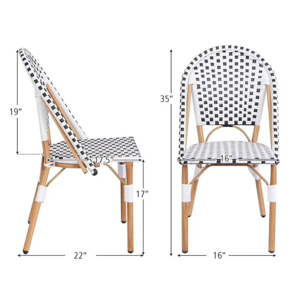 Crafted with premium PE rattan, these chairs offer not just a touch of European elegance but also lasting durability and a comfortable sit. The galvanized metal frame, complete with a stylish wood grain finish, ensures these bistro chairs stand the test of time with both stability and a dash of rustic charm. Perfect for your patio, breakfast nook, or even a cozy cafe setting, these chairs are as much a functional piece as they are a decorative delight. Low-maintenance and easy to move around, these dining chairs are a breeze to look after and fit seamlessly into any outdoor or indoor arrangement.