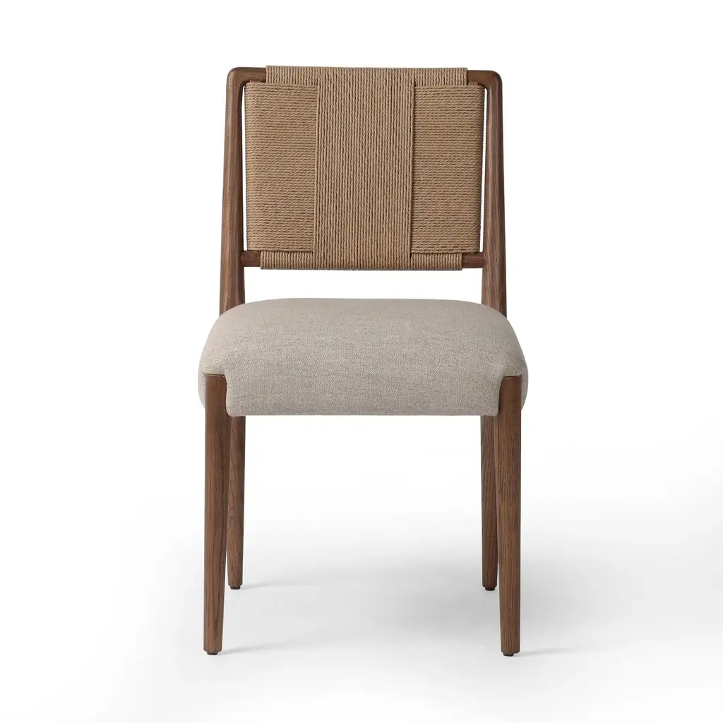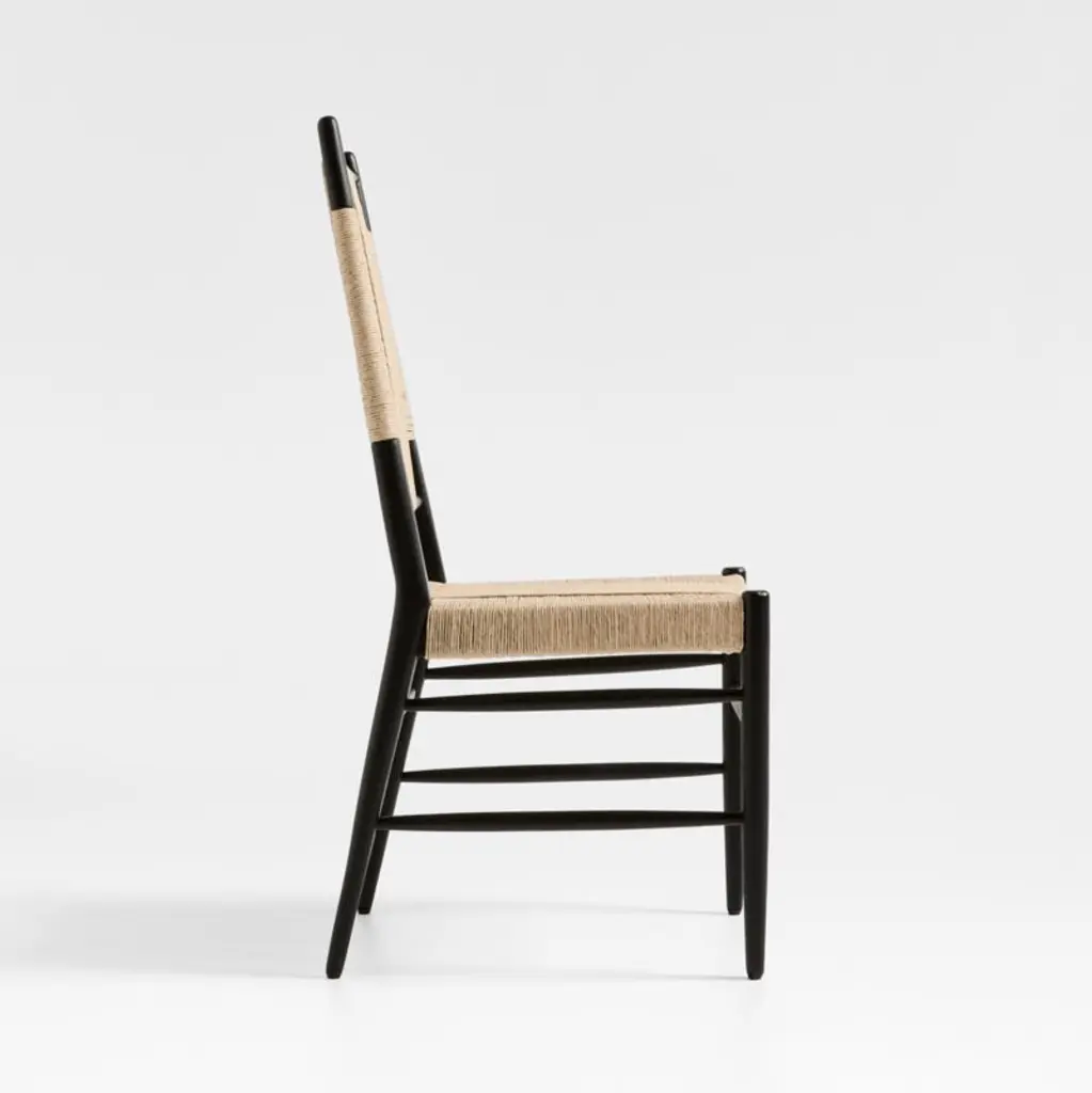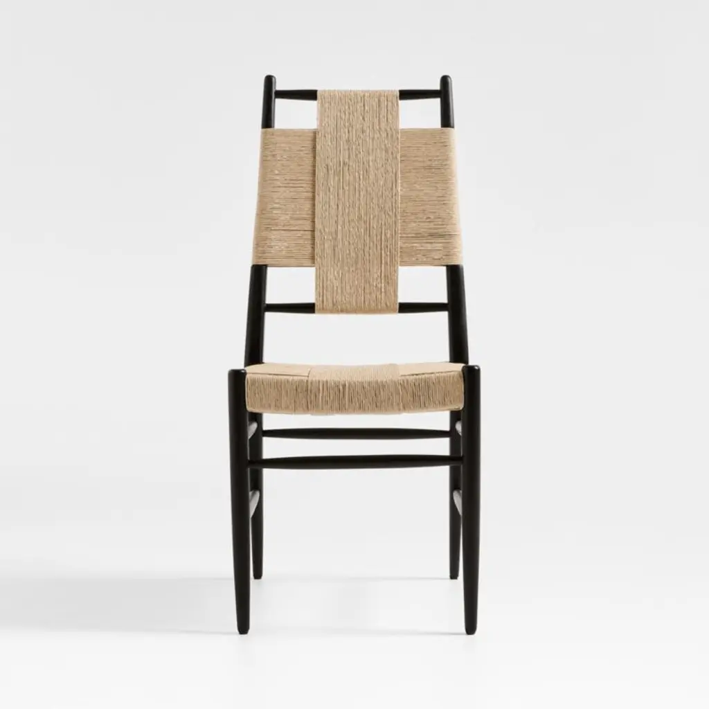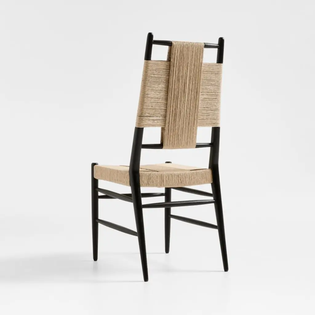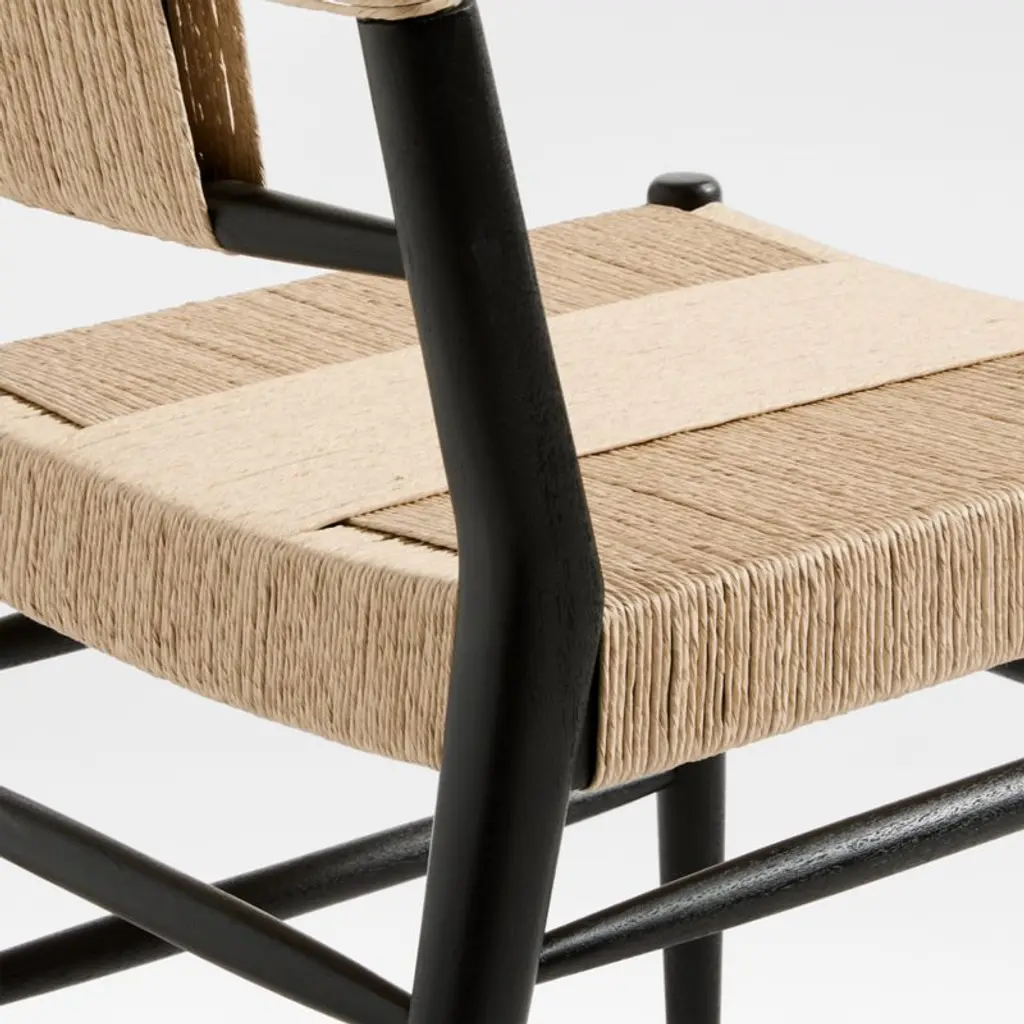 Our Adriel chair blends the warmth of farmhouse style with the sophisticated simplicity of Scandinavian design. The acacia frame draws on tradition with tapered legs and pillowed stretcher bars, made contemporary with a streamlined design, bullnose ends and a wirebrushed black finish to bring out the grain. The seat and back echo traditional rush chairs, wrapping the frame in a modern pattern that crisscrosses wide bands of handwoven paper cord in a natural beige color. A tall back gives the dining chair a striking silhouette while providing added comfort.