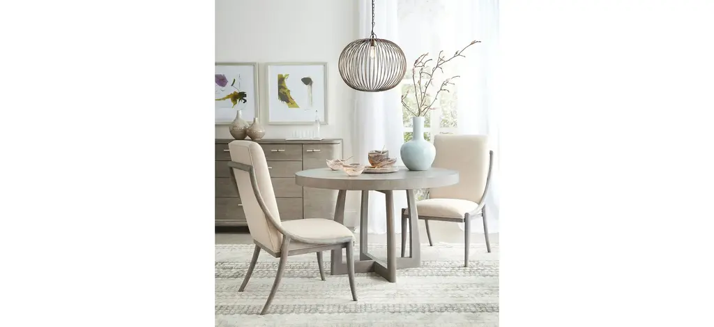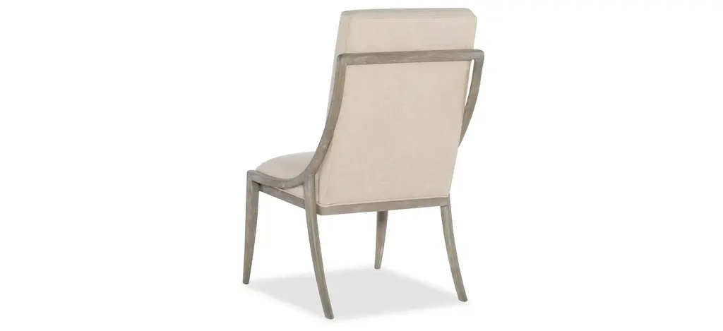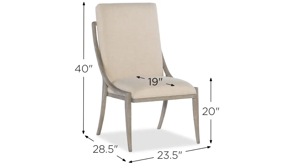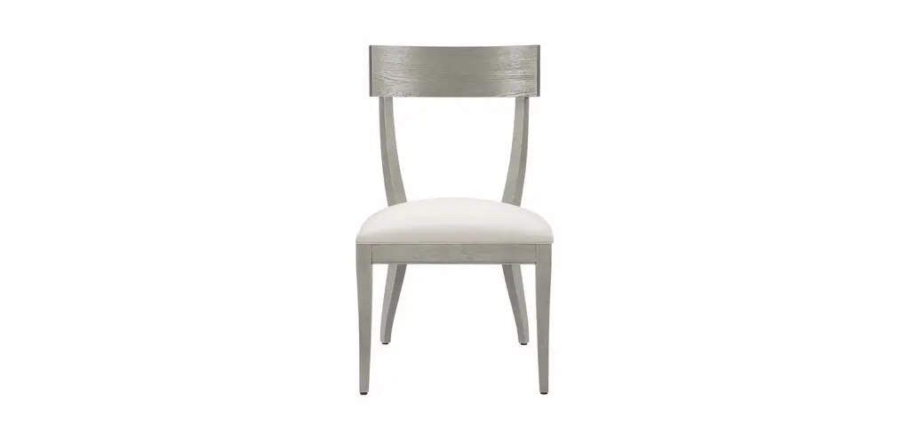 Soft, rounded forms combine with sand-blasted greige and antique white finishes to create an inviting transitional boutique upholstered slope side dining chair in Affinity. Pewter and antique white hardware and soft linen fabrics add intrigue.