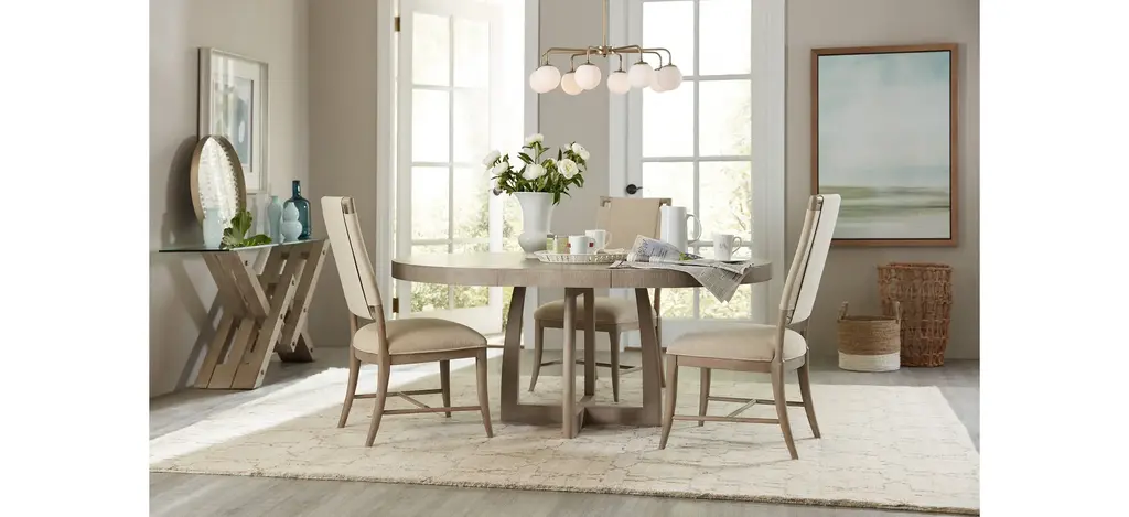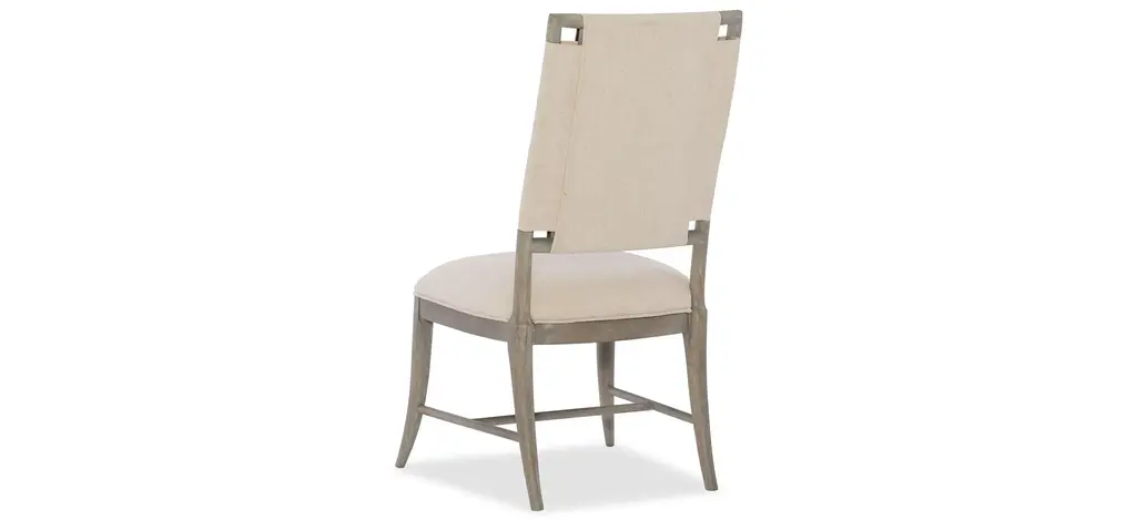 Soft, rounded forms combine with sand-blasted greige and antique white finishes to create an inviting transitional boutique upholstered side chair in Affinity. Pewter and antique white hardware and soft linen fabrics add intrigue.