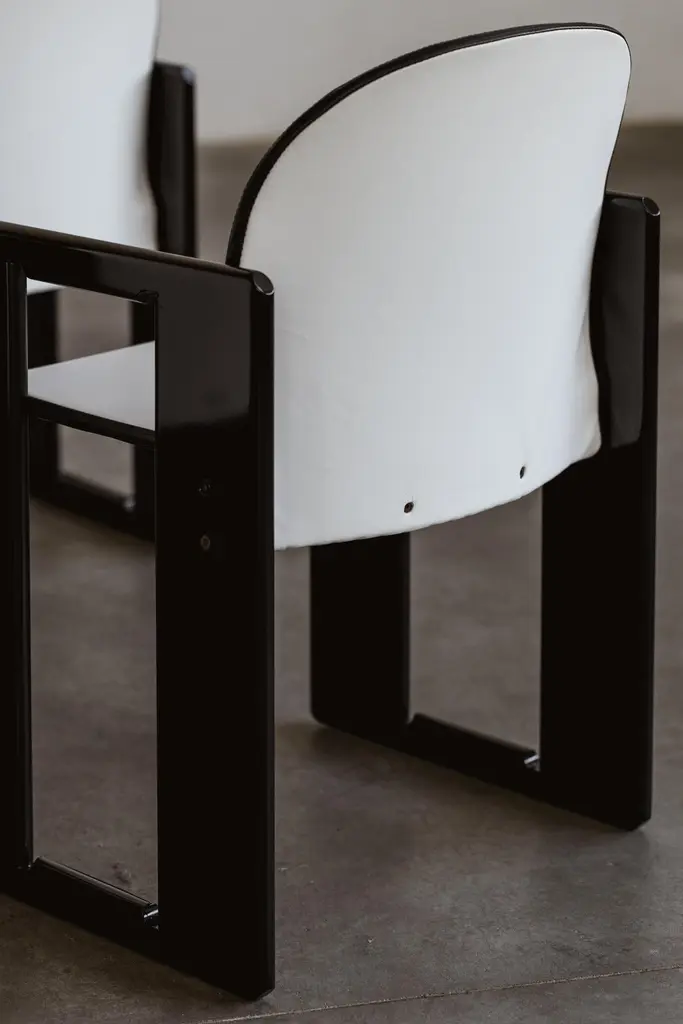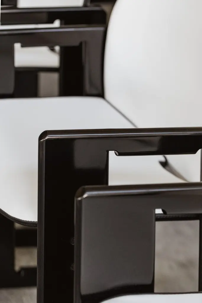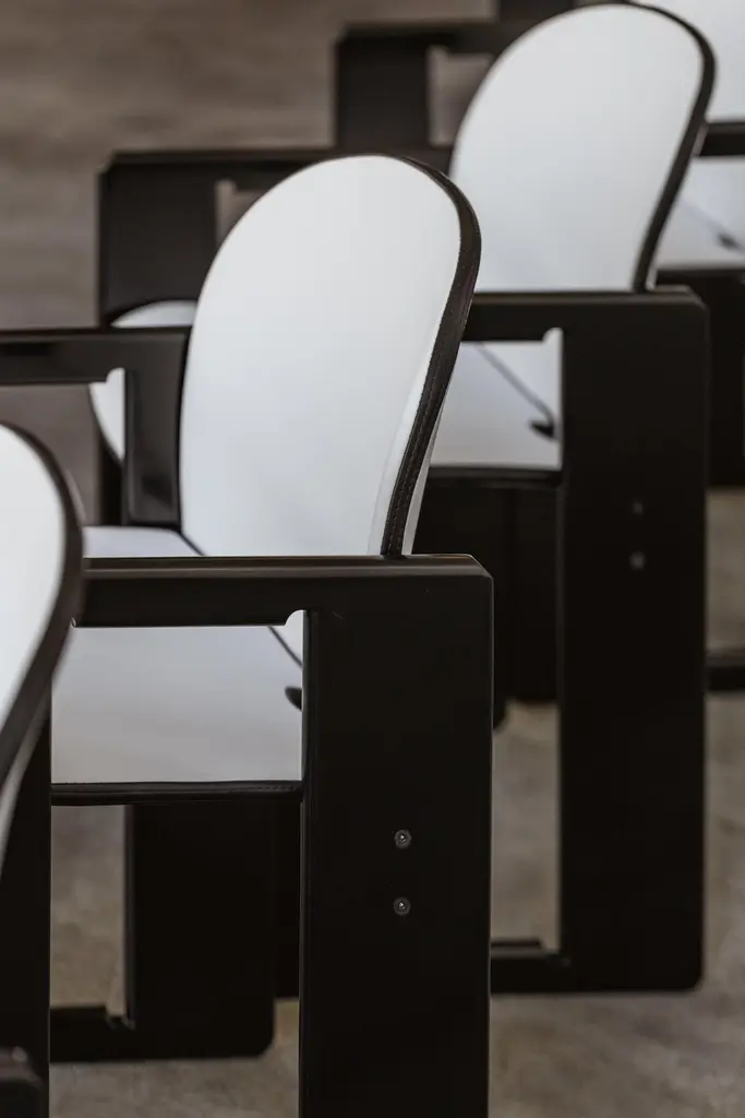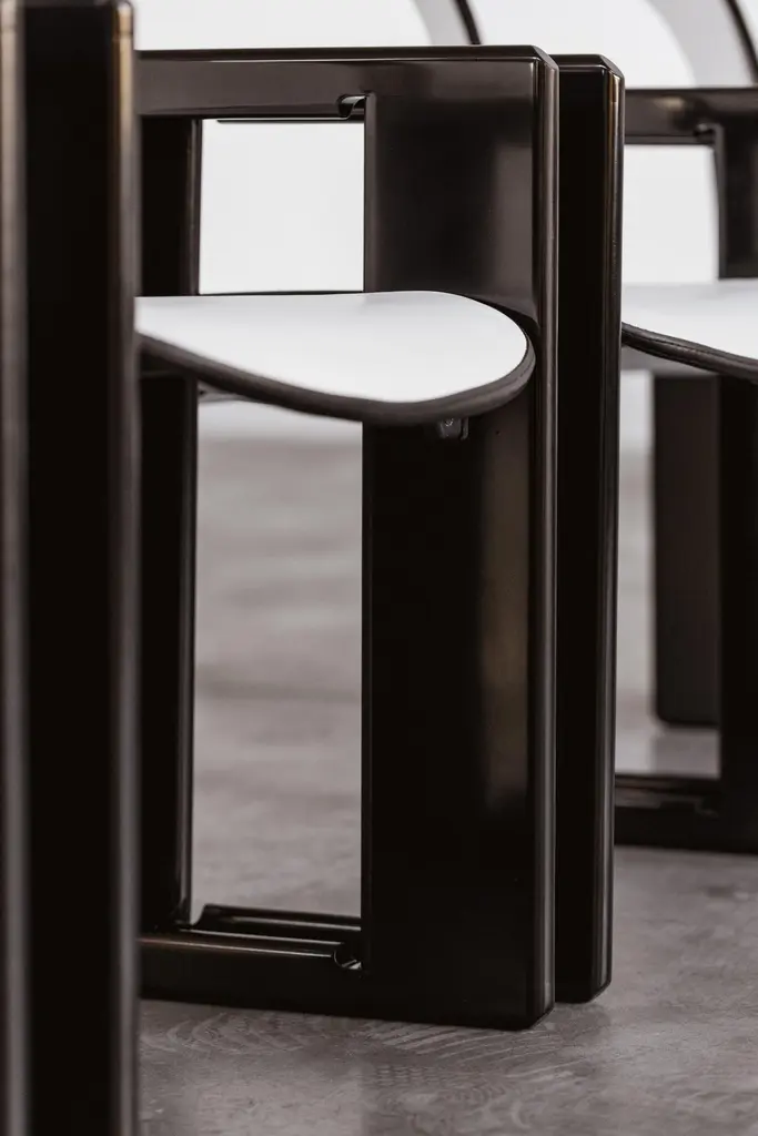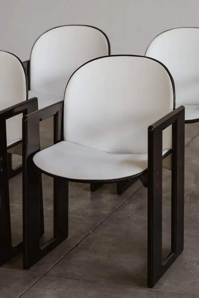 Afra & Tobia Scarpa “Dialogo” dining chairs for B&B Italia, white leather and black walnut, Italy, 1973, Set of sixThe “Dialogo” chair is a return to the formal solution of the “121” chair. For the design of the structure the designers began by defining a rectangular frame in very strong wood. The rounded borders, interlocks, wooden plugs and bolts that connect the four boards of the frame contribute to define the form of the structure. A second solution can be seen in the Dessau chair, where the plastic shells are attached to a support in chromium-plated metal tubing. As the name indicates, this is a citation of the first models in curved metal tubing made at the Bauhaus. Other support solutions (in tubing, cast aluminium and steel rod) have been utilized for large orders, in response to specific requests.Our atelier restored and reupholstered the chairs. We offer custom restoration and special reupholstering on request. Contact us to create the object you desire.