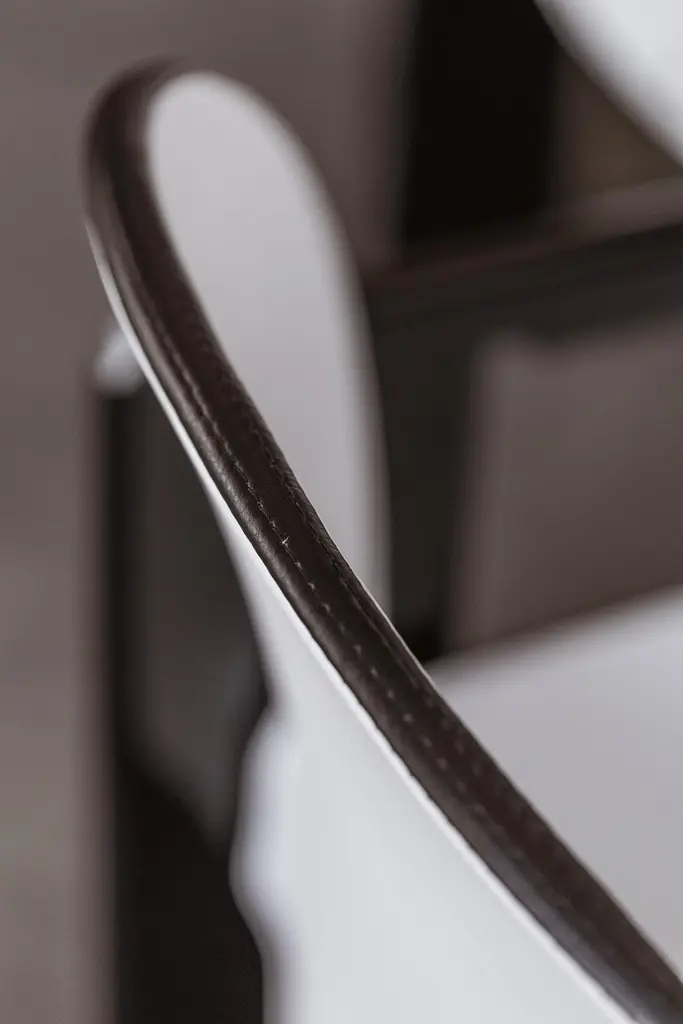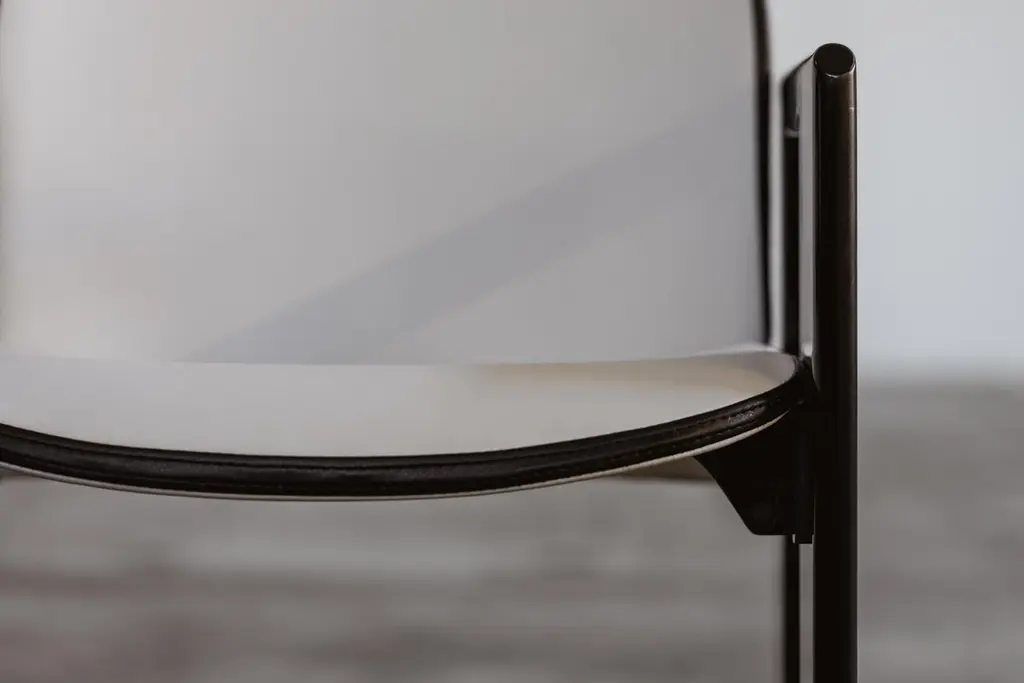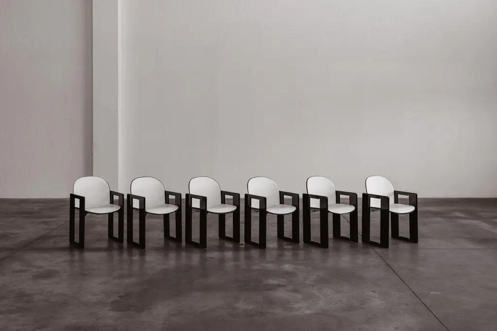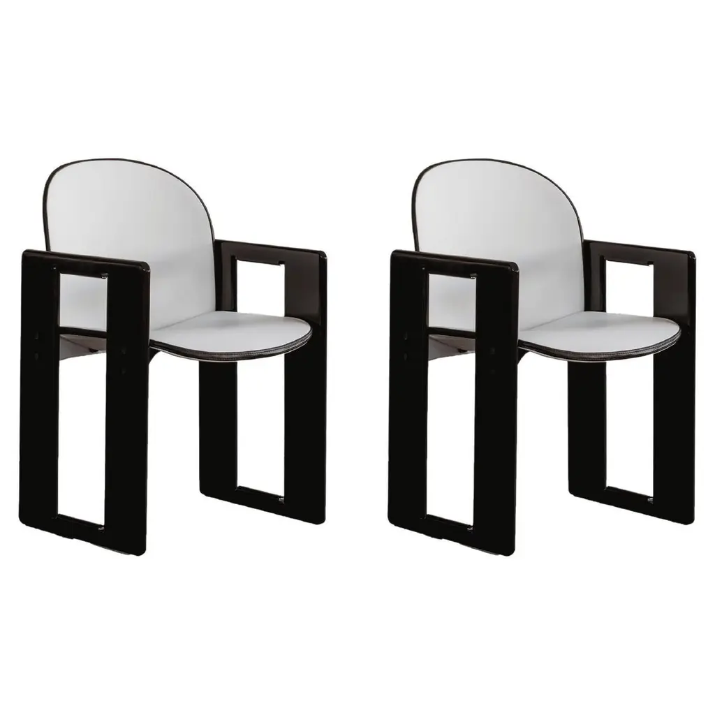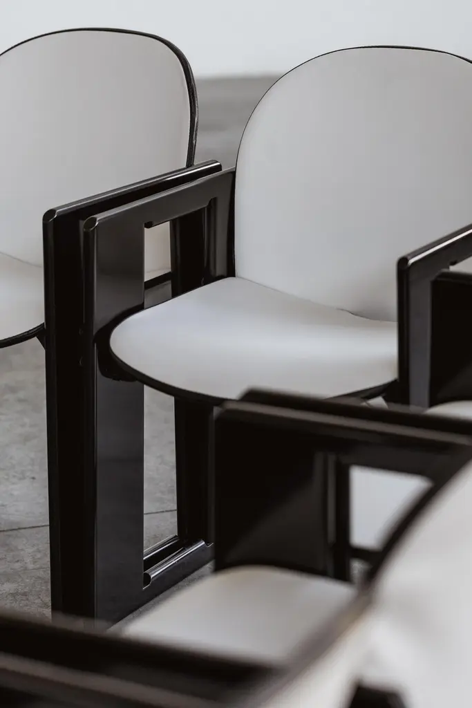 Afra & Tobia Scarpa “Dialogo” dining chairs for B&B Italia, white leather and black walnut, Italy, 1973, Set of sixThe “Dialogo” chair is a return to the formal solution of the “121” chair. For the design of the structure the designers began by defining a rectangular frame in very strong wood. The rounded borders, interlocks, wooden plugs and bolts that connect the four boards of the frame contribute to define the form of the structure. A second solution can be seen in the Dessau chair, where the plastic shells are attached to a support in chromium-plated metal tubing. As the name indicates, this is a citation of the first models in curved metal tubing made at the Bauhaus. Other support solutions (in tubing, cast aluminium and steel rod) have been utilized for large orders, in response to specific requests.Our atelier restored and reupholstered the chairs. We offer custom restoration and special reupholstering on request. Contact us to create the object you desire.