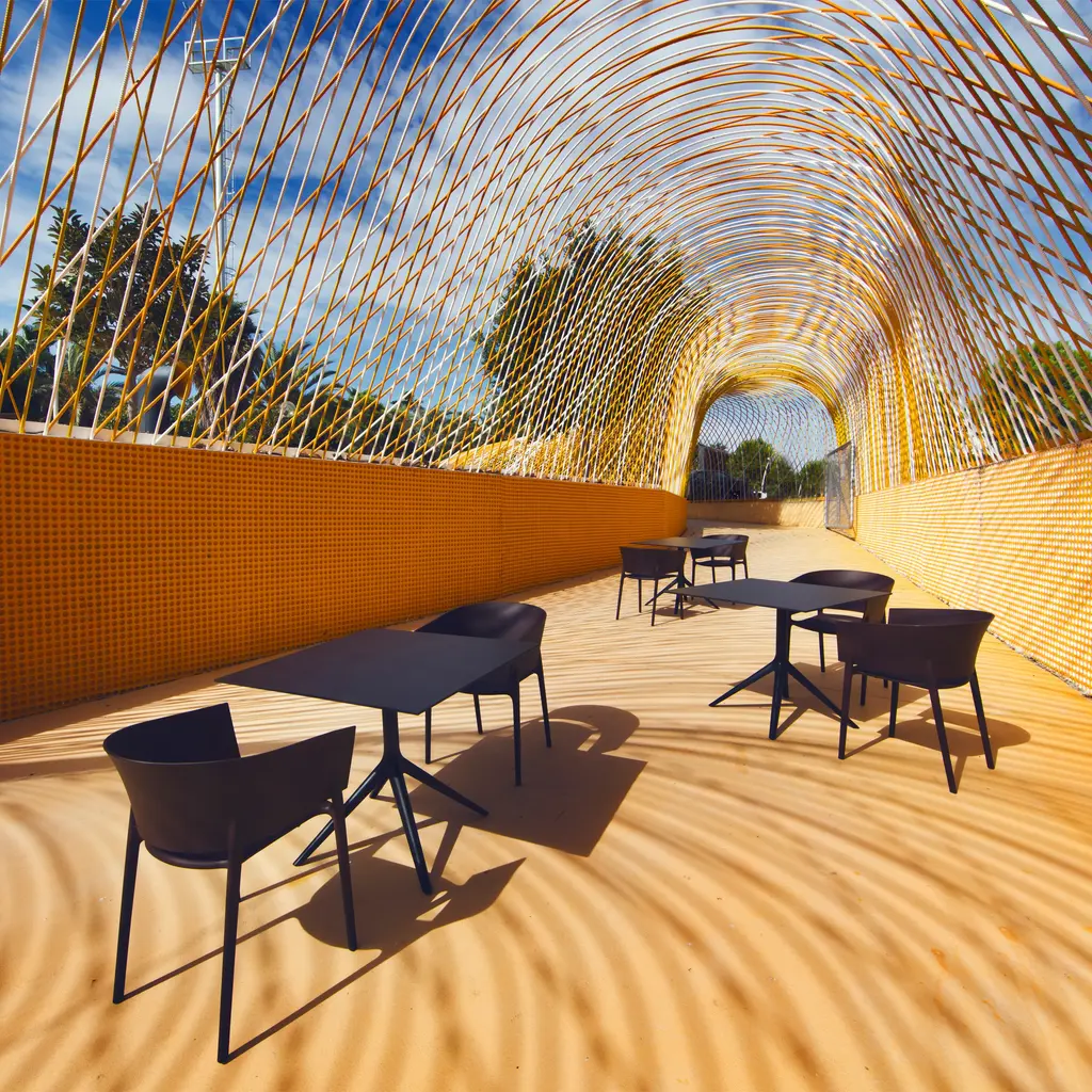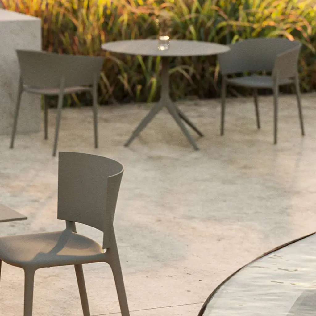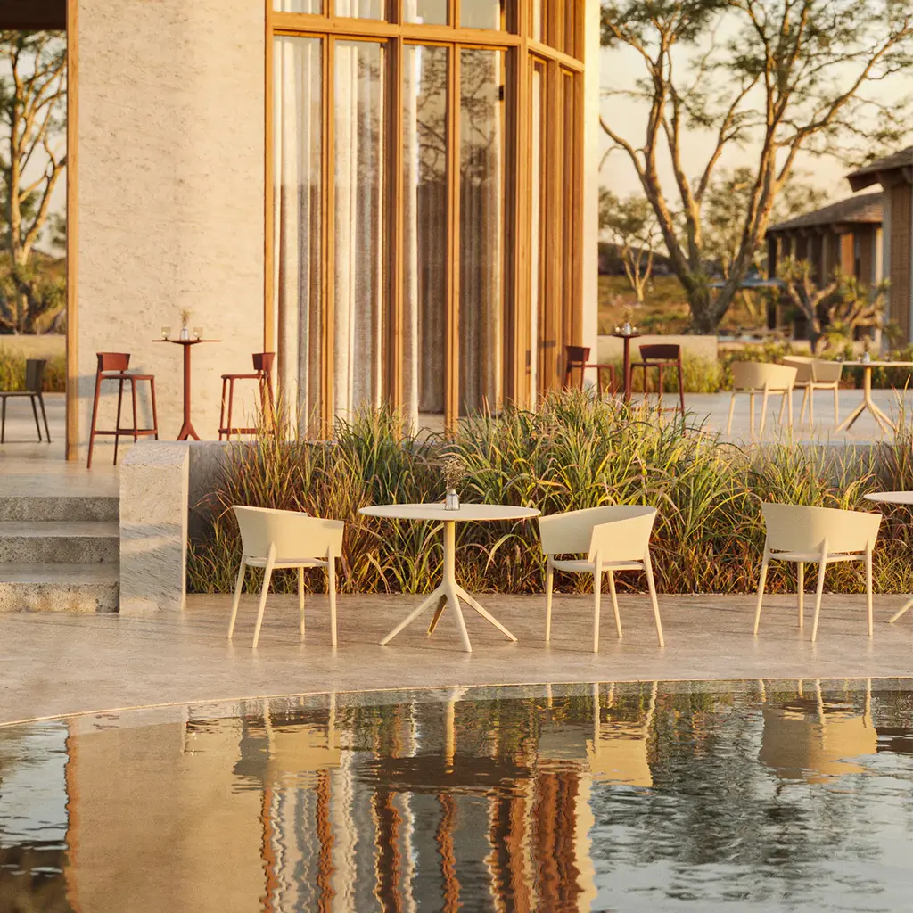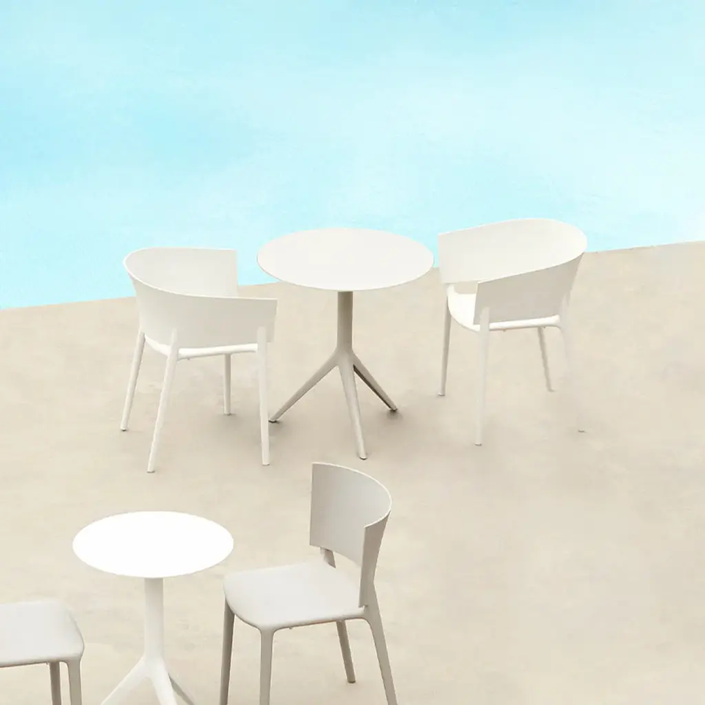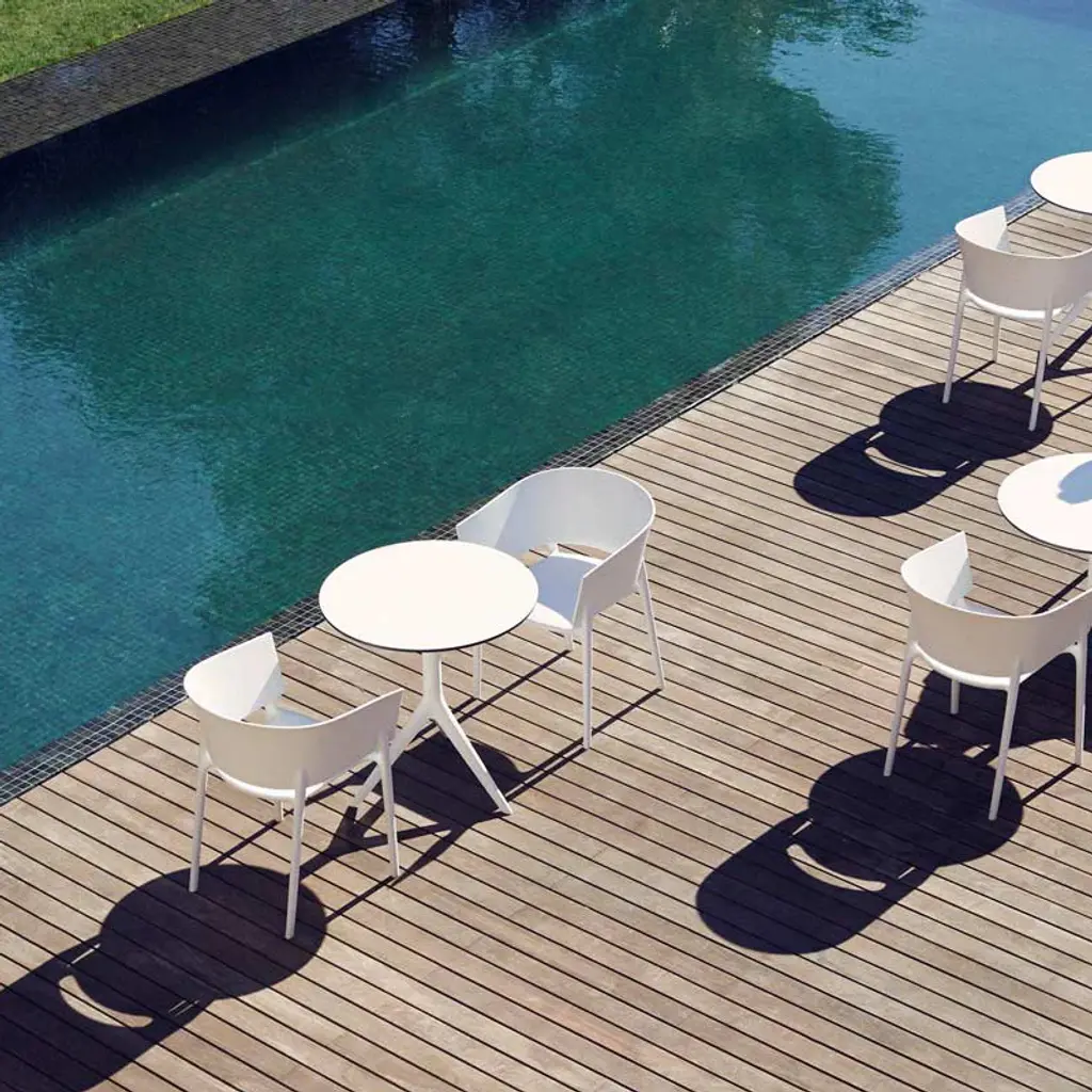 Simple and original, the Africa Armchair (Set of 4) from Vondom is a stylish addition to any indoor or outdoor dining area. Crafted from gas air molding injected polypropylene reinforced with fiber glass, this sculptural arm chair is stackable up to 2 units high for easy storage when not in use. Perfectly suited for a poolside dining area or al fresco garden entertainment space, pair these chairs with a durable outdoor dining table for a casual, cool set-up for enjoying the outdoors with friends and family. Add the optional cushion for an extra touch of comfort and enjoy this design original morning, noon, or night. Highlights