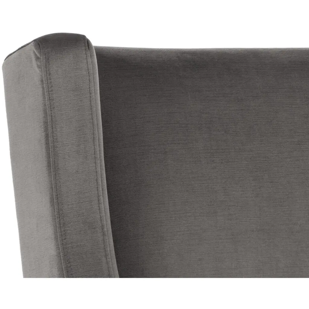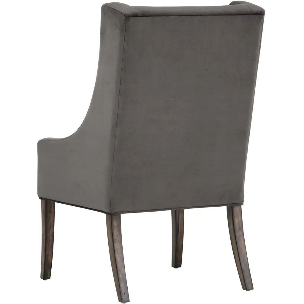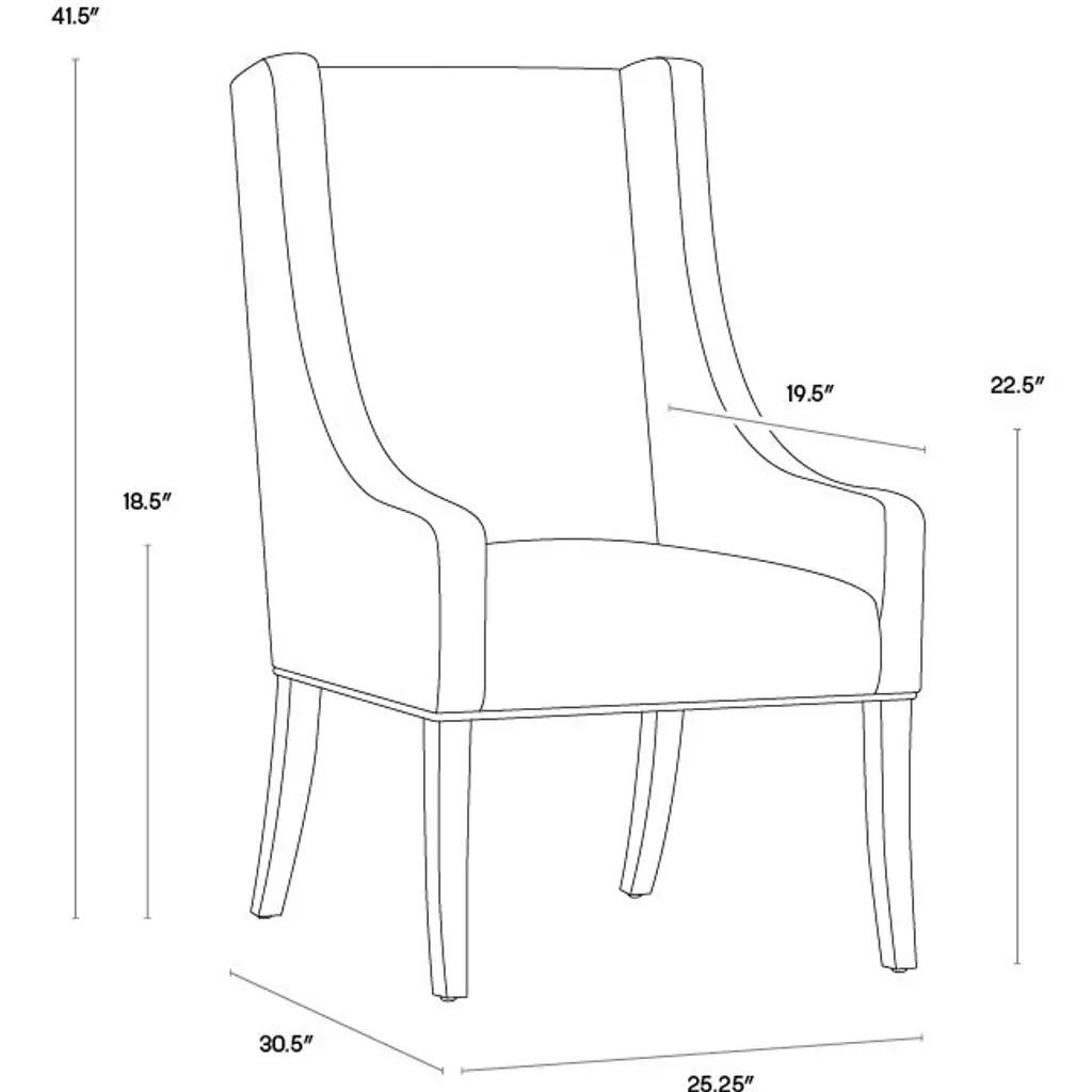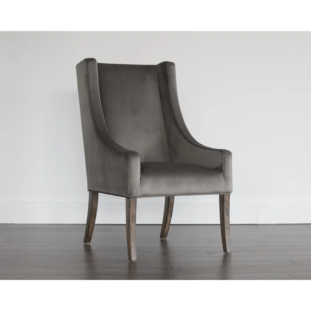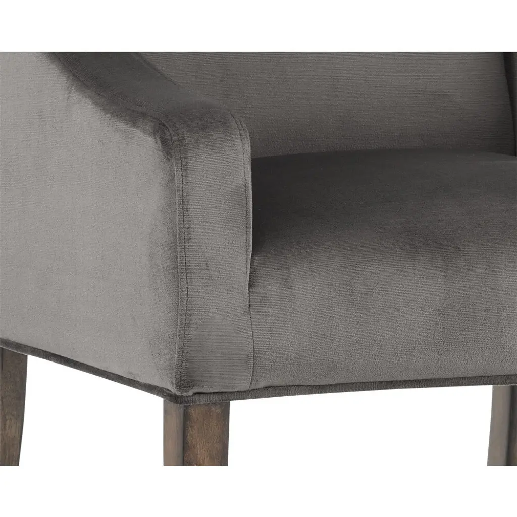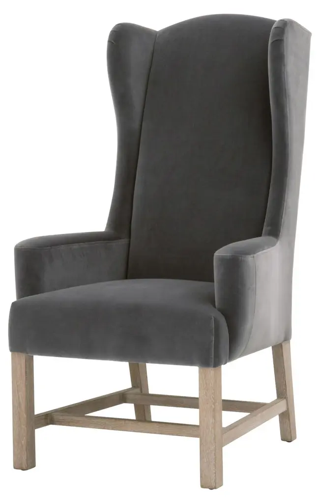 This oversized dining chair features an elegant wing back style with contoured arms. Stocked in our soft piccolo pebble performance fabric with smoked brown oak wood legs. Can also be used as an occasional chair in residential and contract environments. Performance fabric is moisture repellent, durable and easy to clean.