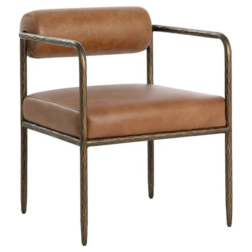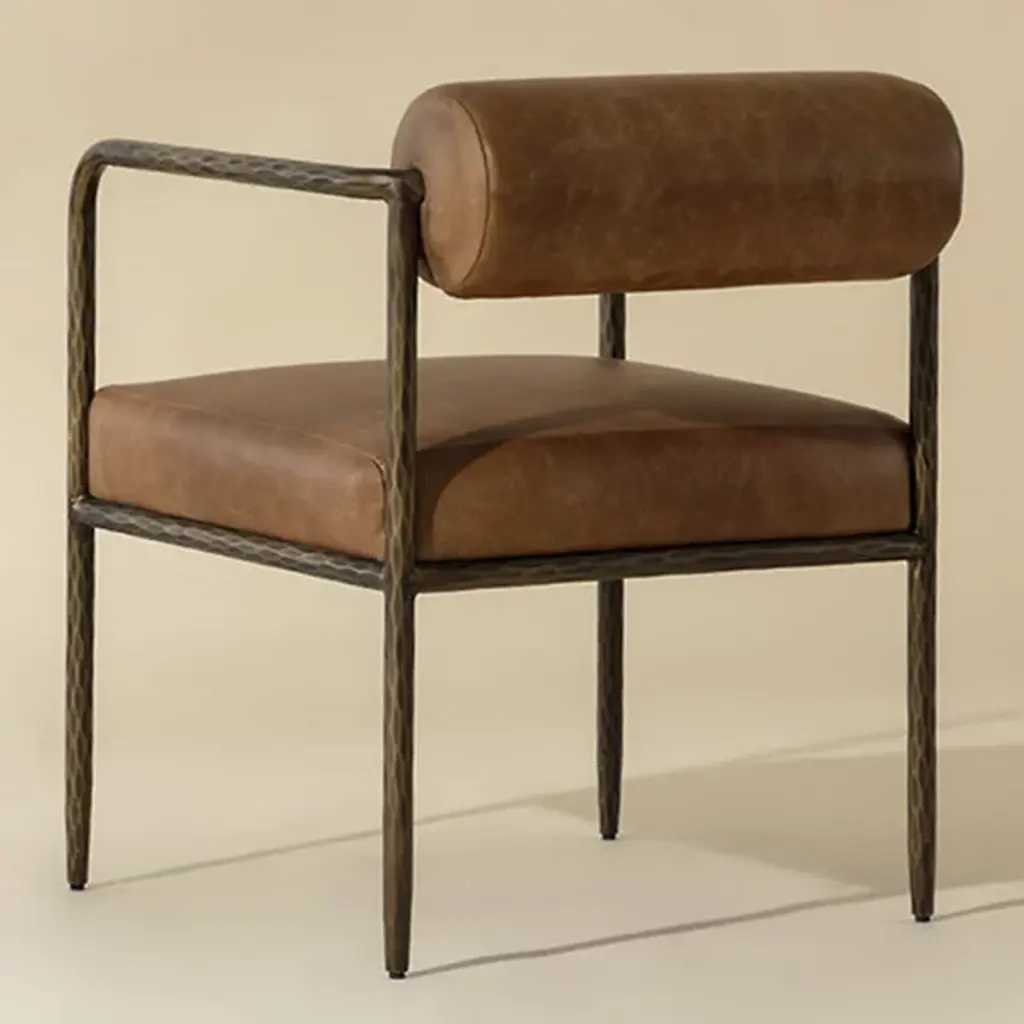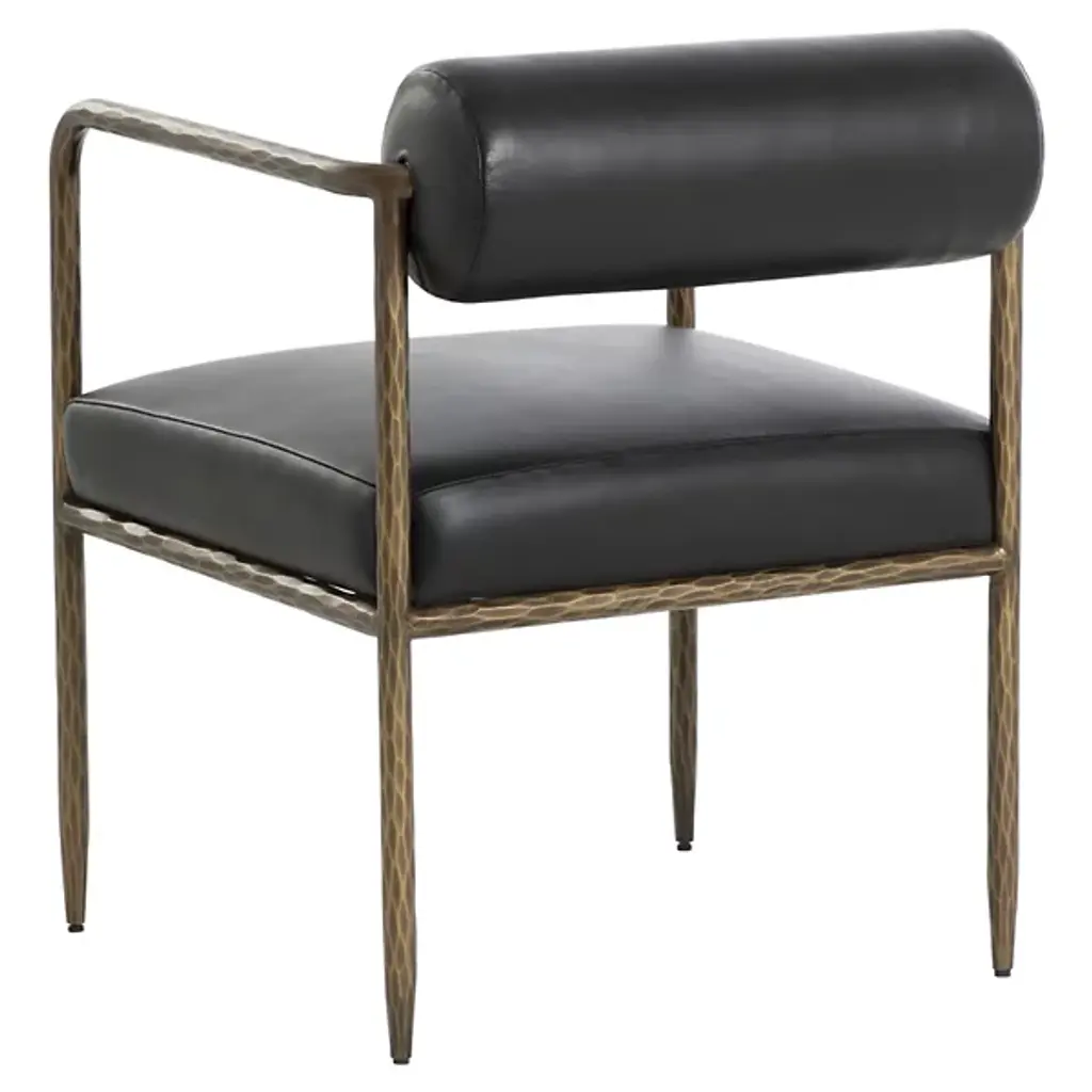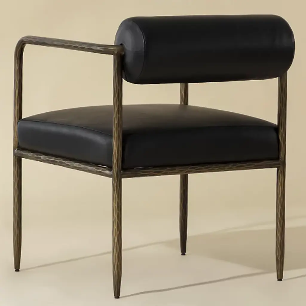 The Ajani Dining Armchair from Sunpan matches artisanal craftsmanship with refined comfort. Its hand-hammered iron frame features a unique, textured finish, while the comfortable upholstery and cylindrical bolster back offer a stylish yet supportive touch. Each cushion is filled with foam and fiber for lasting comfort, and each chair is handcrafted in India, presenting distinct markings and variations. Customizable with adjustable levelers and a retro-modern flair, this one-of-a-kind piece enhances any dining experience with timeless sophistication.