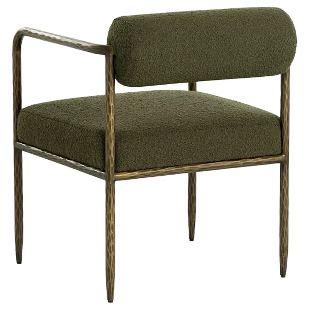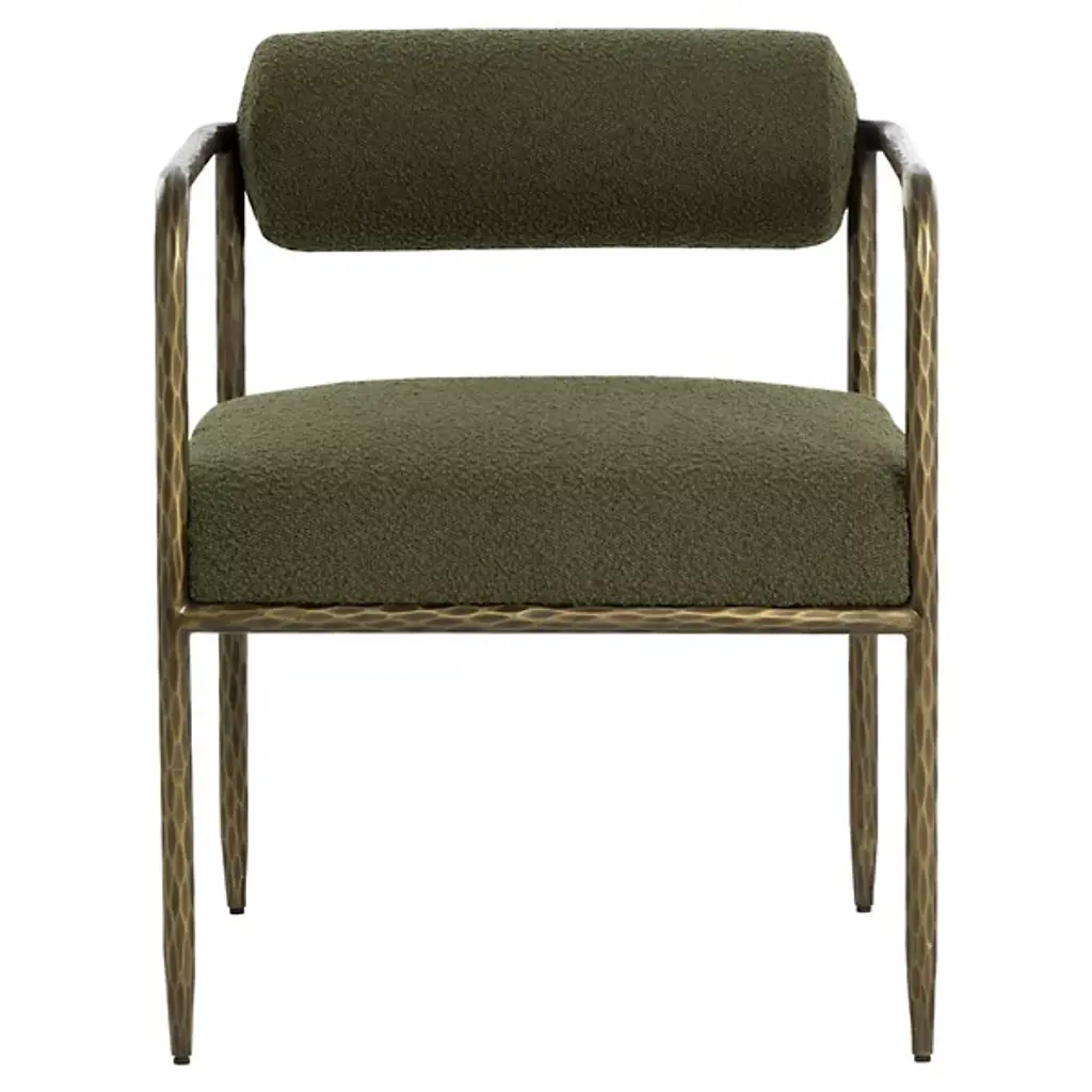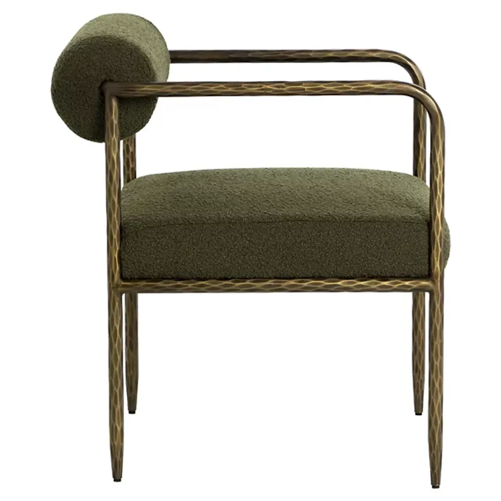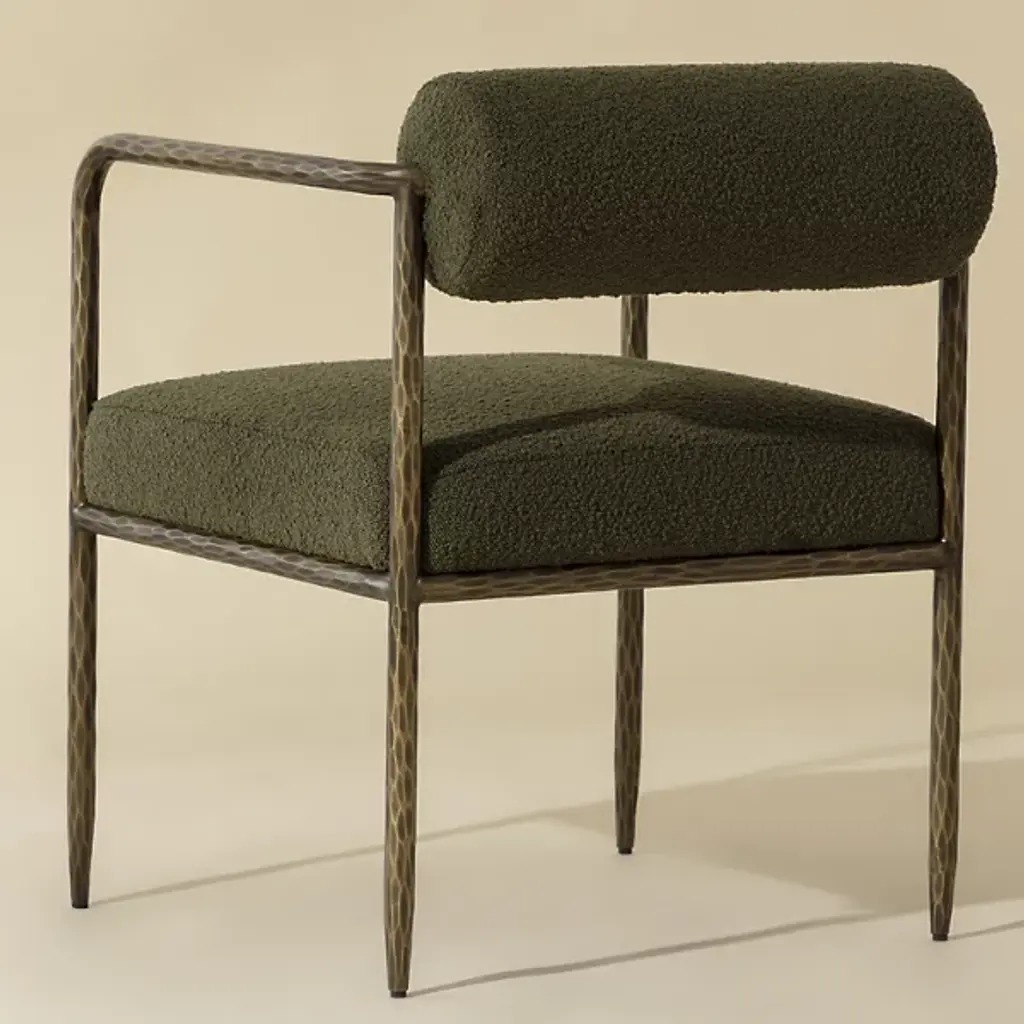 The Ajani Dining Armchair from Sunpan matches artisanal craftsmanship with refined comfort. Its hand-hammered iron frame features a unique, textured finish, while the comfortable upholstery and cylindrical bolster back offer a stylish yet supportive touch. Each cushion is filled with foam and fiber for lasting comfort, and each chair is handcrafted in India, presenting distinct markings and variations. Customizable with adjustable levelers and a retro-modern flair, this one-of-a-kind piece enhances any dining experience with timeless sophistication.