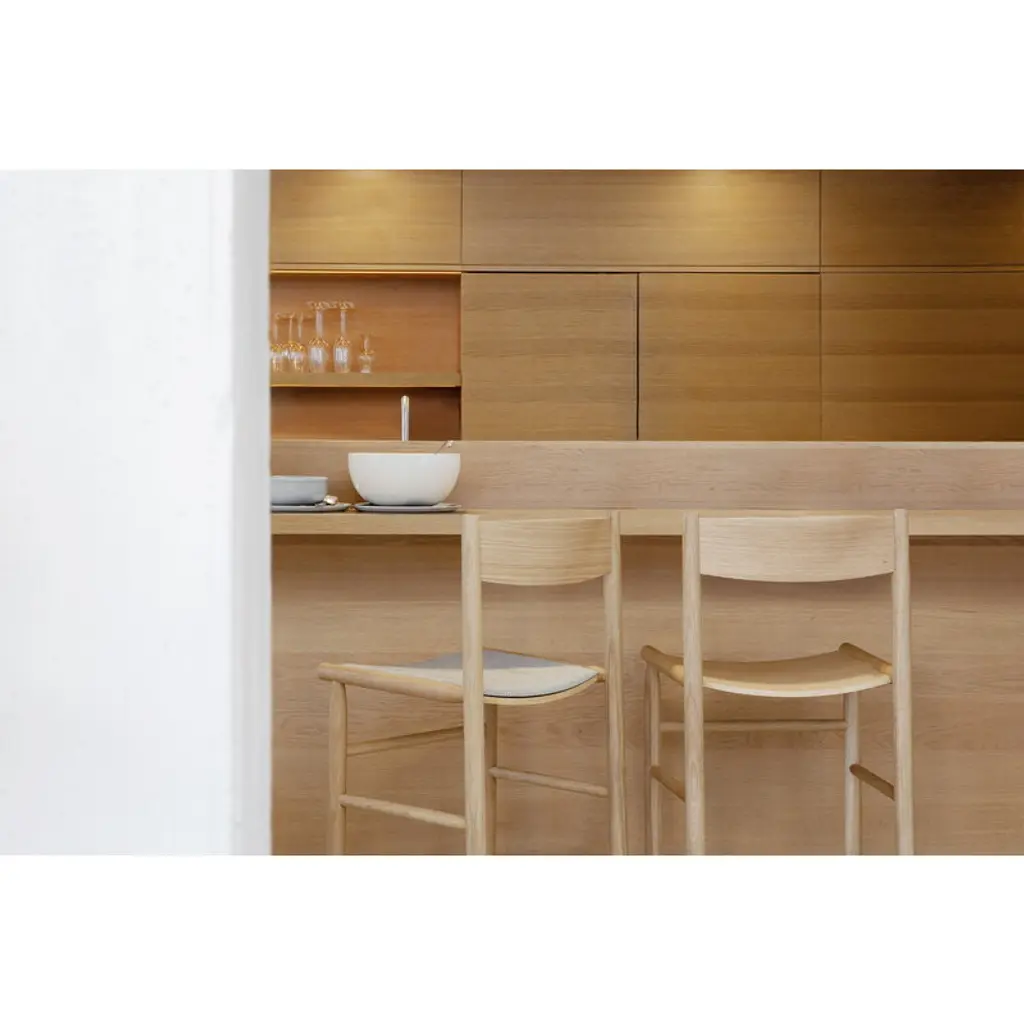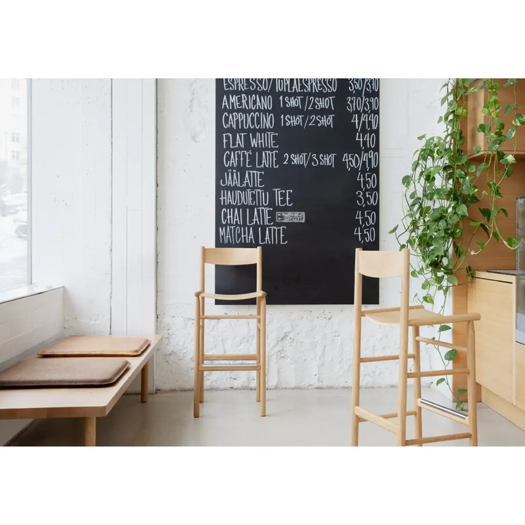 The Akademia High bar chair by Nikari is a harmonious and refined wooden chair designed by Wesley Walters and Salla Luhtasela, also known as Studio Kaksikko. The balanced and organic appeal of the Akademia bar chair draws from Scandinavian design heritage, Japanese esthetics, and the simple, honest Shaker style. Characterized by softly rounded shapes, Akademia High offers the same level of comfort as the dining chair from the series, making it ideal for use in homes, restaurants, hotels and offices alike. As its name suggests, the Akademia chair has academic origins, resulting from Wesley Walters' Master's thesis at Aalto University in Helsinki. Nikari products are made in Finland using only certified wood.