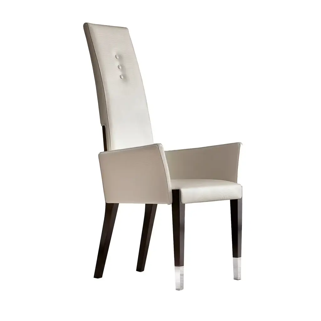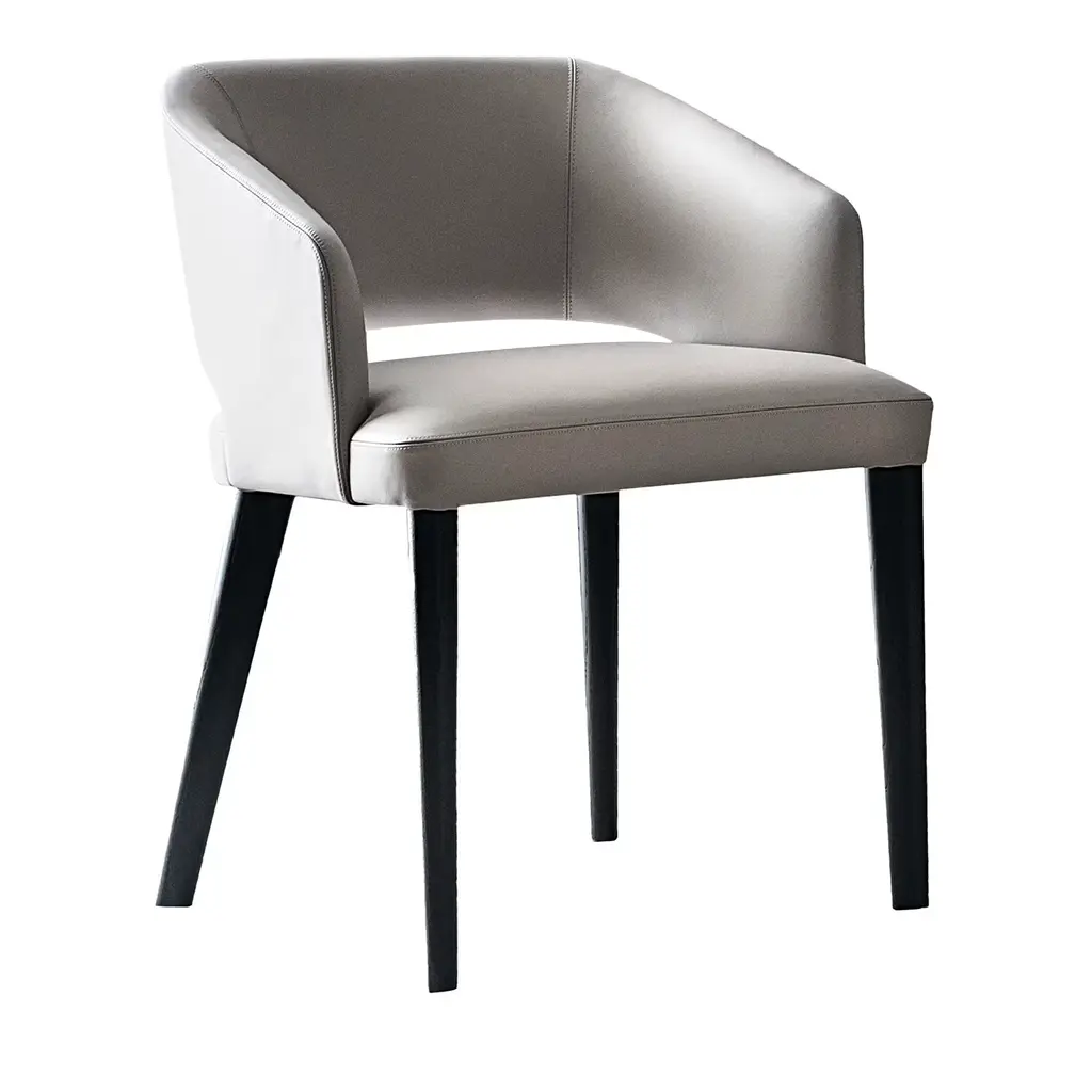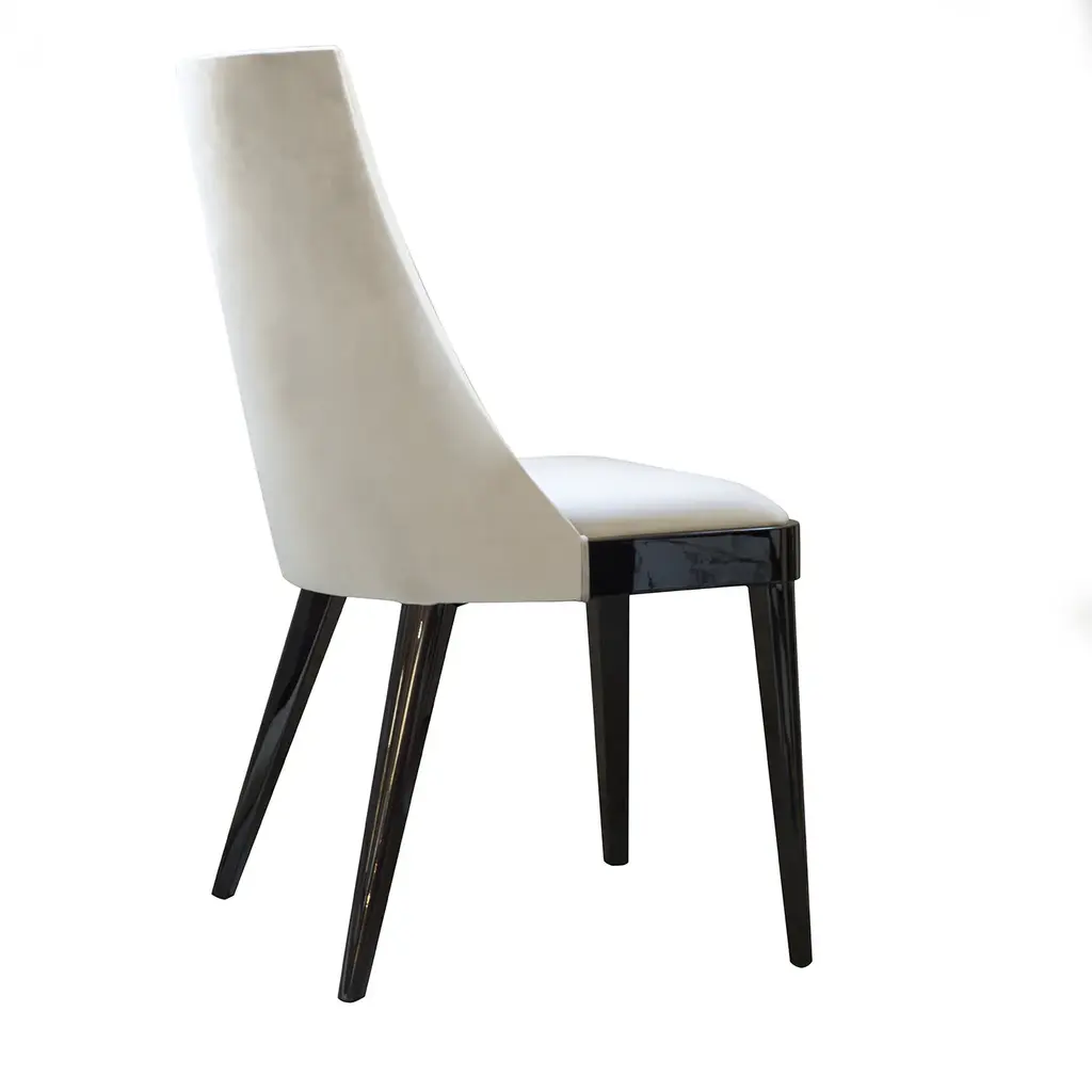 This refined chair is a testament to masterful craftsmanship and minimalist aesthetic that will effortlessly elevate any dining room decor. The sleek frame is crafted of solid beechwood, the glossy dark oak finish contrasting with the white cushion and back upholstery for a stunning look. The gracefully angled saber legs and slightly swooping back bring together design elements that allow for maximum comfort and elegance. Showcased in multiples either in a study flanking a side table or in a dining room, this chair will be an elegant finishing touch in any decor.