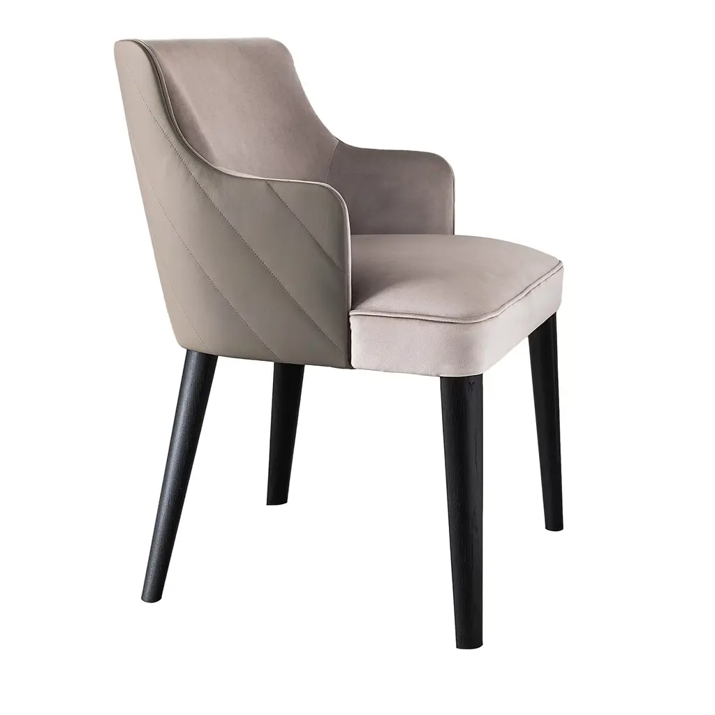 Also offered in a chair counterpart for sublime coordinated ensembles around dining tables, this armchair belongs to the graceful Alchemy Collection. Tapered legs in a stylish, two-tone look coupling wood and dark-gray stainless steel sustain the padded seating unit, where armrests seamlessly extend from the rounded, slightly curved backrest offering impeccable comfort.