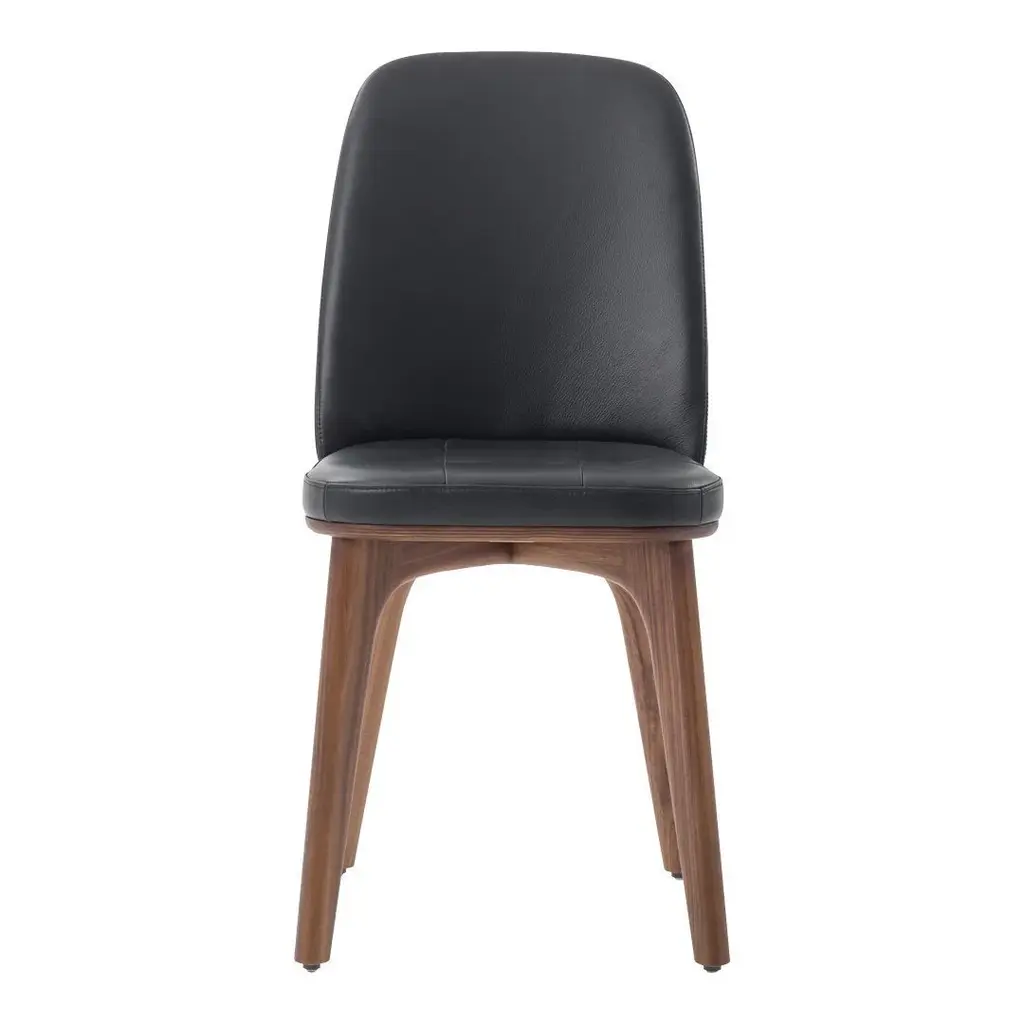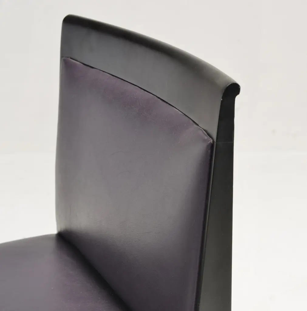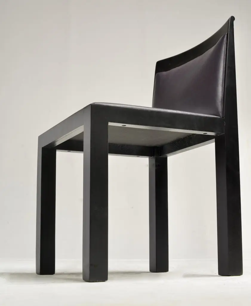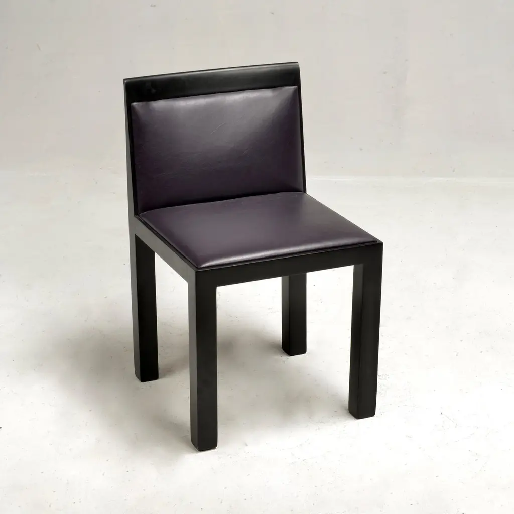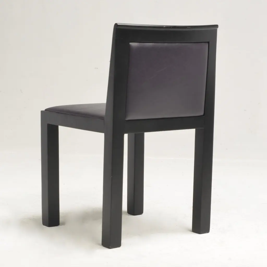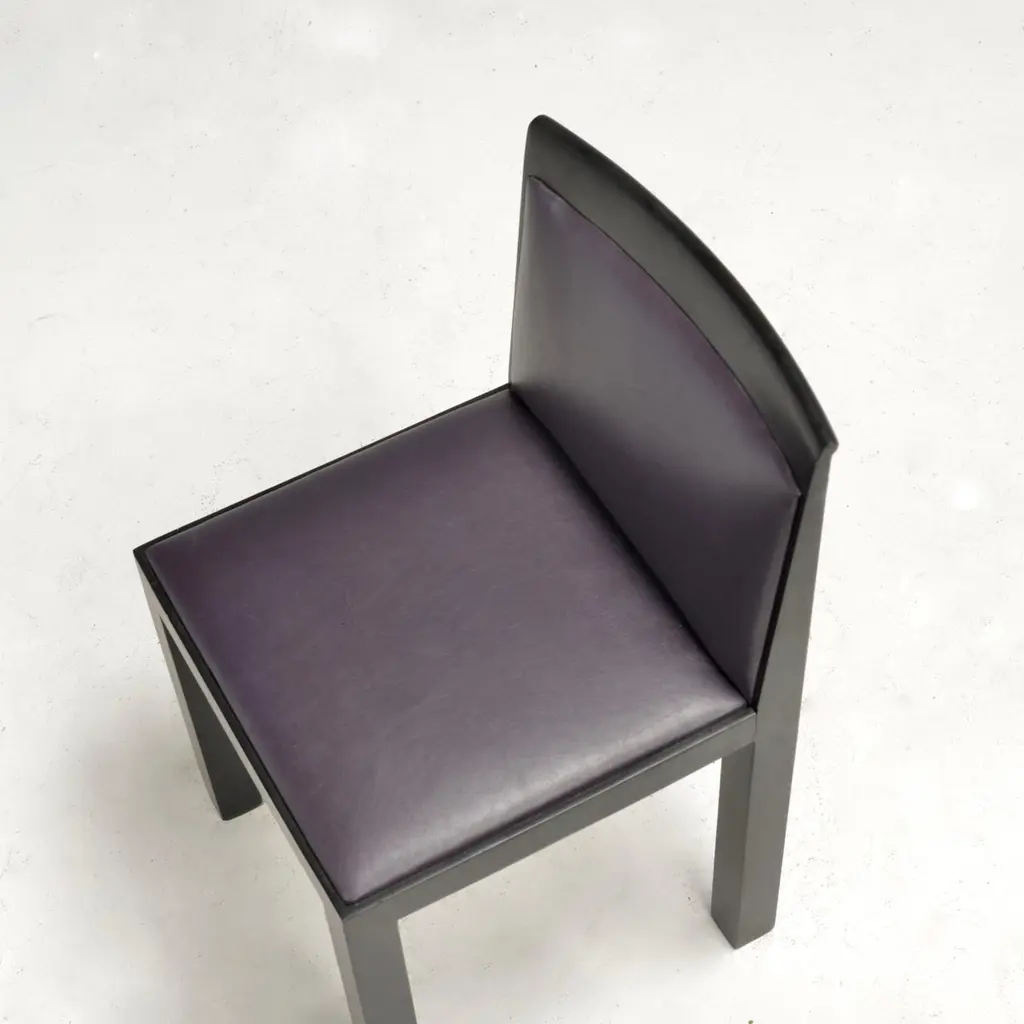 Post-Modern 'Teatro' side chairs in solid beech wood designed by architect Aldo Rossi and Luca Meda and manufactured by Italian furniture company Molteni circa 1980s. These beautiful and timeless chairs feature a minimalist, geometric design with leather upholstery and black lacquer finish. We have 12 of these chairs available in black, reupholstery in other fabrics/leather and custom lacquer finishes available upon request. Price is per chair. Aldo Rossi (1931 - 1997), a leading exponent of the postmodern movement, was an Italian architect and designer who achieved international recognition in four distinct areas: architectural theory, drawing, design, and product design.