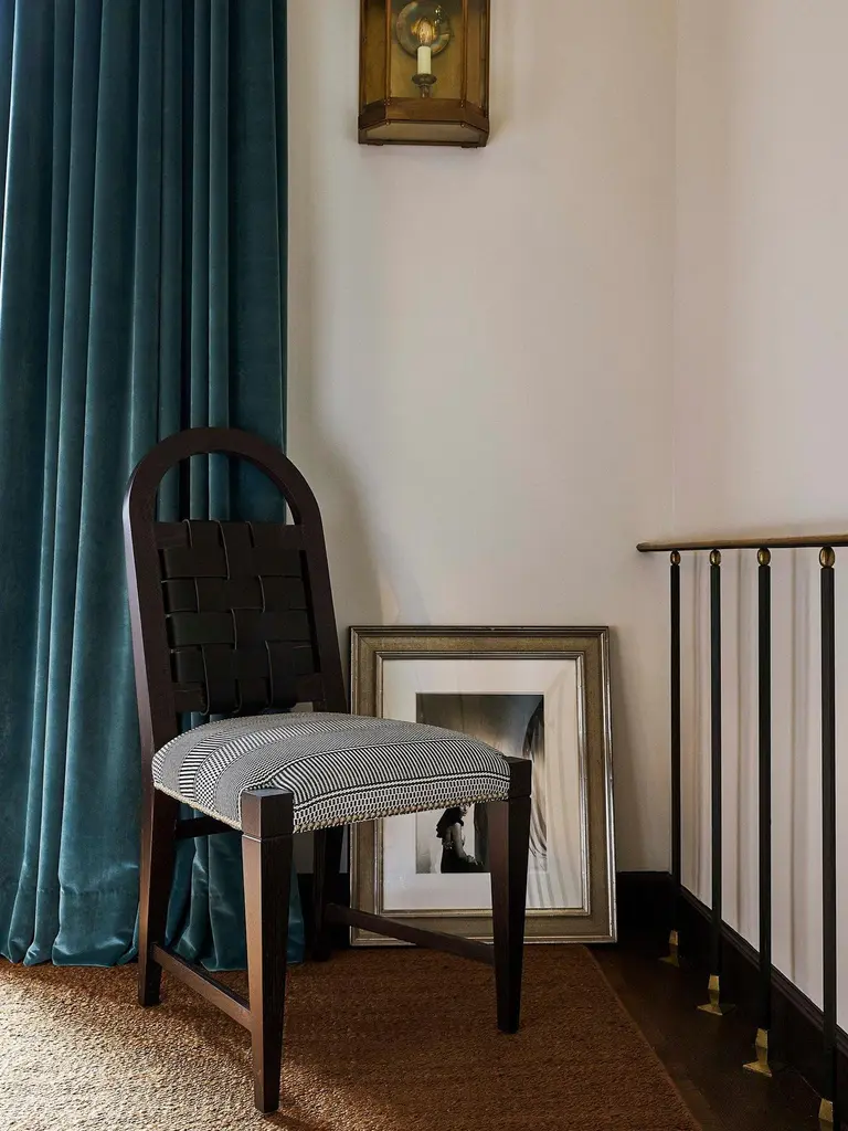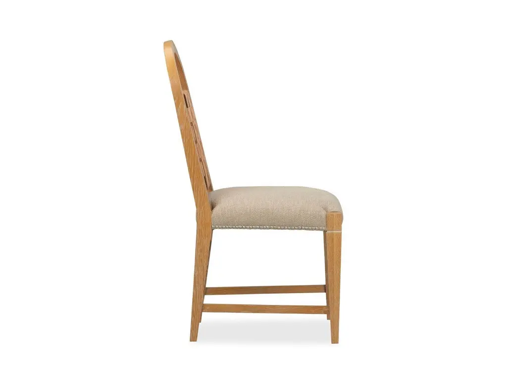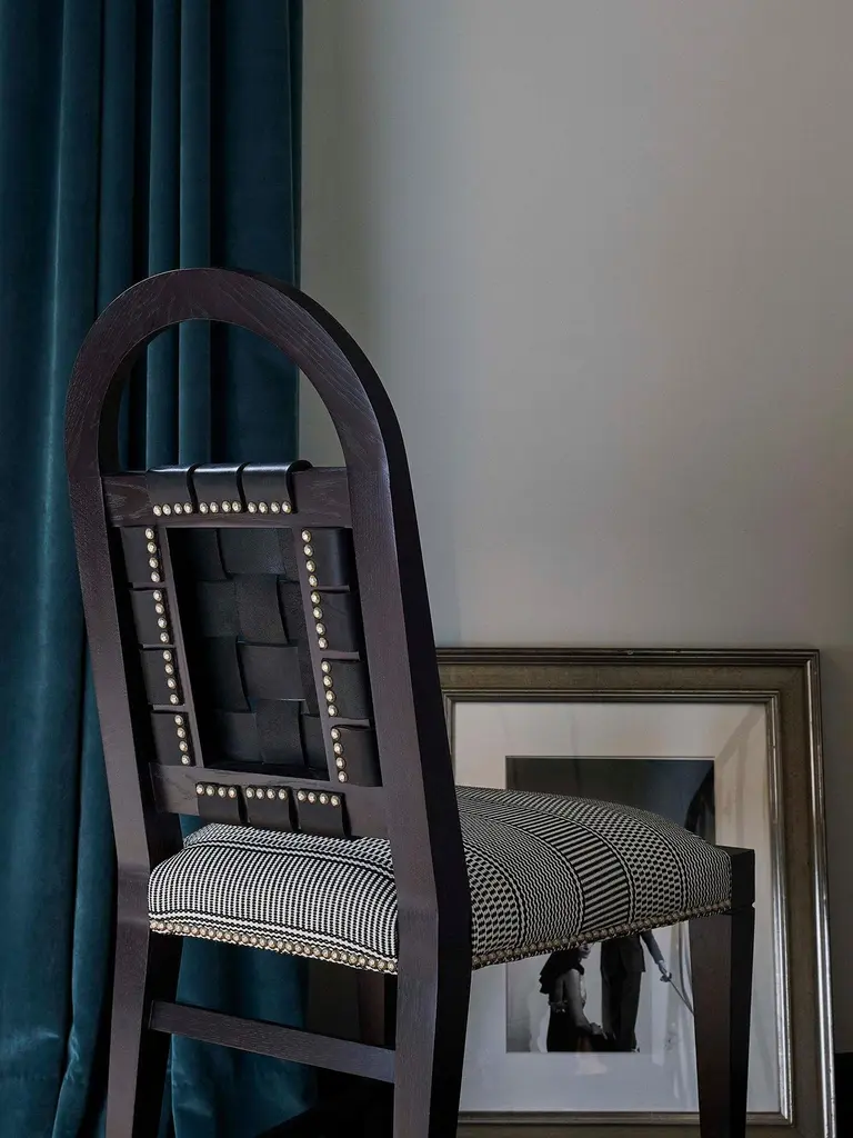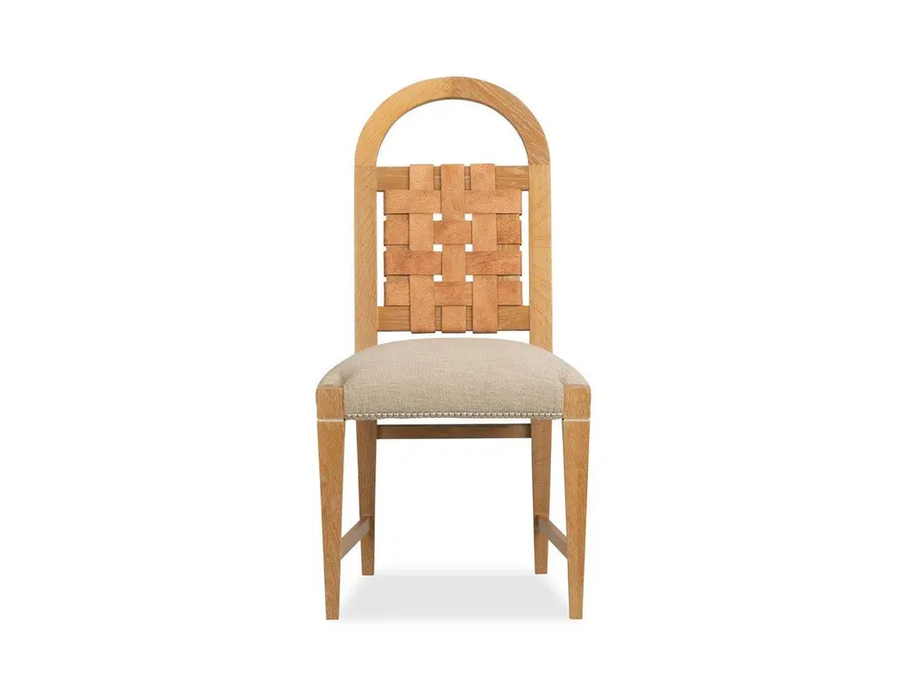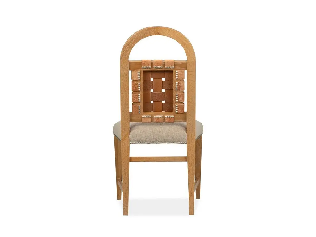 The distinctive arched back of this supremely comfortable dining chair provides a convenient handle to move the chair, and frames a panel of woven suede belting leather making a bold focal point. Hand-applied nailheads, a traditional upholstered seat, and graceful tapered legs give the chair a refined Arts & Crafts appearance.- Brown or Black Leather Available- Available in all Alfredo Paredes Upholstery and FinishesDimension Details:Seat Height 19.3”Seat Width 17.5”