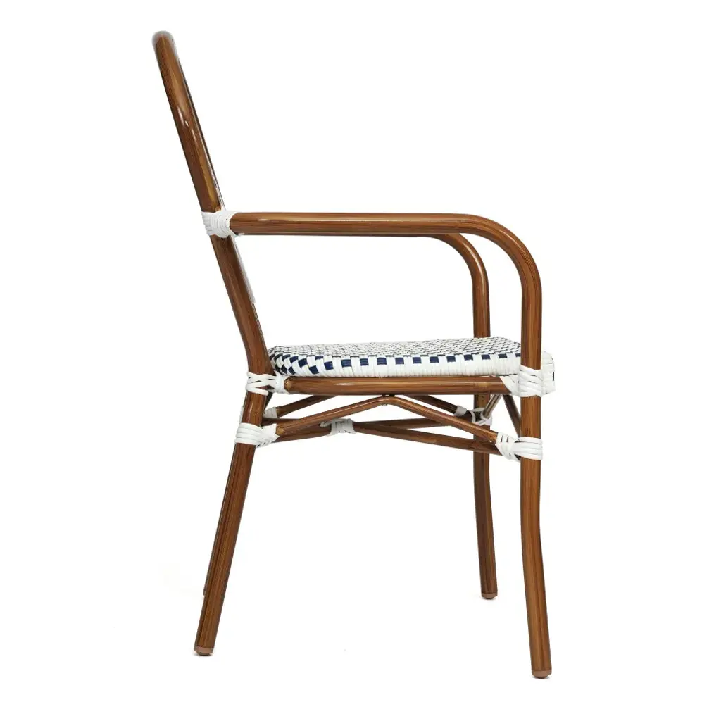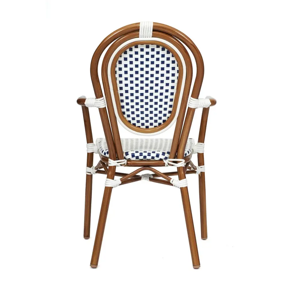 Bring the street vibes of Paris right into your restaurant, bistro, hotel, or backyard patio with this indoor/outdoor commercial grade bistro chair. The durable PE rattan Thonet-style back and seat are very comfortable and won't fade when used outdoors. The lightweight, but sturdy, powder coated metal frame boasts a black finish, holds up to 400 lbs. static weight, and will not rust. Recommended stack height for this chair is up to 5 high for storage or transport. Two curved arms deliver additional comfort and structure. For your convenience, this chair arrives completely assembled for instant use and features floor protector glides to prevent damage to indoor hard flooring surfaces. This dining chair easily wipes clean with a damp cloth for quick seating turnaround.Classic Commercial Grade Indoor/Outdoor Bistro ChairFade Resistant PE Rattan Thonet-Style Back and SeatMetal Frame Will Not RustHolds up to 400 LBS. Static Weight CapacityFixed Floor Glides Protect Indoor Flooring SurfacesRecommended Stacking Quantity is 5 Chairs HighNo Assembly RequiredWipes Clean with a Damp Cloth
