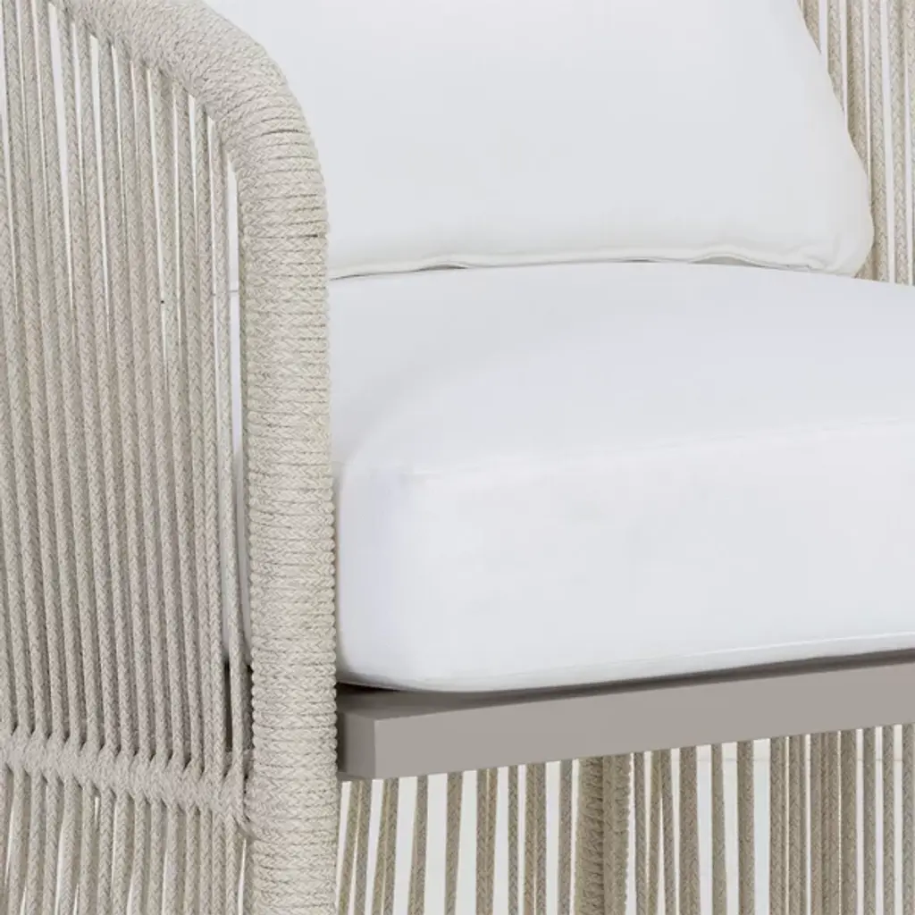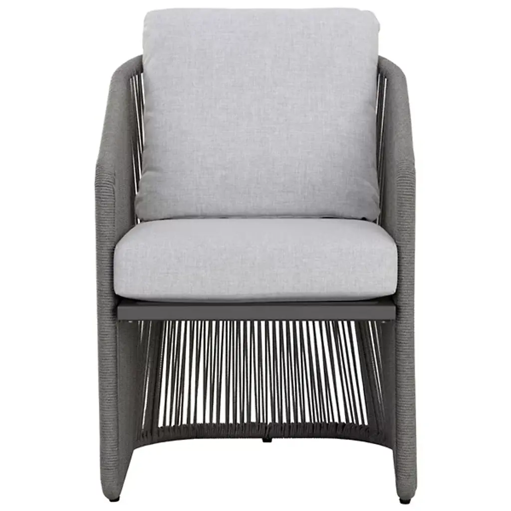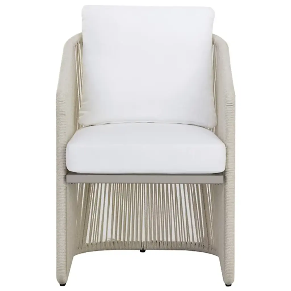 The Allariz Outdoor Dining Armchair from Sunpan combines durability with ingenious design. The aluminum frame undergoes powder coating for exceptional weather resistance, while the Olefin fabric, certified Oeko-tex safe, withstands intense UV exposure. Handwoven rope details create airy vertical patterns, complementing the quick-dry foam cushions that provide superior comfort. Perfect for patios and poolside settings, this chair features smart design elements that perform in outdoor environments.