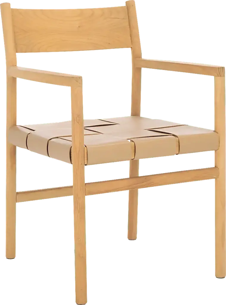This Allercam natural arm chair brings modern luxury to your dining space with its sleek brown finish and beautifully woven top grain leather. Crafted from solid Sungkay wood for lasting durability, its unique texture and elegant silhouette offer both comfort and style. Customer assembly required.