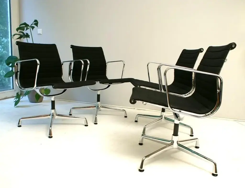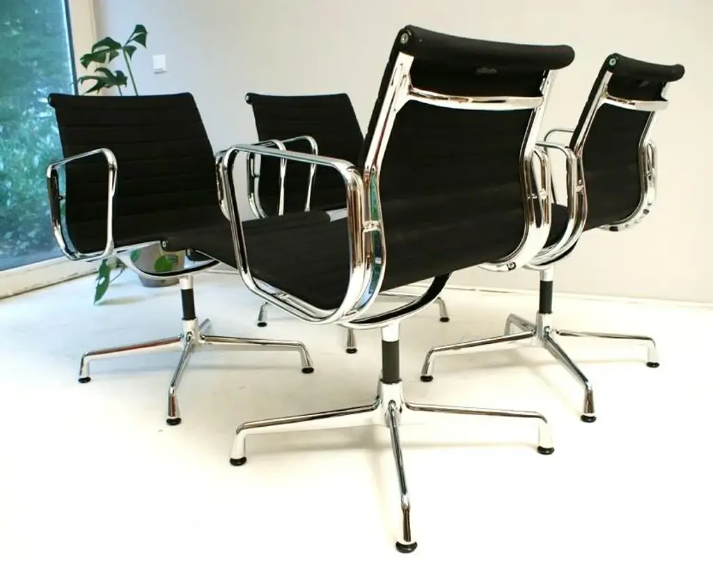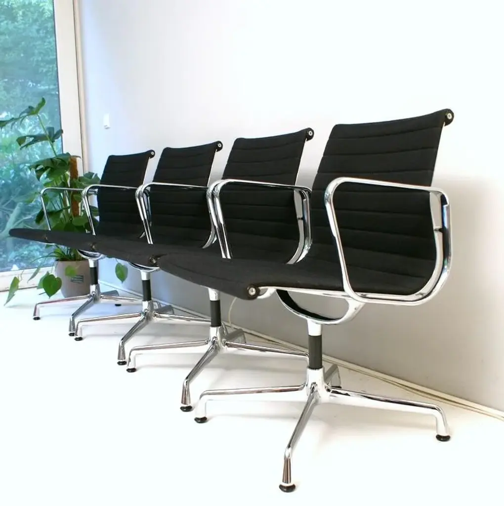For sale are four original vitra aluminum chairs ea 108 in the version with black hopsak cover - a design classic by charles & ray eames from 1958. • manufacturer: vitra • designers: charles & ray eames • model: ea 108 • version: rotatable with four-star base • frame & armrests: die-cast aluminum, chrome-plated • cover: hopsak, color black • dimensions (approx.): 83 × 58 × 59 cm (h × w × d) • original vitra with label the chairs are in good original condition. They were used as meeting chairs in a corporation and have been maintained accordingly. the aluminum chair ea 108 is one of the most important furniture designs of the 20th century. Its special construction is characterized by the clever combination of aluminum profiles and the freely stretched cover, which not only characterizes the look but is also a load-bearing element. This means that the chair adapts optimally to the body - without any complex upholstery - and still offers the highest level of seating comfort. whether in the home office, at the dining table or in the conference room - this comfortable and stylish classic adapts effortlessly to any environment. Excellent workmanship, ergonomic comfort and iconic design make the eames alu chair a timeless investment. this piece has an attribution mark, i am sure that it is completely authentic and take full responsibility for any authenticity issues arising from misattribution