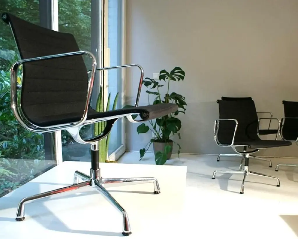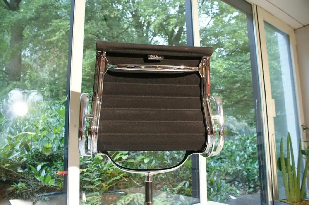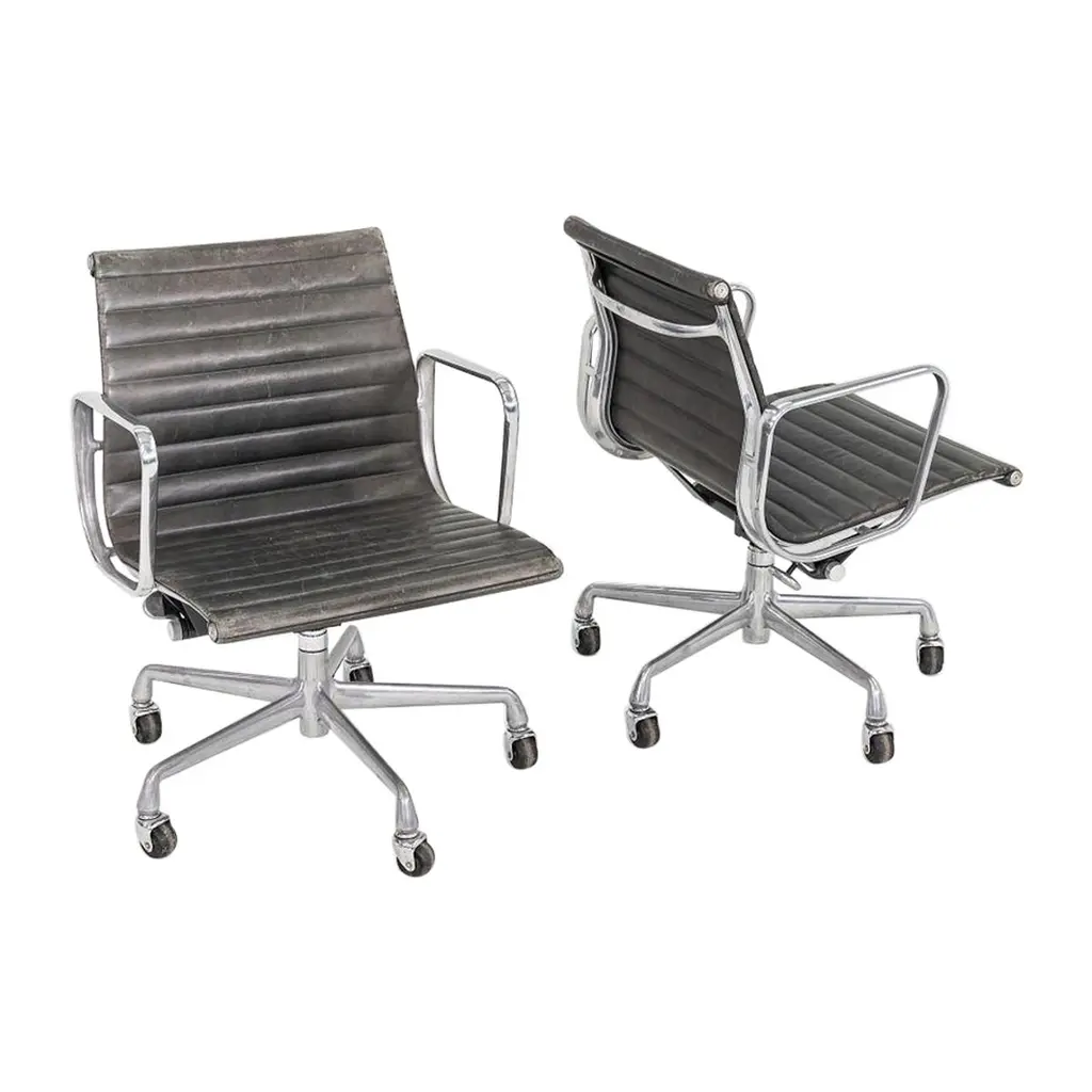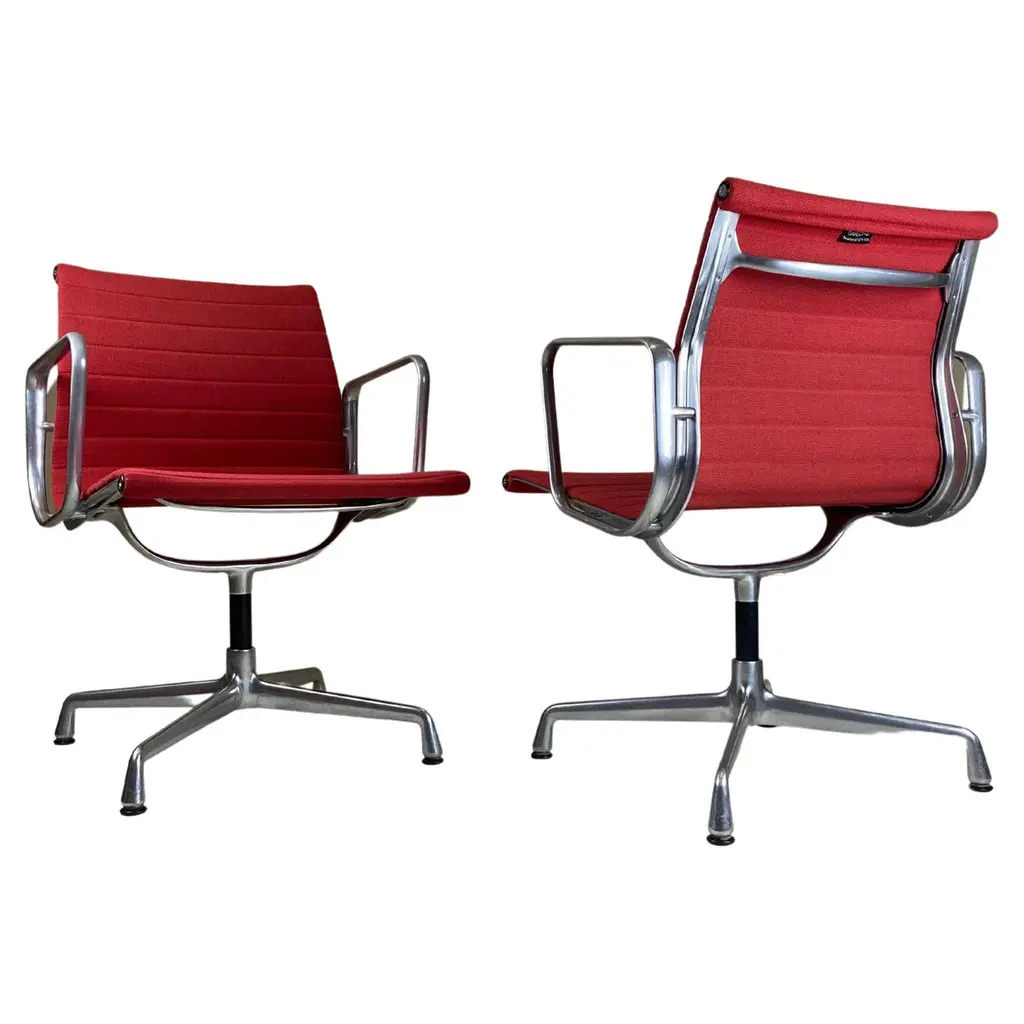 For sale are four original vitra aluminum chairs ea 108 in the version with black hopsak cover - a design classic by charles & ray eames from 1958. • manufacturer: vitra • designers: charles & ray eames • model: ea 108 • version: rotatable with four-star base • frame & armrests: die-cast aluminum, chrome-plated • cover: hopsak, color black • dimensions (approx.): 83 × 58 × 59 cm (h × w × d) • original vitra with label the chairs are in good original condition. They were used as meeting chairs in a corporation and have been maintained accordingly. the aluminum chair ea 108 is one of the most important furniture designs of the 20th century. Its special construction is characterized by the clever combination of aluminum profiles and the freely stretched cover, which not only characterizes the look but is also a load-bearing element. This means that the chair adapts optimally to the body - without any complex upholstery - and still offers the highest level of seating comfort. whether in the home office, at the dining table or in the conference room - this comfortable and stylish classic adapts effortlessly to any environment. Excellent workmanship, ergonomic comfort and iconic design make the eames alu chair a timeless investment. this piece has an attribution mark, i am sure that it is completely authentic and take full responsibility for any authenticity issues arising from misattribution