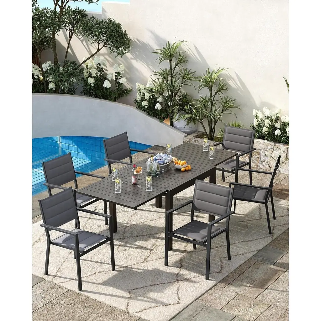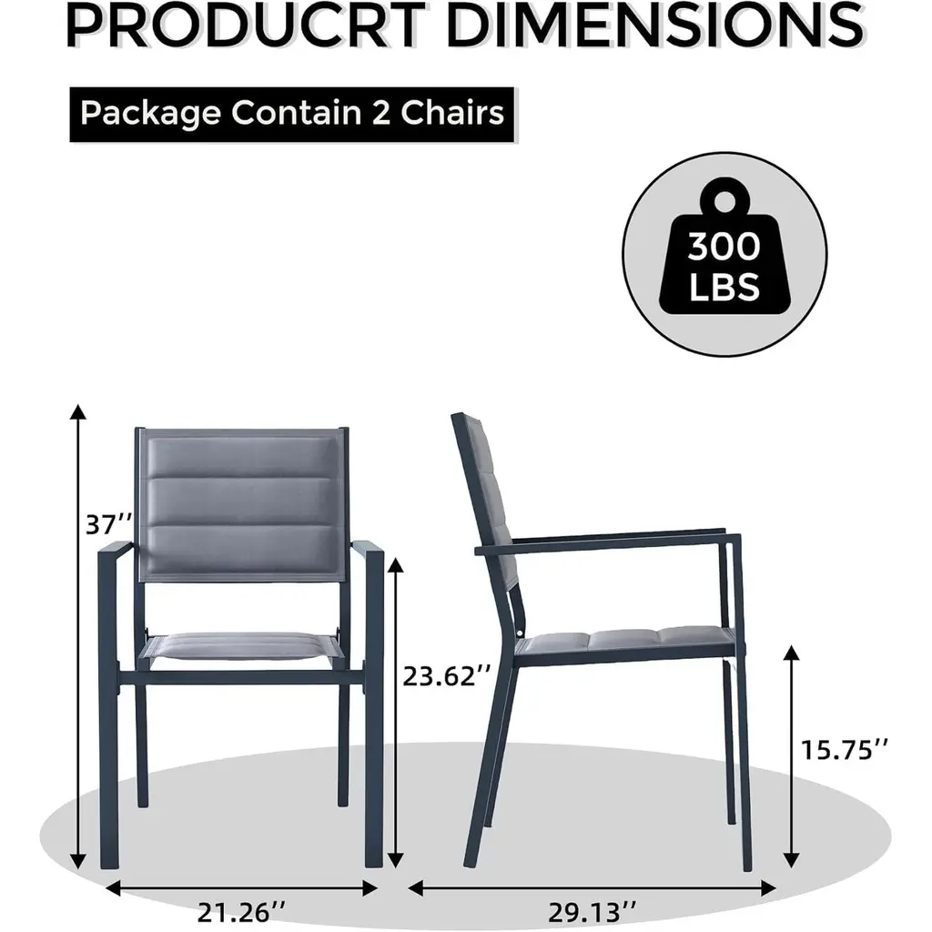 Sleek Modern Aesthetic: With a stylish dark finish, these aluminum dining chairs add a contemporary touch to your outdoor decor, enhancing the overall ambiance of your space. Comfortable Textilene Fabric: Featuring breathable Textilene fabric, these chairs provide comfort and support, allowing you to enjoy your outdoor dining experience to the fullest. Space-Saving Stackable Design: The stackable feature allows for easy storage and space-saving convenience, making these chairs perfect for patios, decks, and backyards. Durable Aluminum Construction: Crafted from high-quality aluminum, these dining chairs are designed to withstand the elements, ensuring long-lasting use in any outdoor setting. All-Weather Resistance: Built to endure various weather conditions, these chairs resist rust and fading, making them ideal for year-round outdoor use.