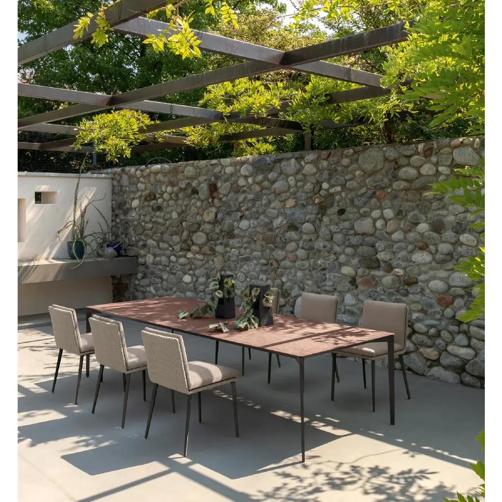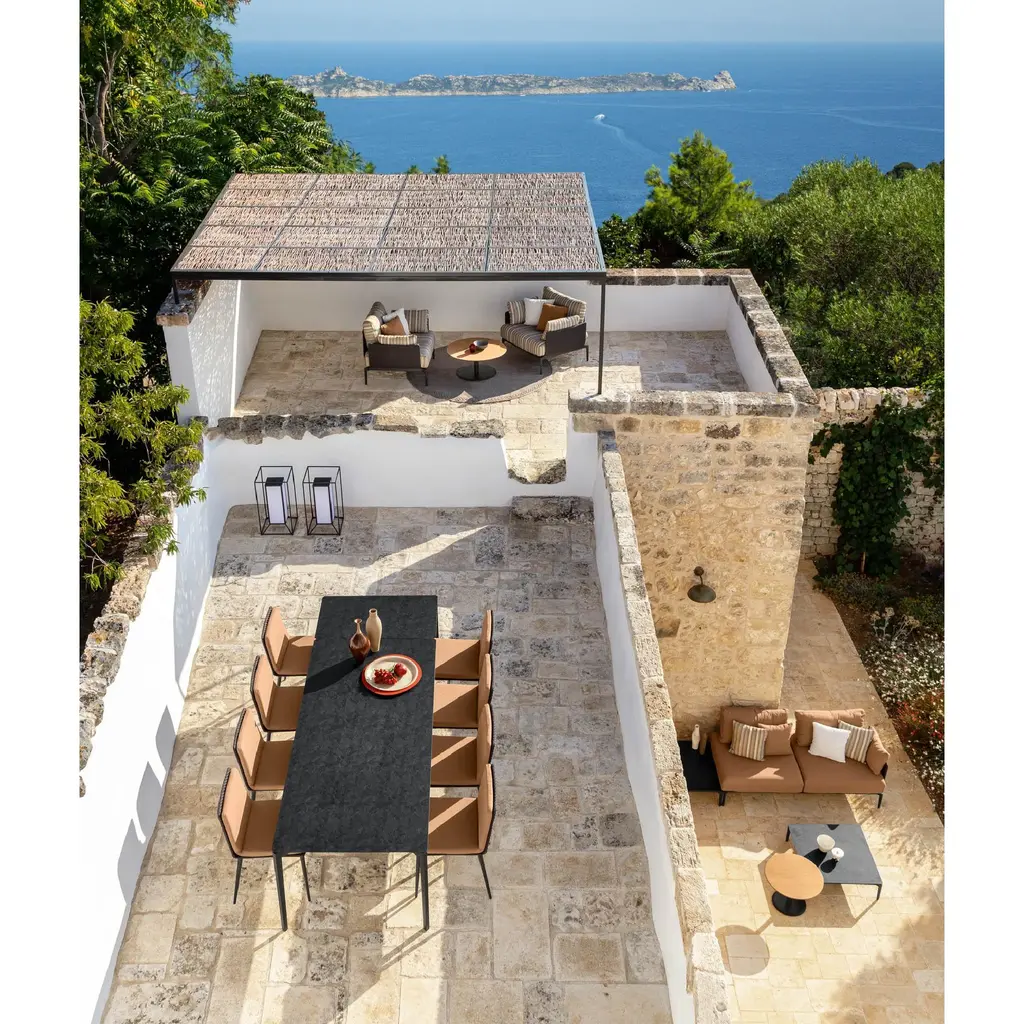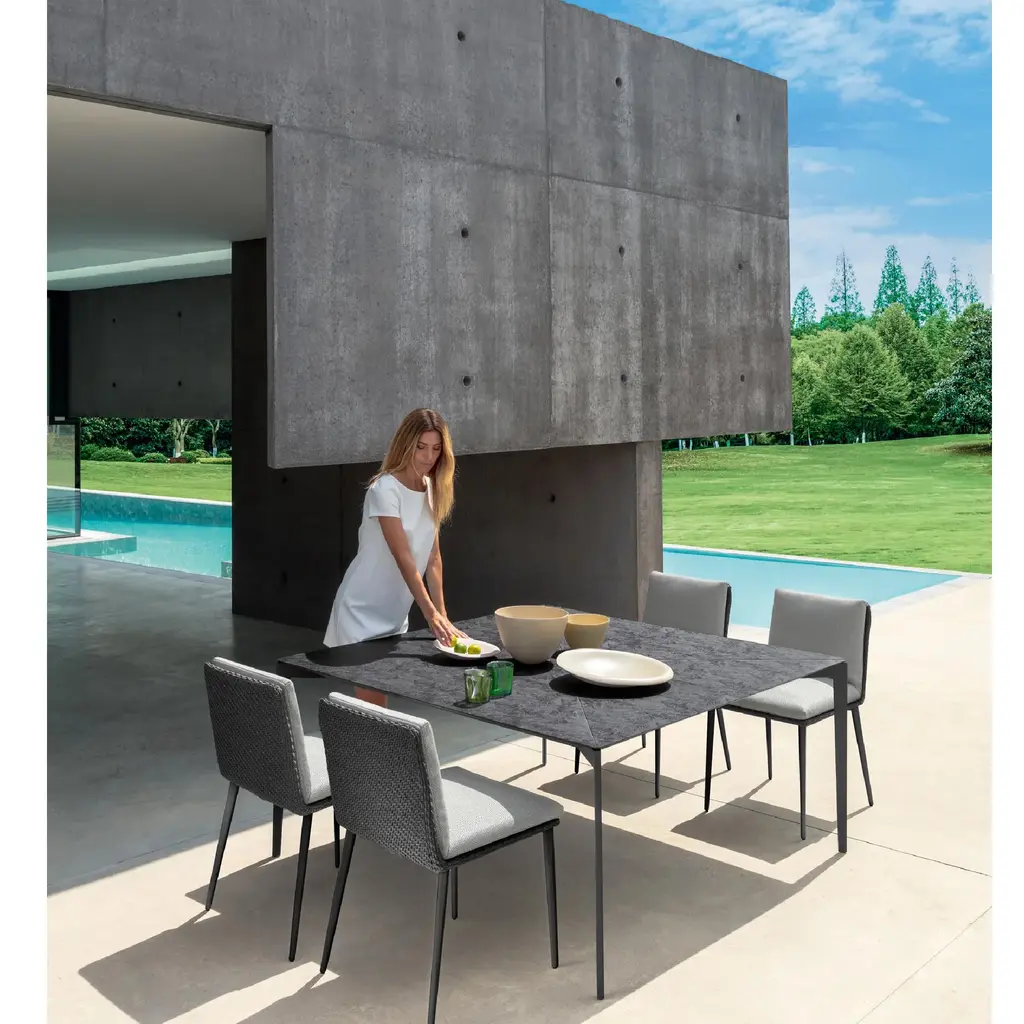The dining chair of the Leaf collection is characterised by elegant shapes and and slender lines. The soft seat, padded in quick foam, is upholstered in weatherproof fabric. The aluminium structure along with unique fabrics make the product in line with the design of the entire collection.