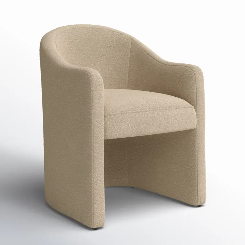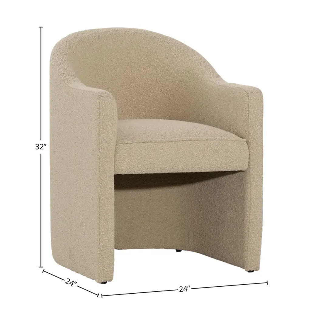 The Alvera Pine Upholstered Dining Chair features a combination of soft boucle upholstery and solid pine wood construction, ensuring both comfort and durability. This dining chair's elegant design and neutral color palette make it a versatile addition to any dining room, providing long-lasting use and a touch of sophistication to meal times.