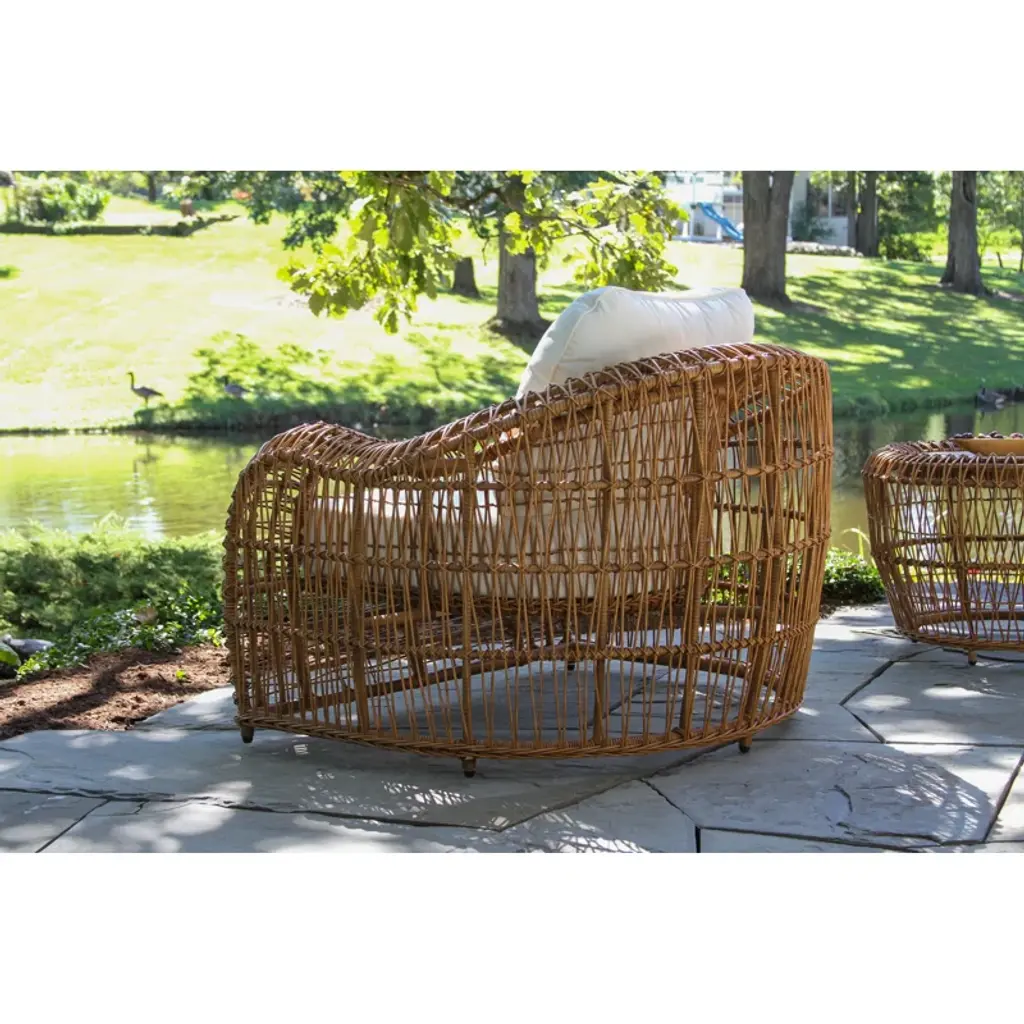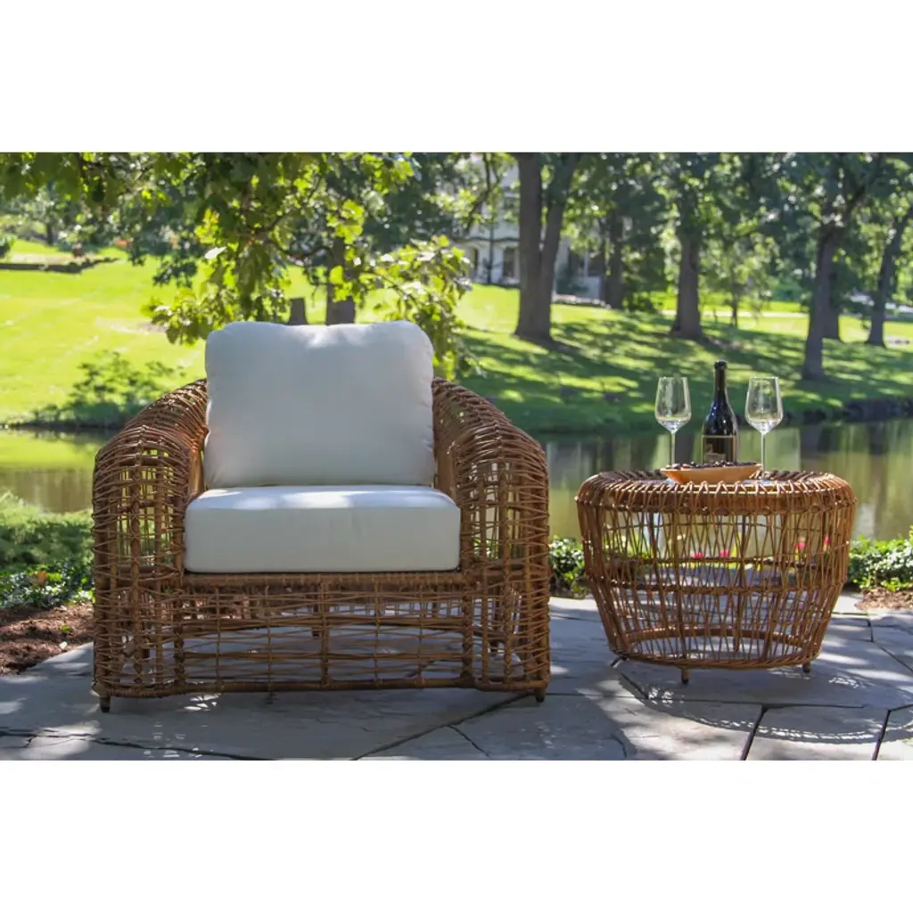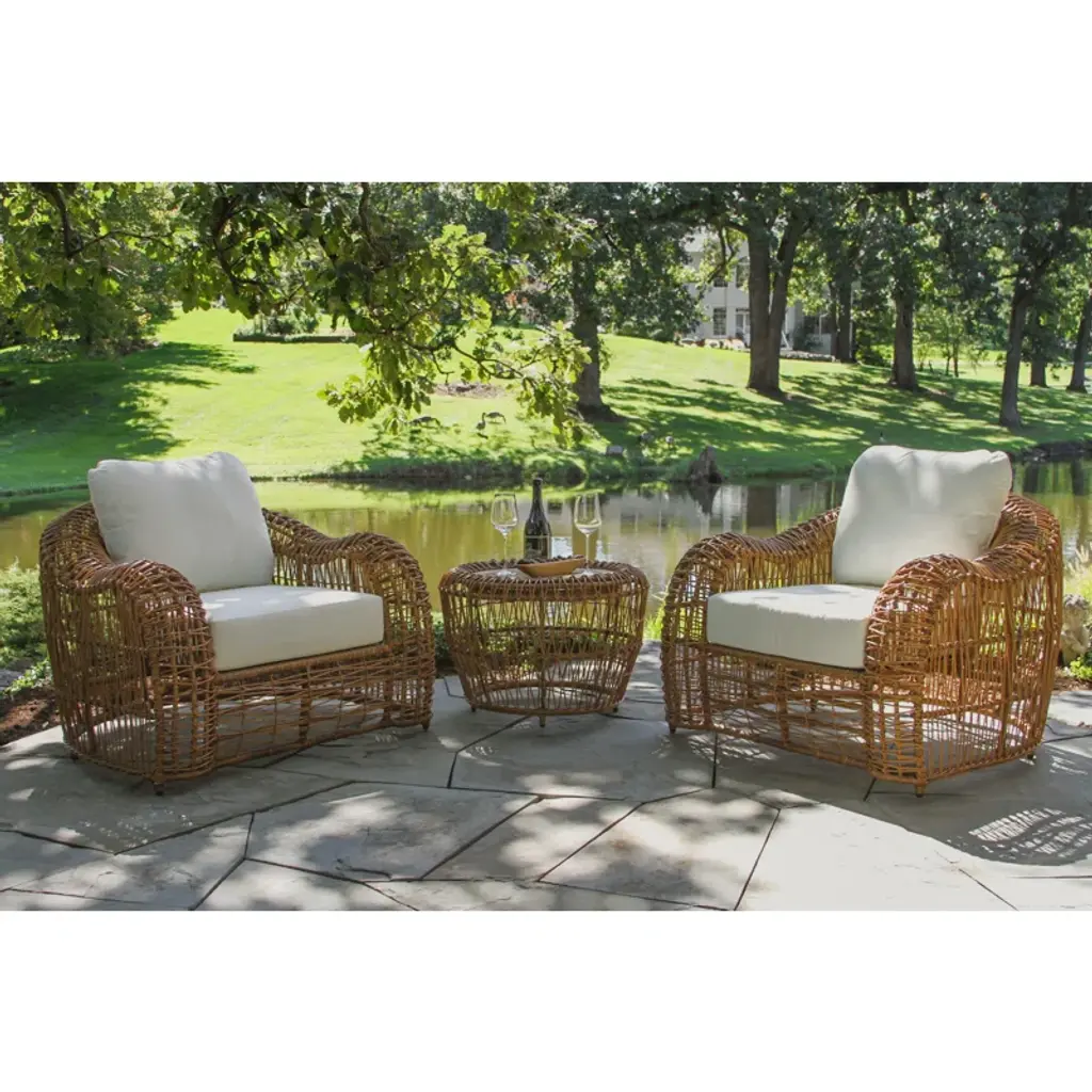 This piece brings the luxury vineyard-inspired look to any patio. Fashioned with handwoven butterscotch-colored wicker and a deep breezy aesthetic. The armchair is sold in packs of 2 and can be paired with the full set or with an accent table of your choice! The chairs come fully assembled. The HDPE all-weather wicker is handwoven around powder-coated aluminum frames and finished with Sunbrella fabrics.
