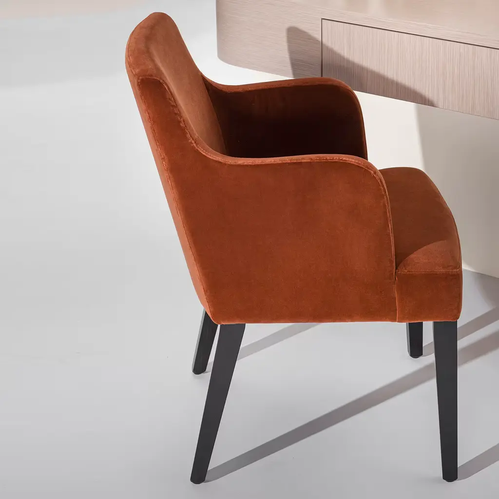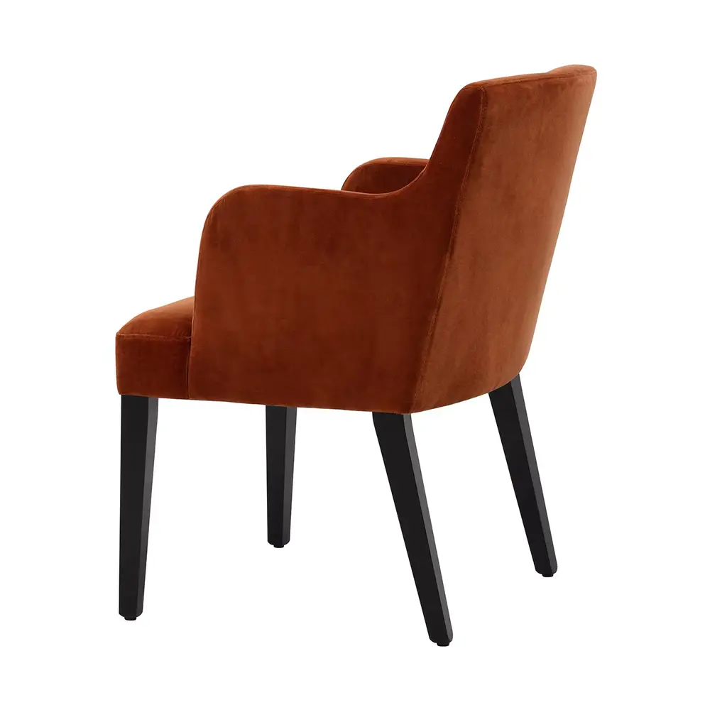 A timeless classic that will easily match any existing dining room set, this chic, mid-century Italian-inspired dining chair is perfect to use in pairs as host chairs at table ends or as a refined pull-up chair in a studio or living room. Featuring set-back arms and a generous seat (50cm height), this chair is constructed with a polyurethane-padded wooden frame upholstered in a brick-red velvet that complements the rich brown finish and copper undertones of the wengè-veneered legs. Nylon glides allow the chair to slide easily without damaging hardwood floors or carpeting. Contract and commercial certifications available upon request.