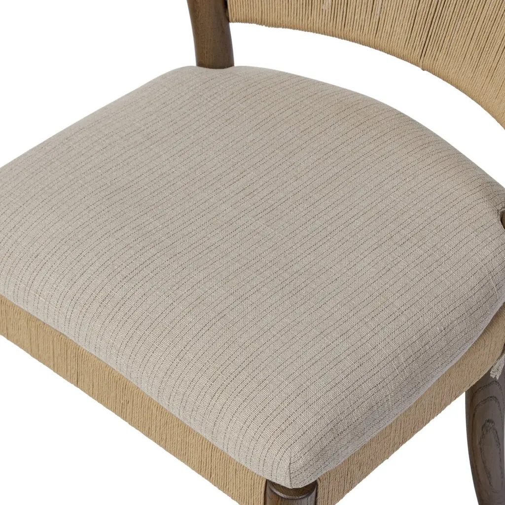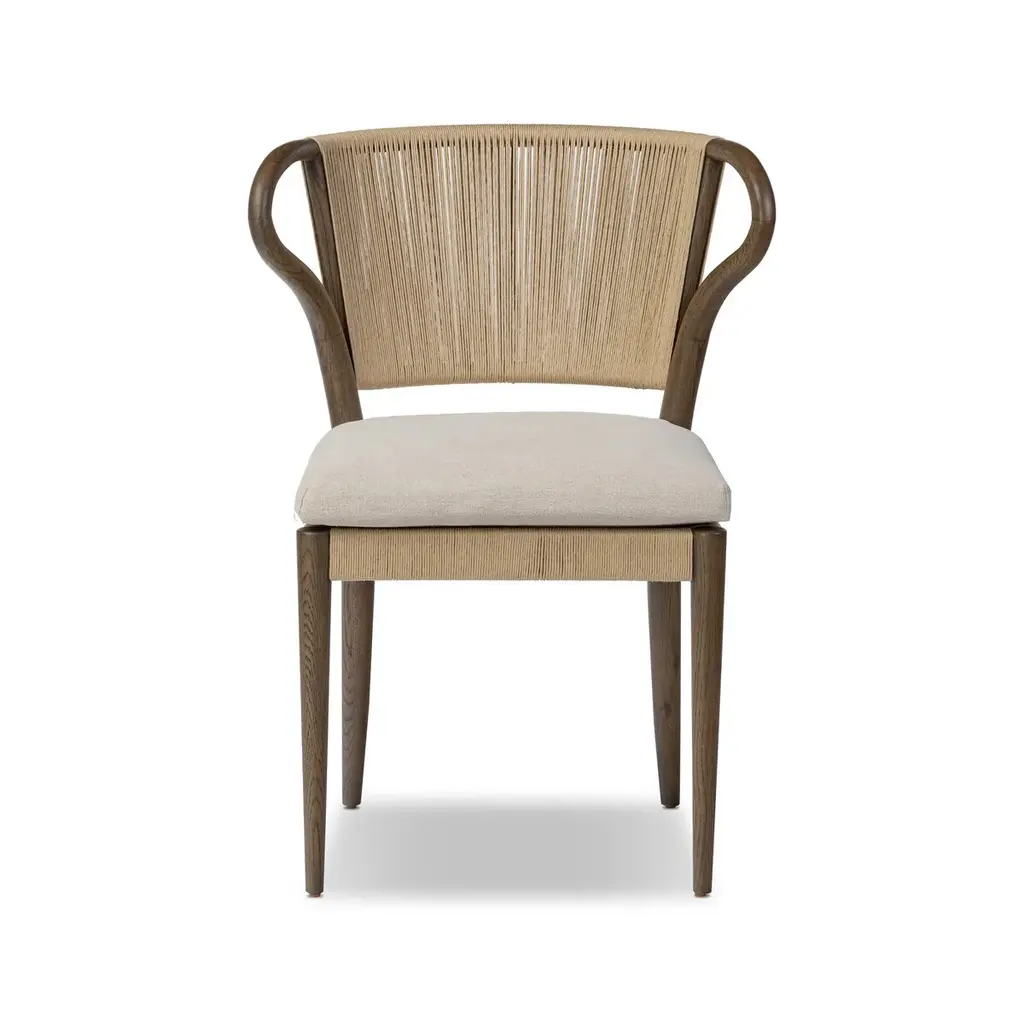 A subtle take on the traditional wingback style. This armless dining chair features organic shaping in its rich oak framing. Complemented by a natural rush back and seat, with a tie-back mahogany leather cushion for comfort. A design collaboration by Amber Lewis and Four Hands. This item has limited online distribution and may not be sold on websites without prior approval. Visit the FAQ page in our Help Center for more details.